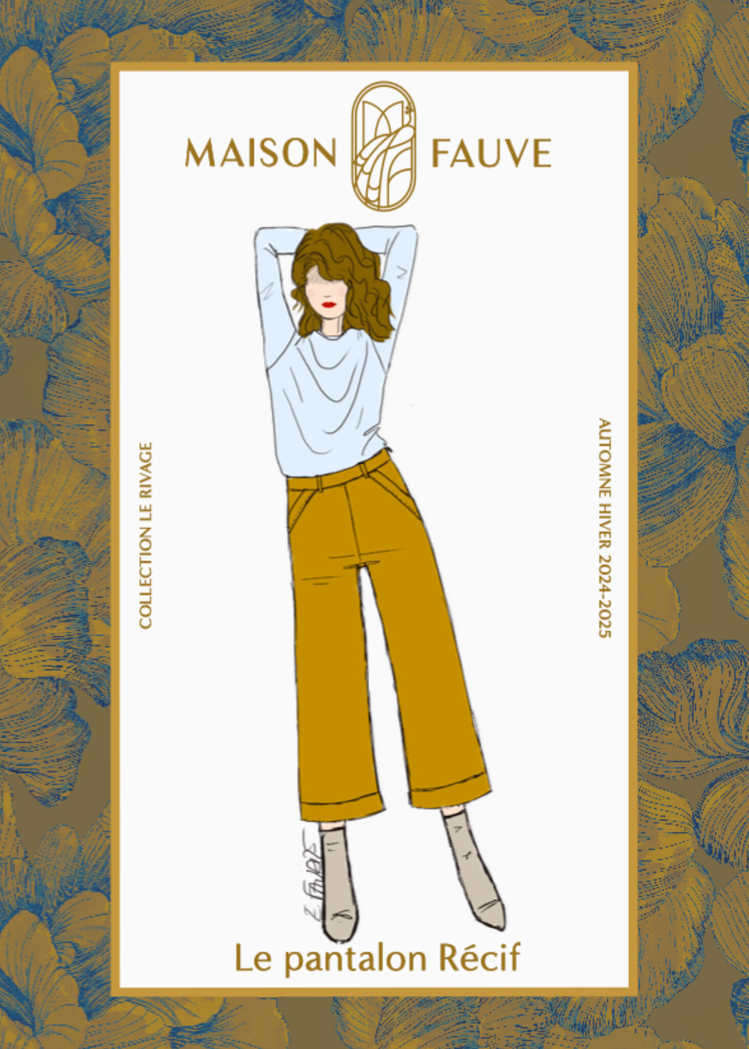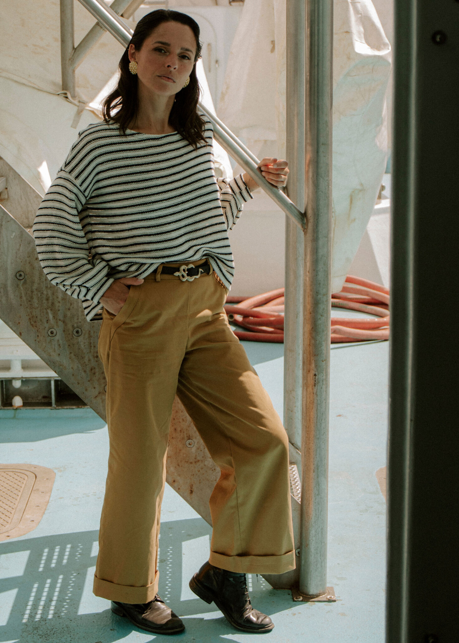The RÉCIF trousers adopt the sailor trousers to adapt them to everyday life: the waist is mid-rise and accentuated with a belt, the hips fit well and are closed with an invisible zip on the side. The leg widens and stops at the ankle, with a wide cuff.