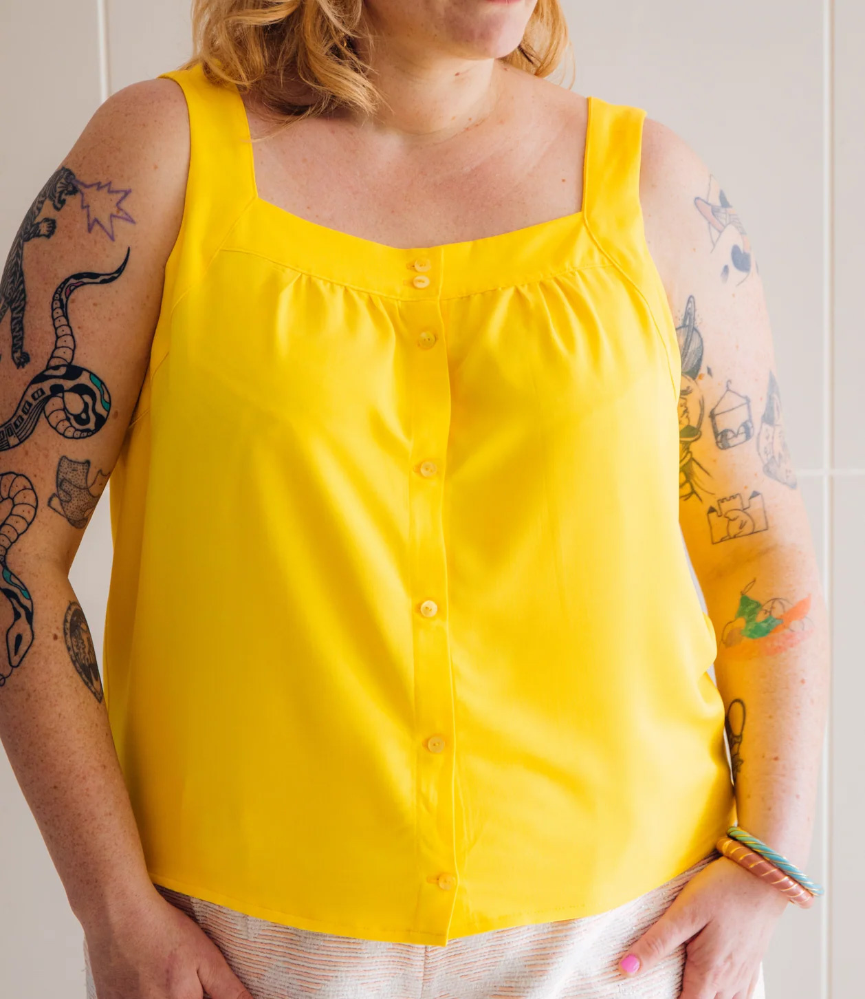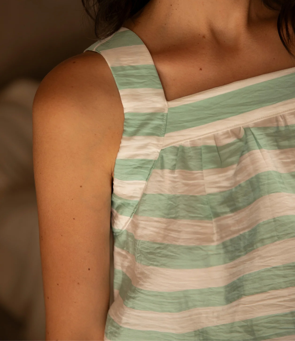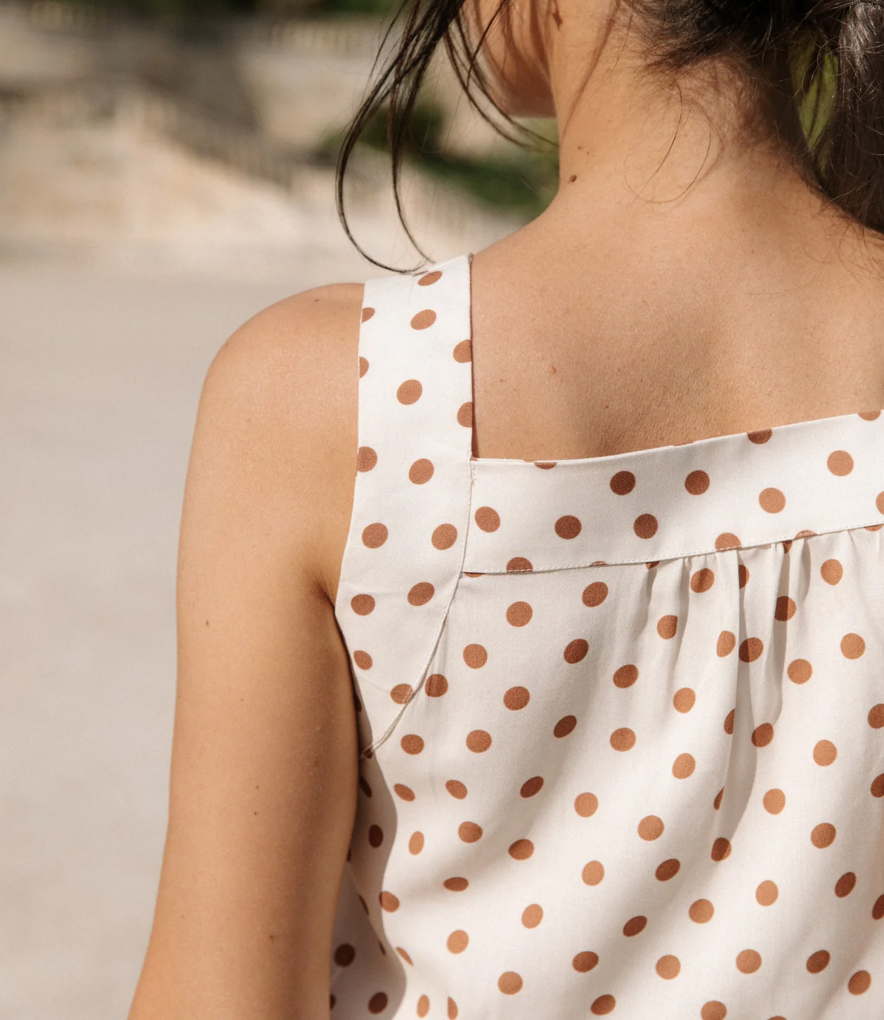 Fabric choice : soft and comfortable fabrics such as cotton or viscose poplin, a soft and supple jacquard, viscose crepe, twill, Tencel, but also lace or broderie anglaise. It is advisable to choose materials that are easy to iron, so that the straps are easier to handle.