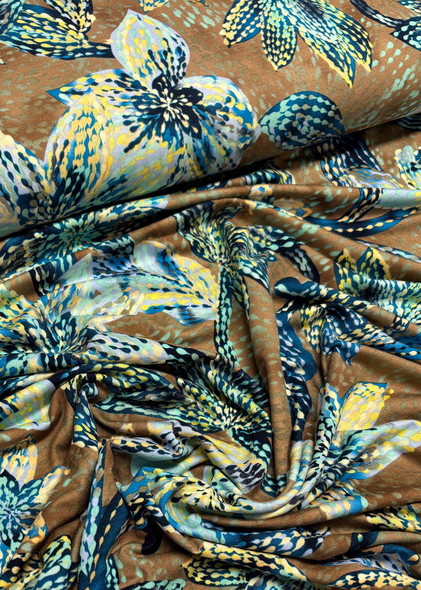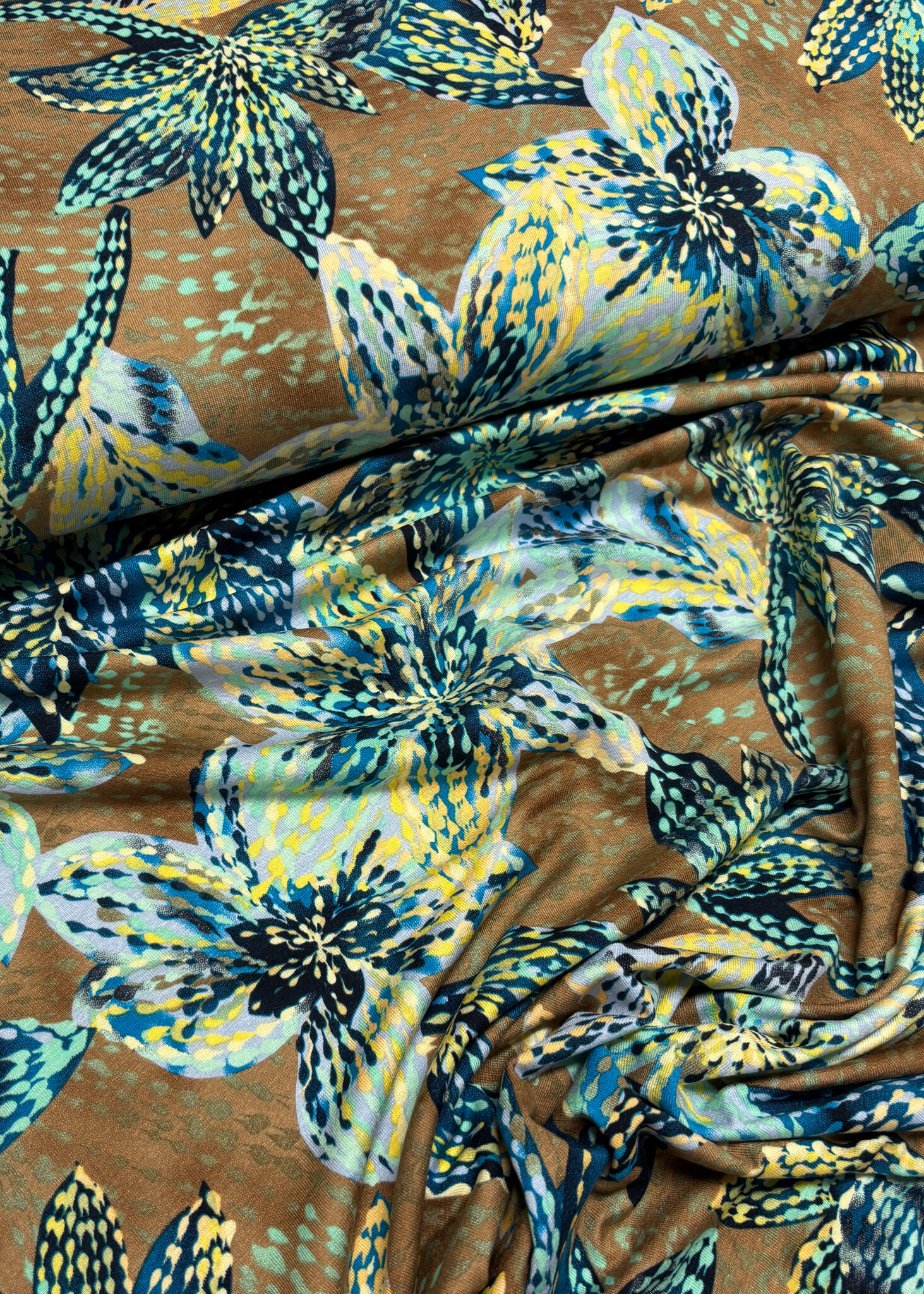 A fine viscose jersey with leaves. OEKO TEX. Soft and supple fabric, very suitable for T-shirts and sporty dresses for women.