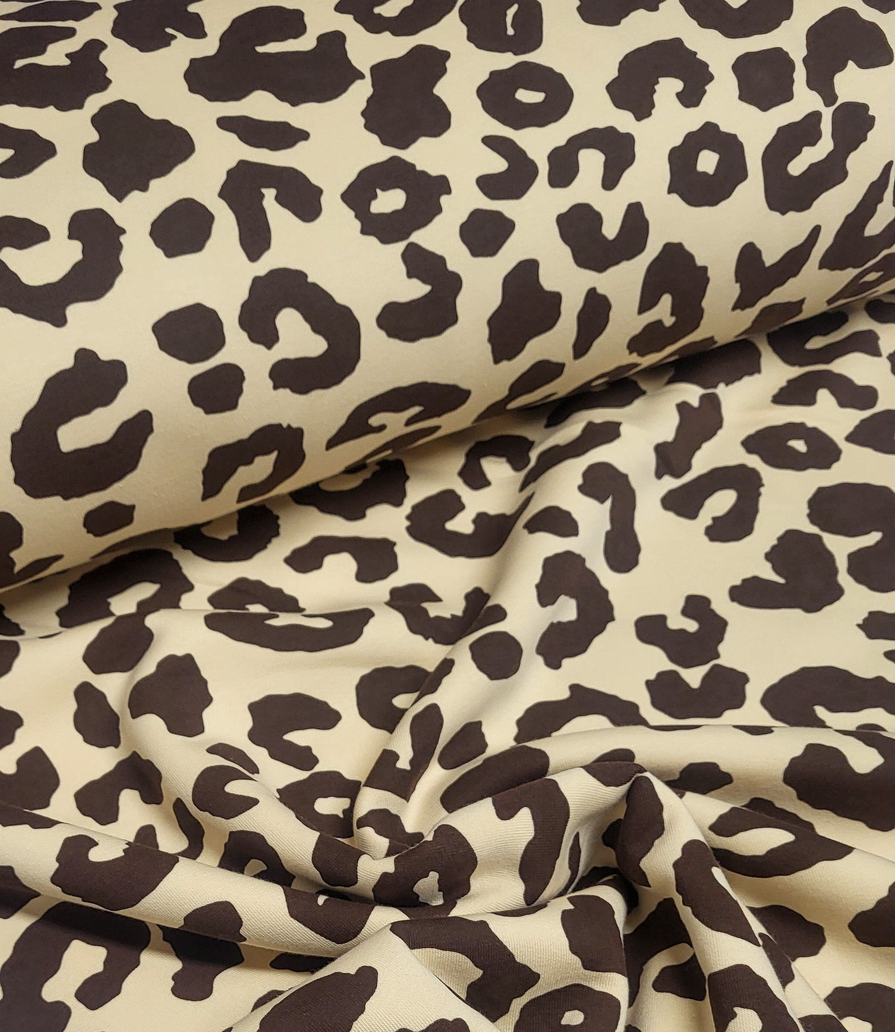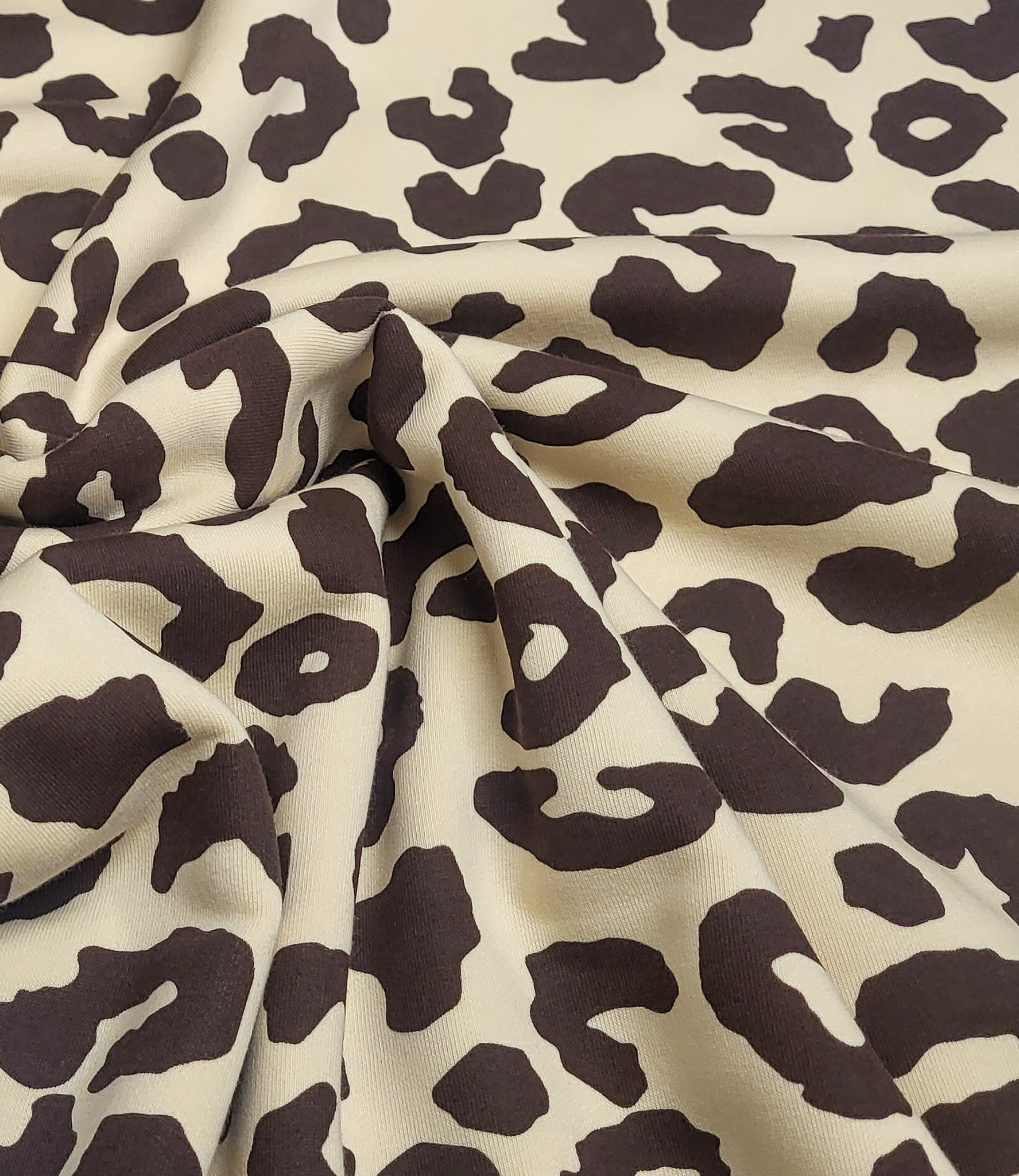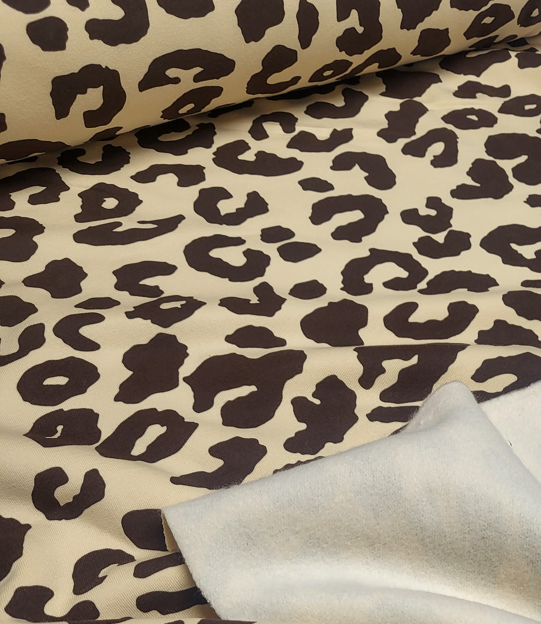 A very nice quality soft, brushed sweater with leopard print. Lovely warm and suitable for sweaters, pants, vests, dresses, etc. Lovely soft molton layer at the back.