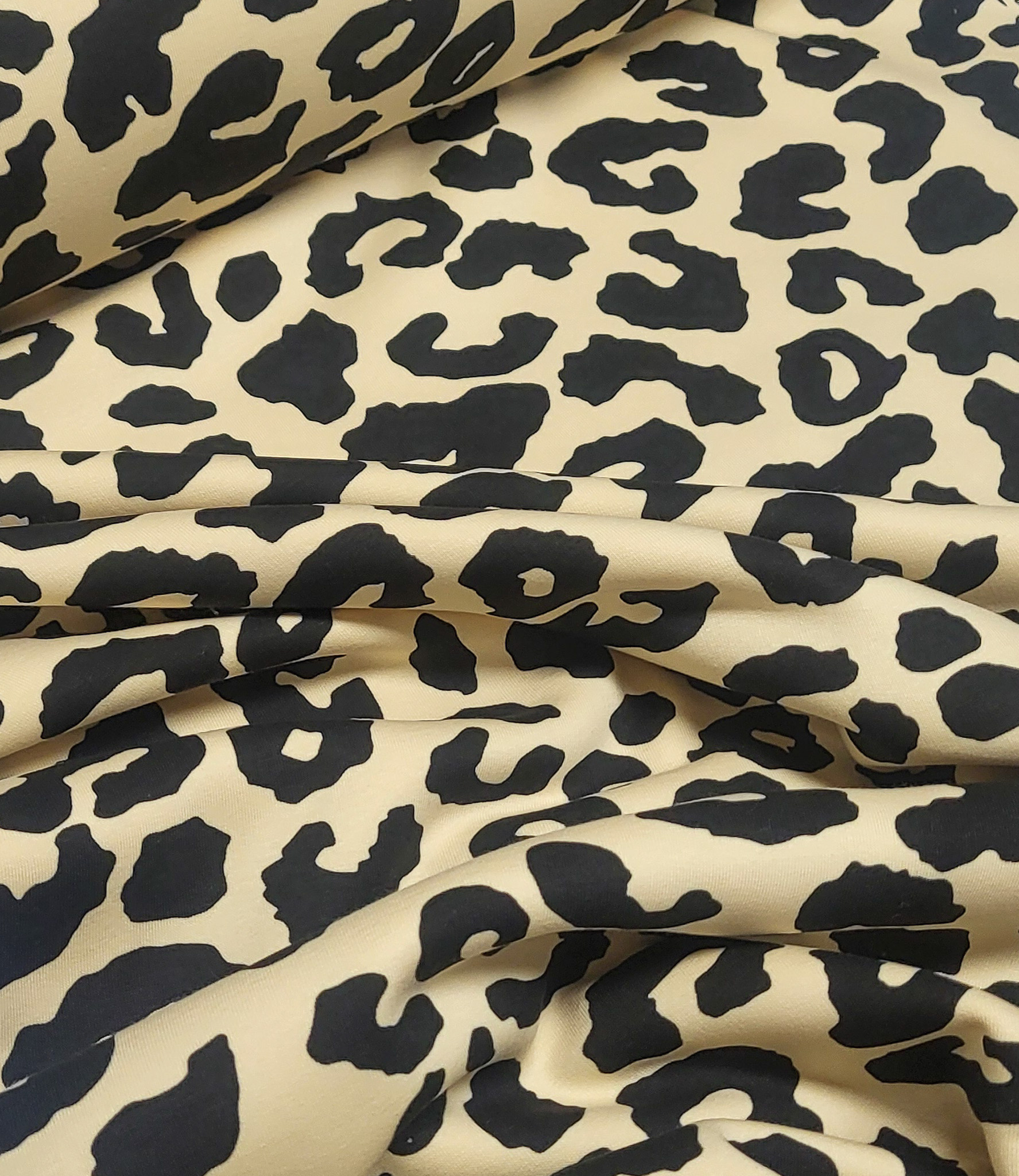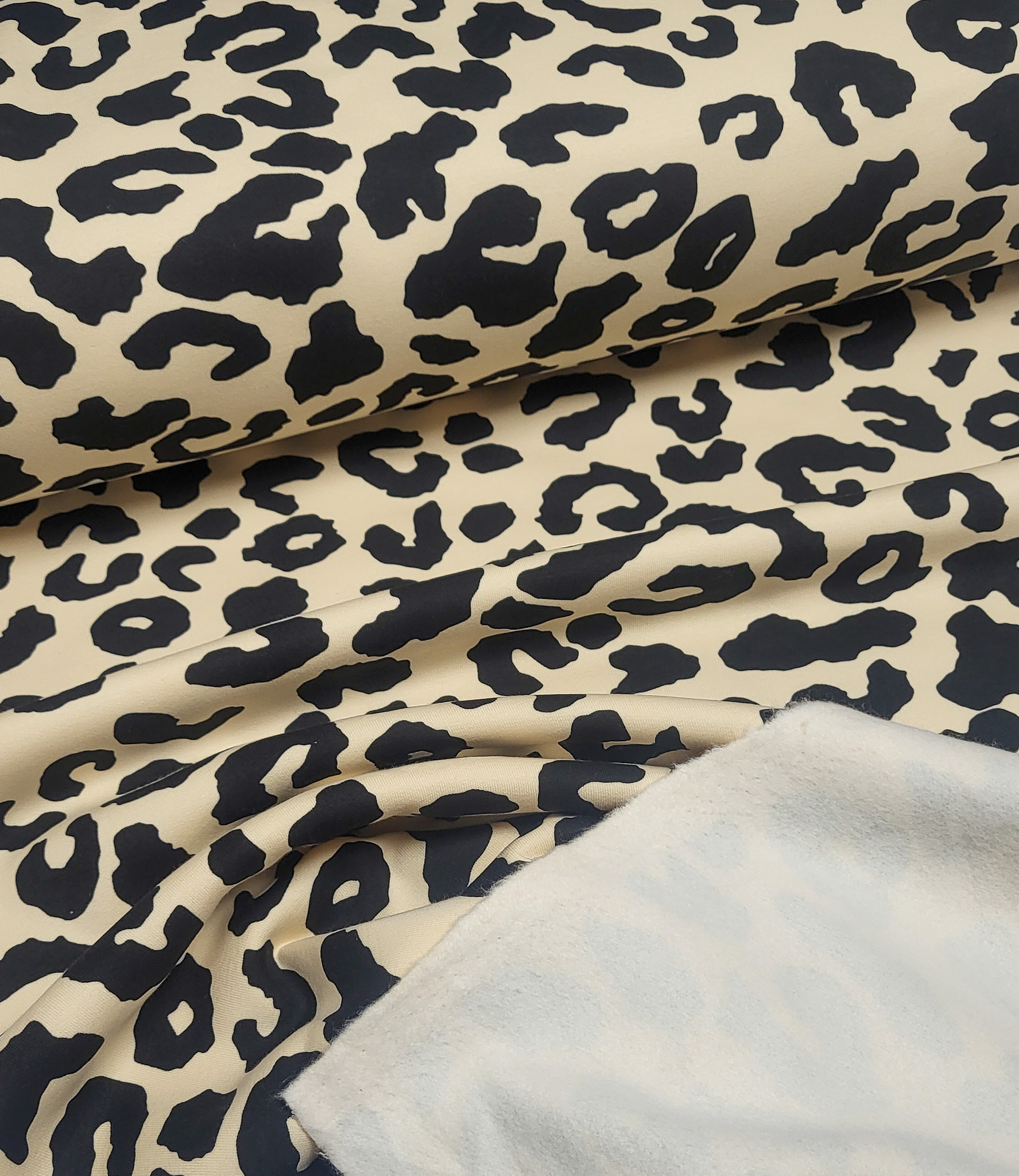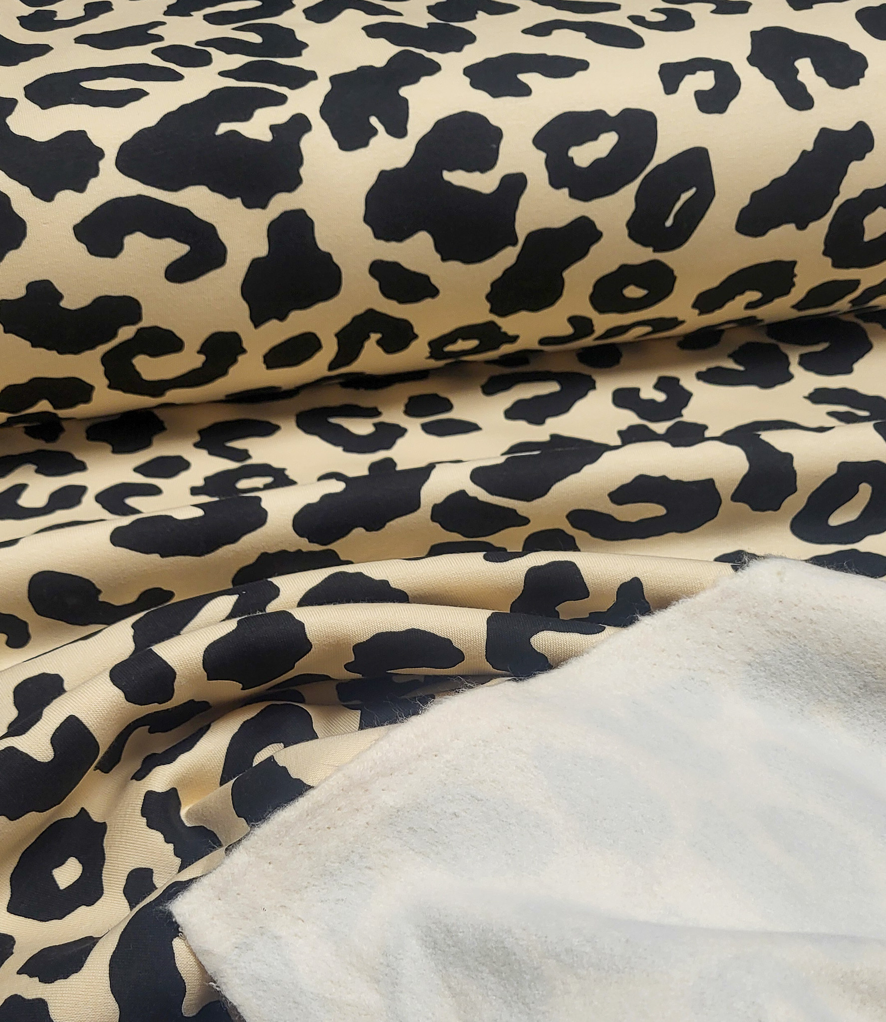A very nice quality soft, brushed sweater with leopard print. Lovely warm and suitable for sweaters, pants, vests, dresses, etc. Lovely soft molton layer at the back.