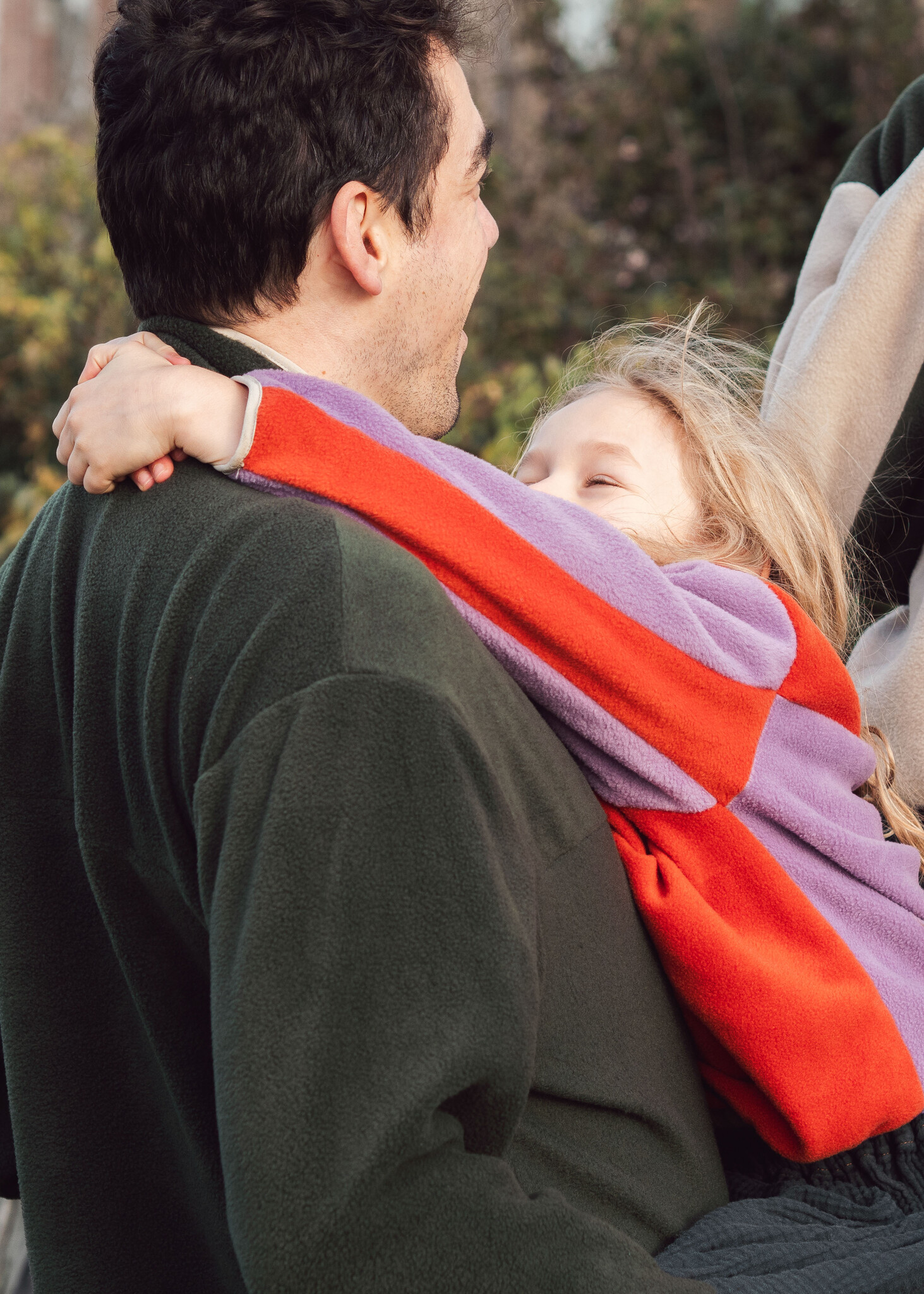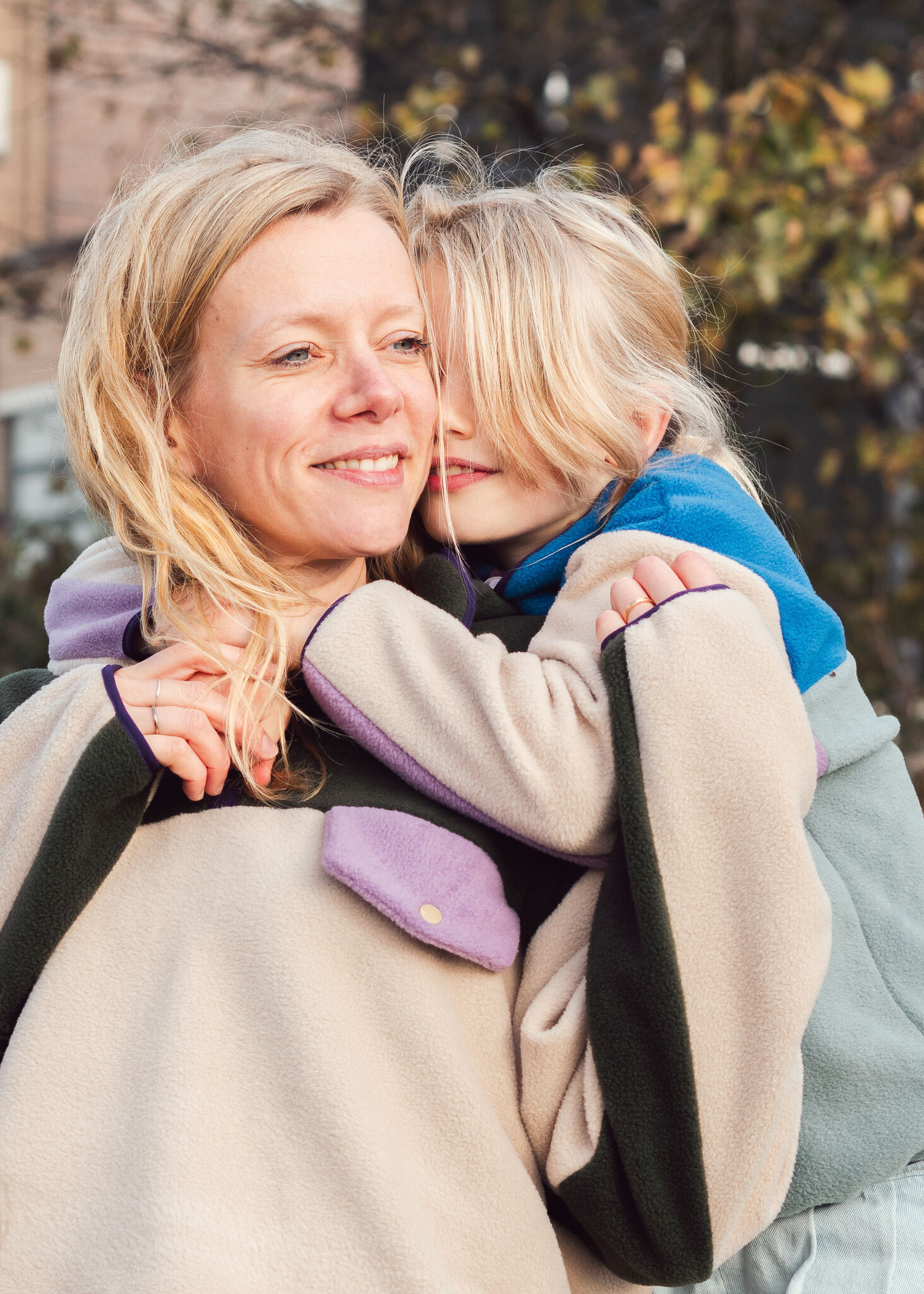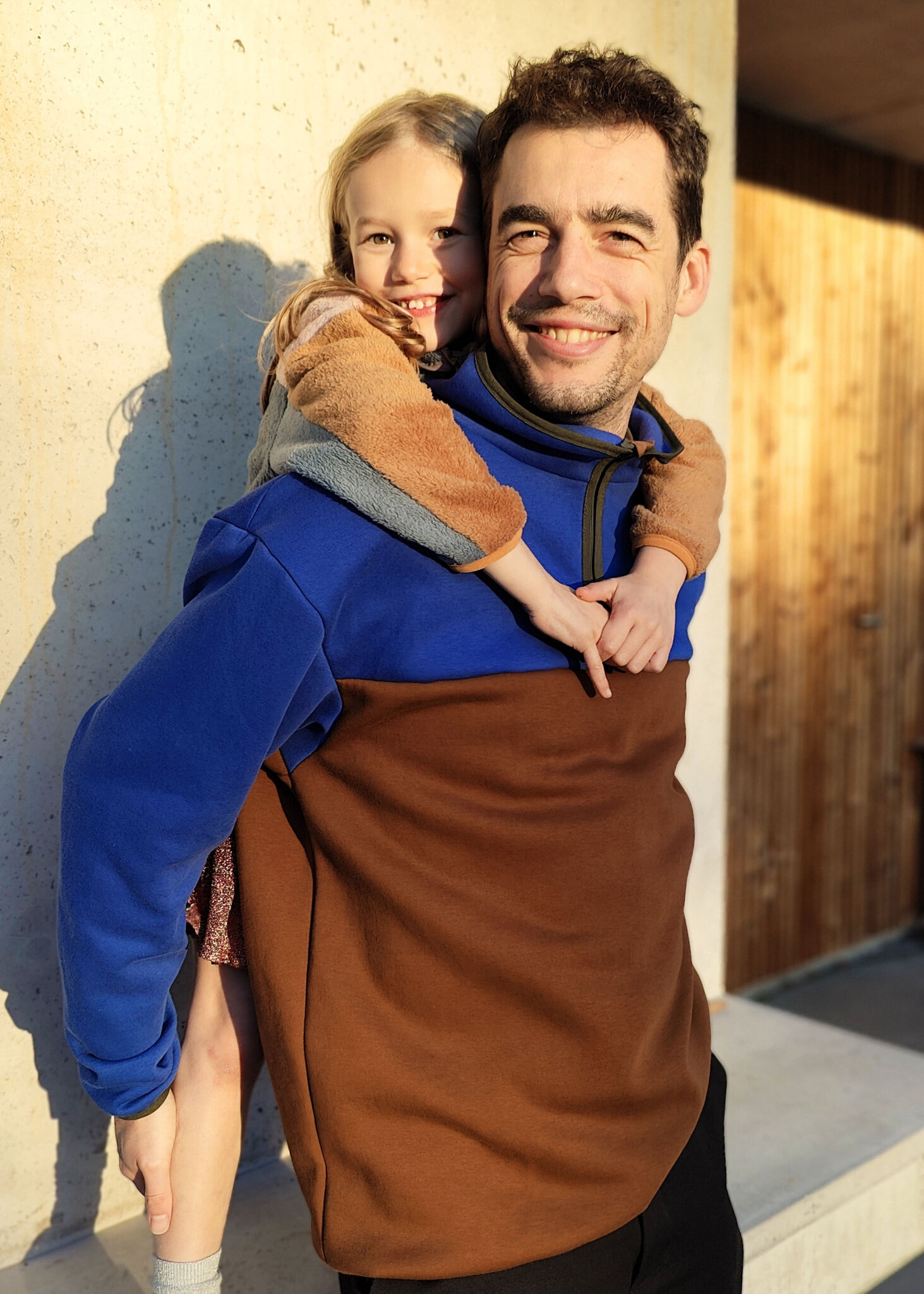 Luca is a unisex sweater or jacket with a zipper and with hanging sleeves and a collar. The hem and sleeves are finished with bias (stretchable or non-stretchable). The front next to the zipper and the collar are also finished with bias. Make the jacket that opens all the way down or sew a sweater where the zipper opens halfway. Luca lends itself perfectly to color blocking with the seam on the back, front and sleeve.
