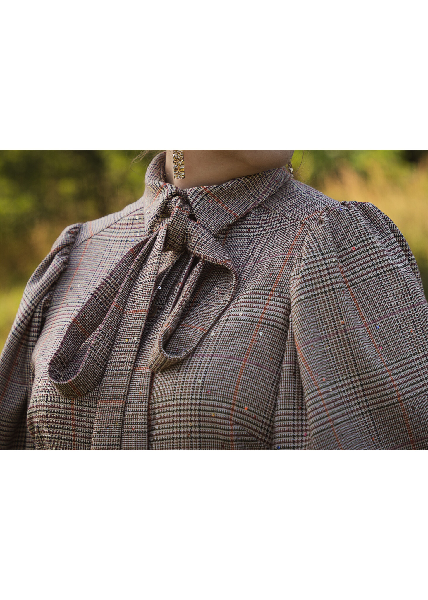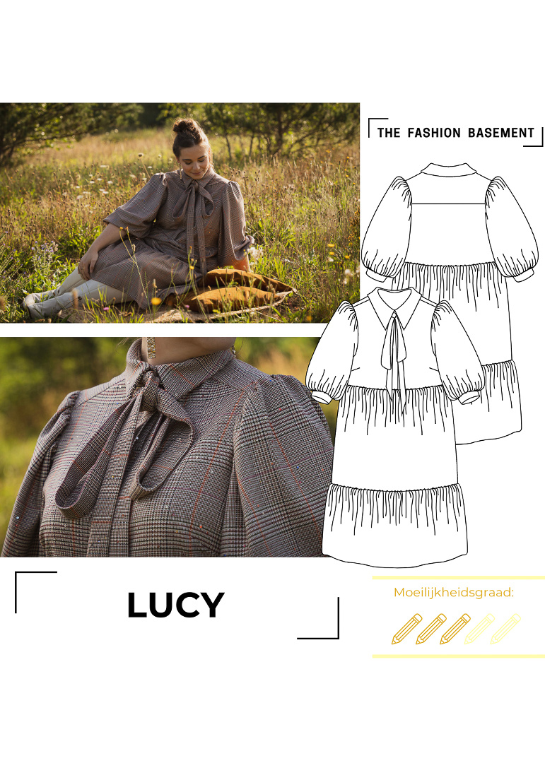 Lucy is a dress with statement sleeves and a tie ribbon in the collar. It is a wonderfully comfortable garment with a designer look.