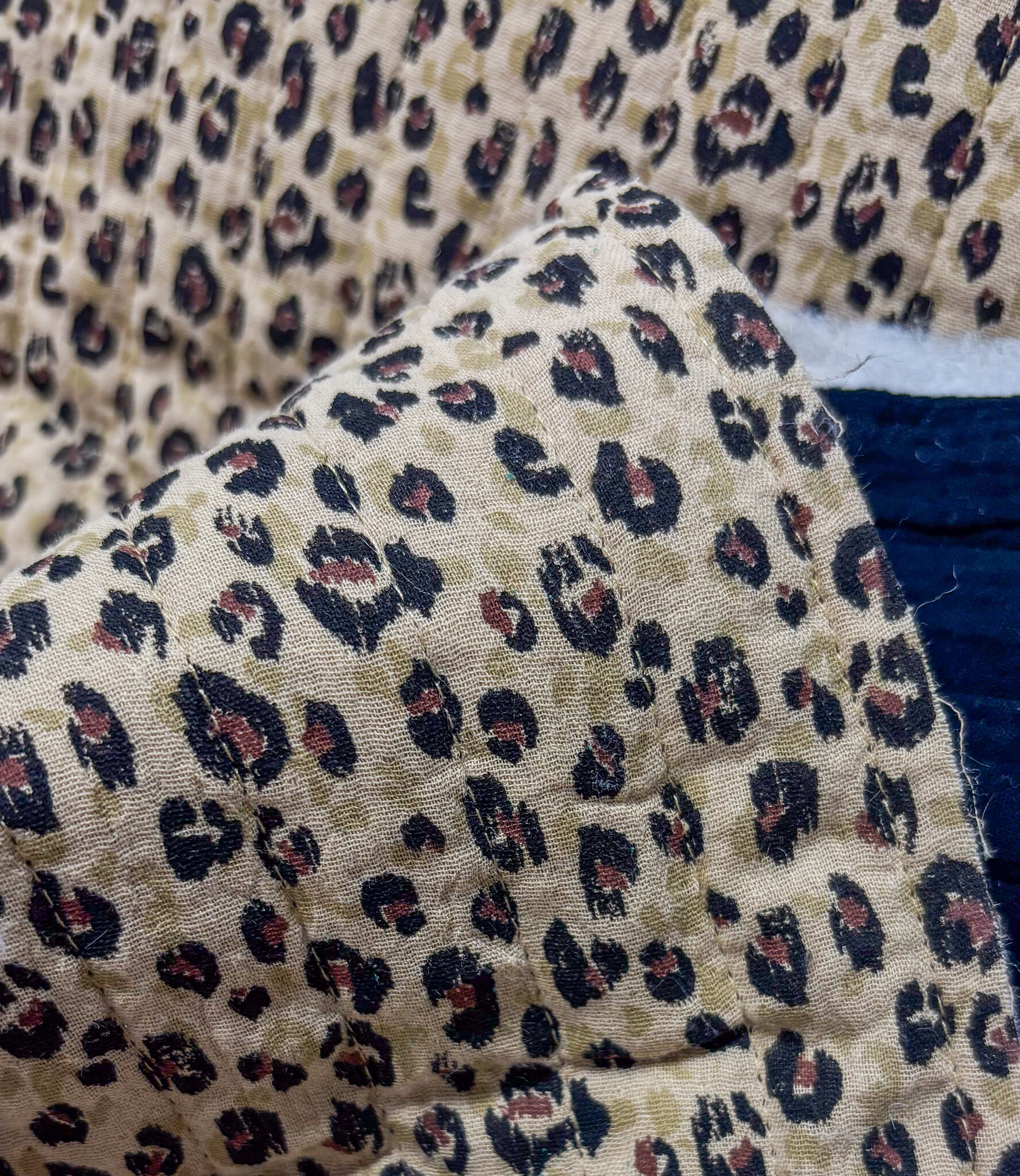 A soft, quilted double gauze tetra with a leopard print. Double-faced, so this fabric can be used on both sides. Perfect for jackets, body warmers, blankets, and more. Perfect for the Junna vest by Bel 'Etoile. Also perfect for the Junna Bodywarmer (zip-up vest) by Bel 'Etoile.