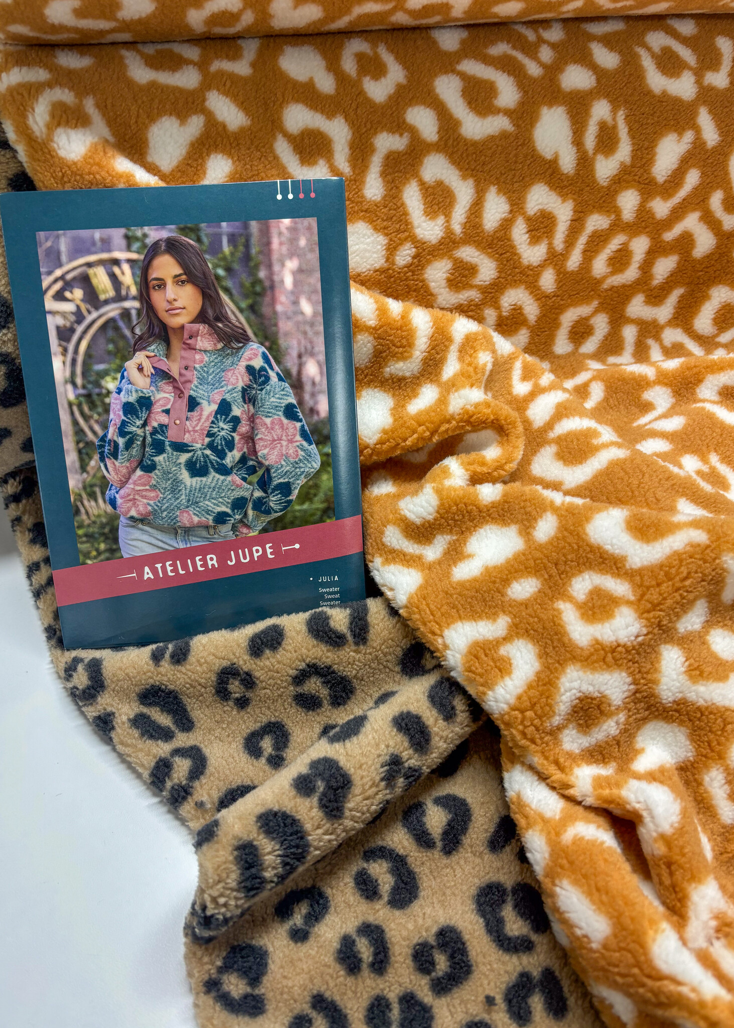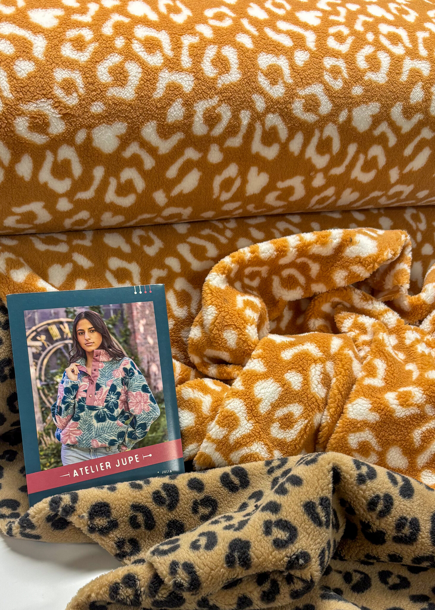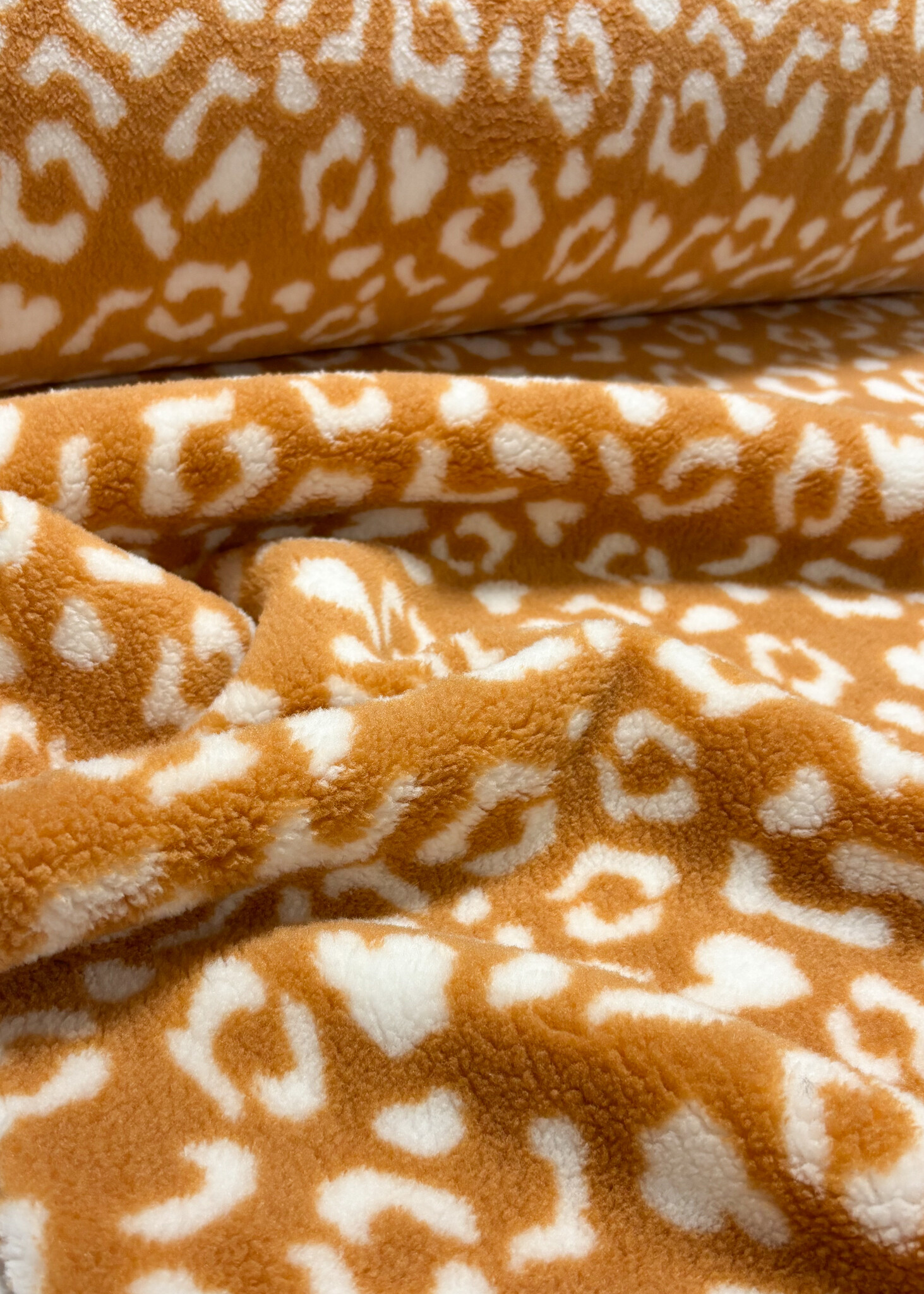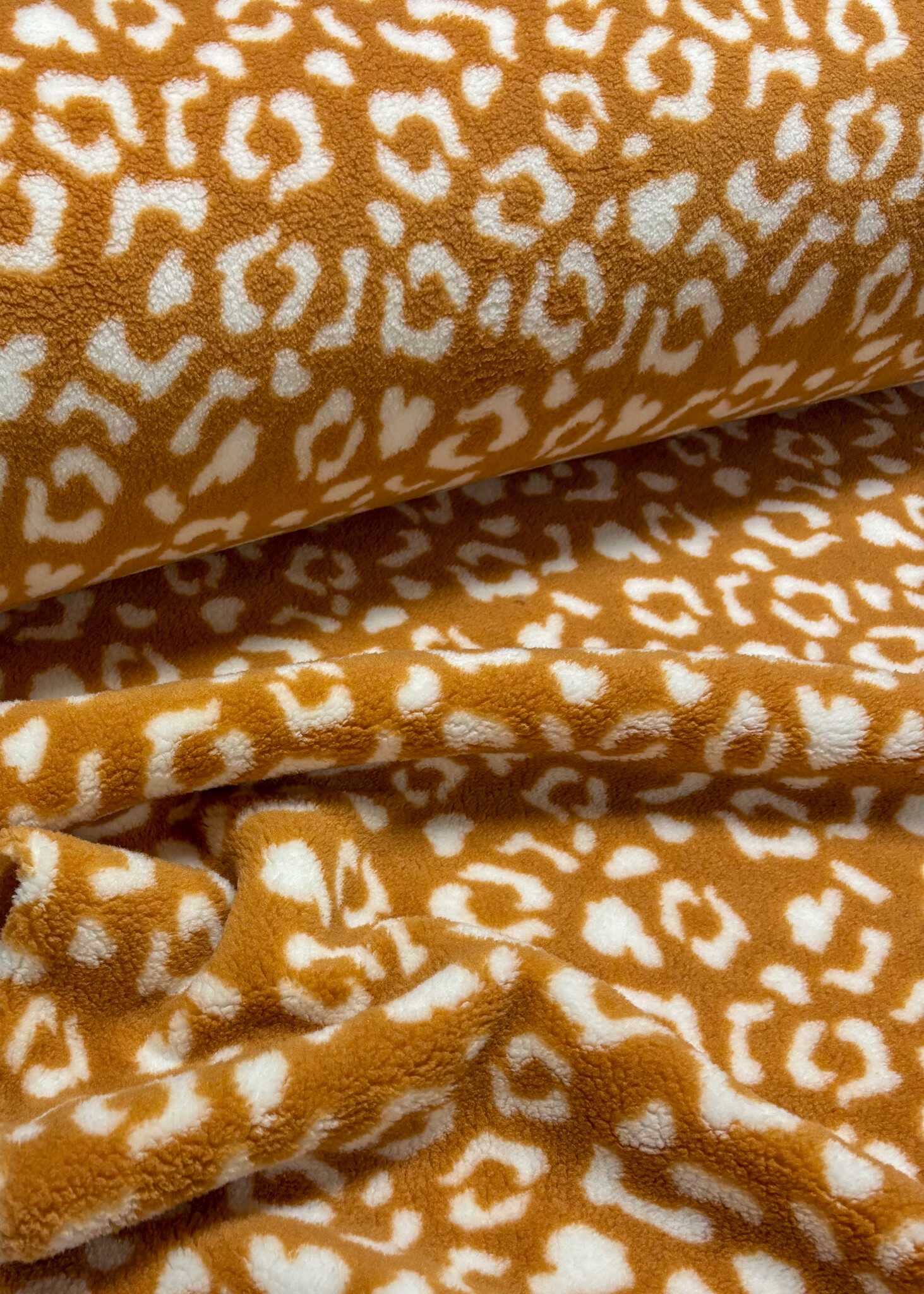 A soft sherpa teddy fabric with leopard print. Perfect for coats, but also for warm sweaters.