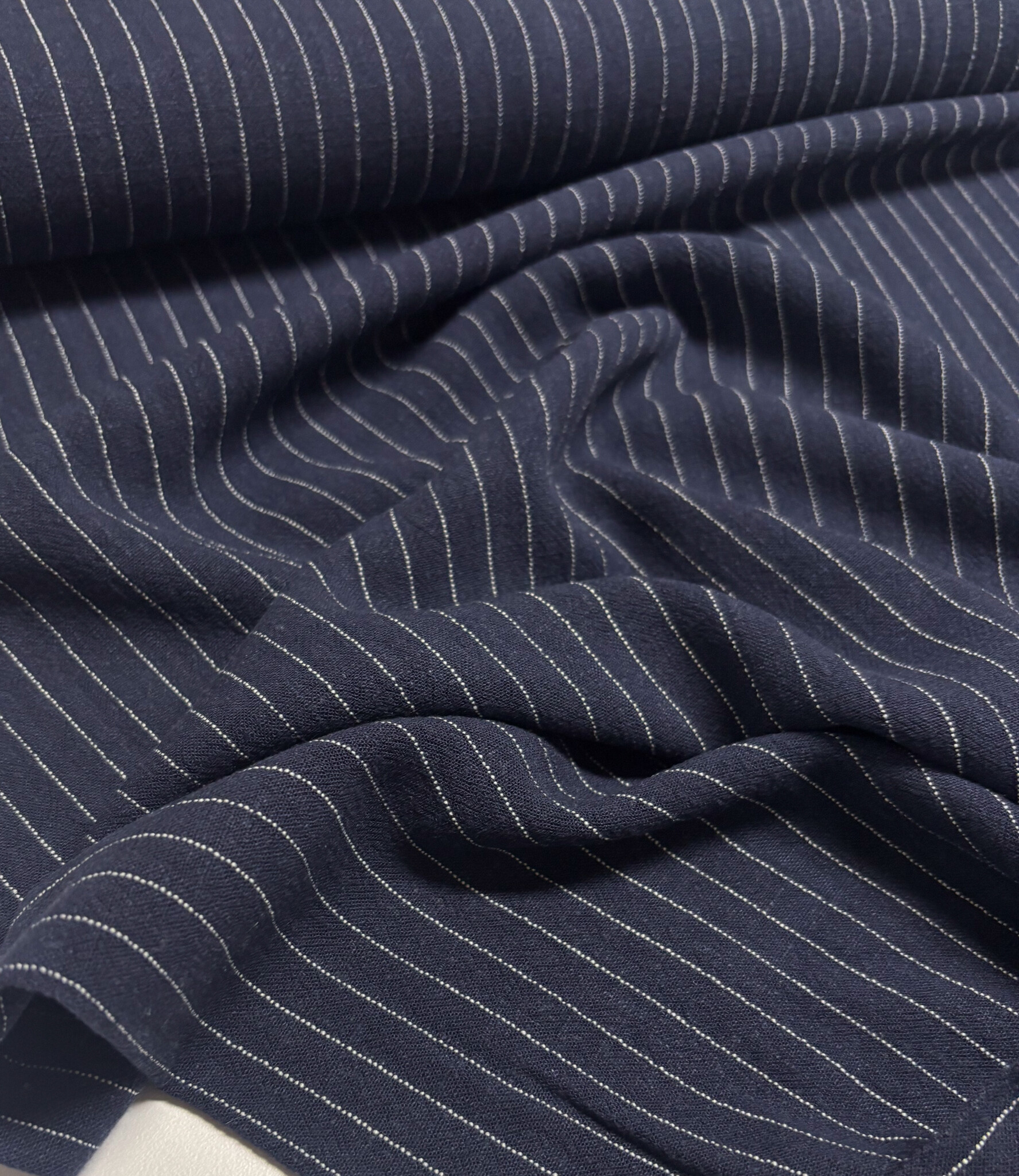 A beautiful rayon linen blend with a pinstripe. Perfect for trousers, skirts, dresses, and more.