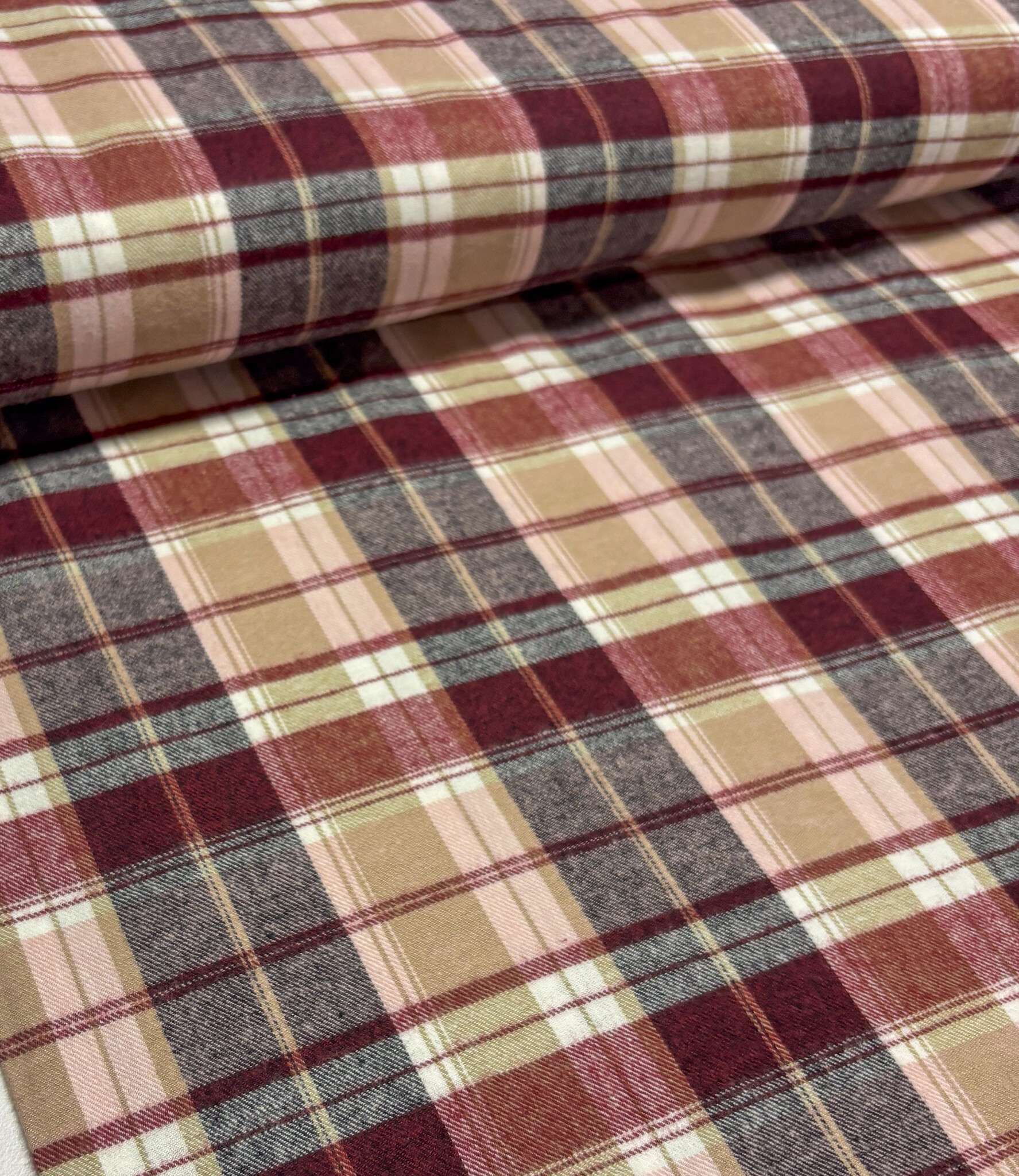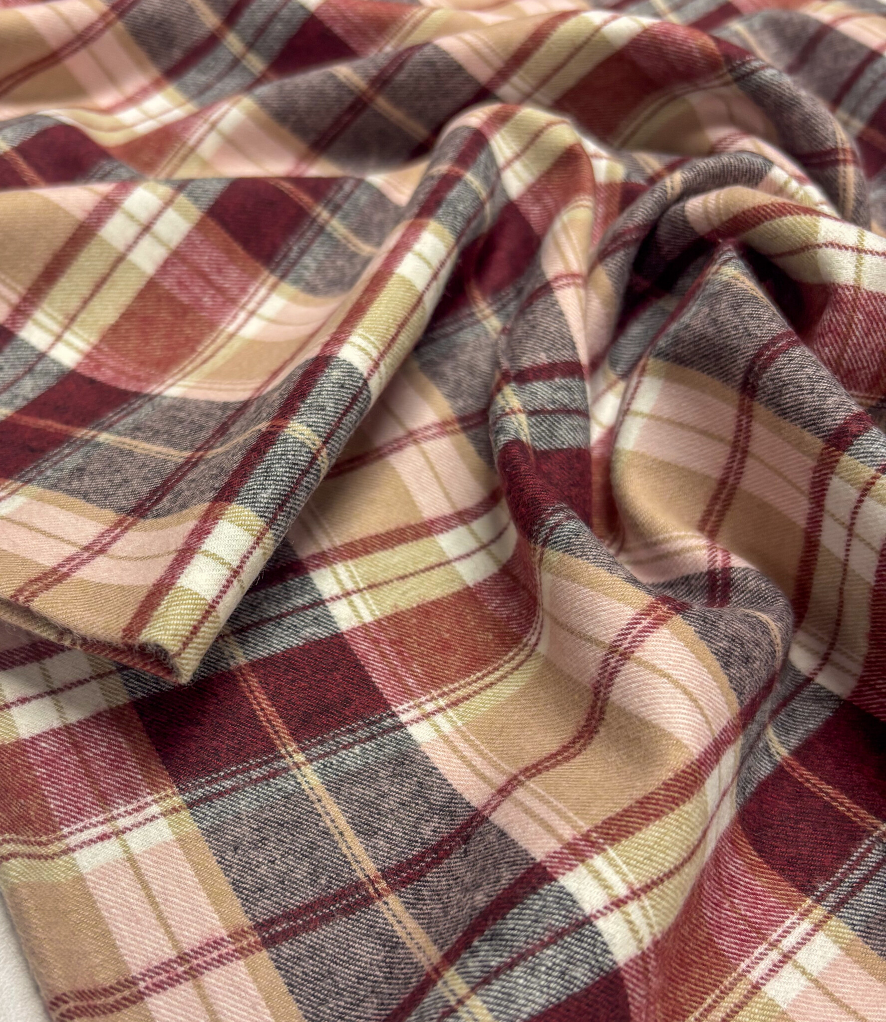 A soft flannel with checked patterns. Perfect for shirts, pajamas, and other fabrics.