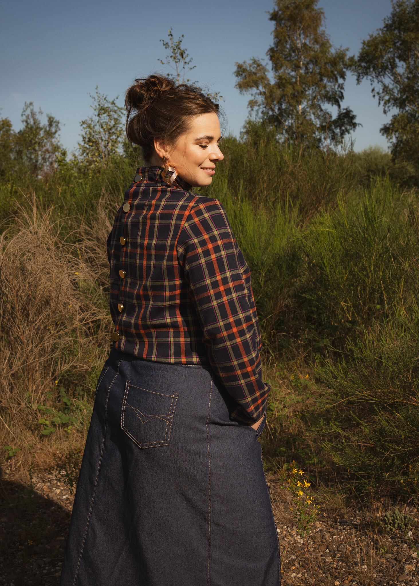 Ellie is a fitting blouse with a stand-up collar and button closure at the back. By placing the closure in the back, you get a surprising accent and give a designer touch to a fairly basic garment.