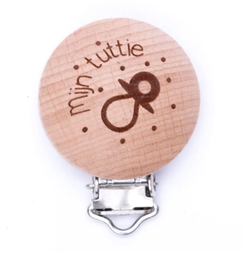 A cute pacifier clip made of smooth wood with the text " My tuttie ".