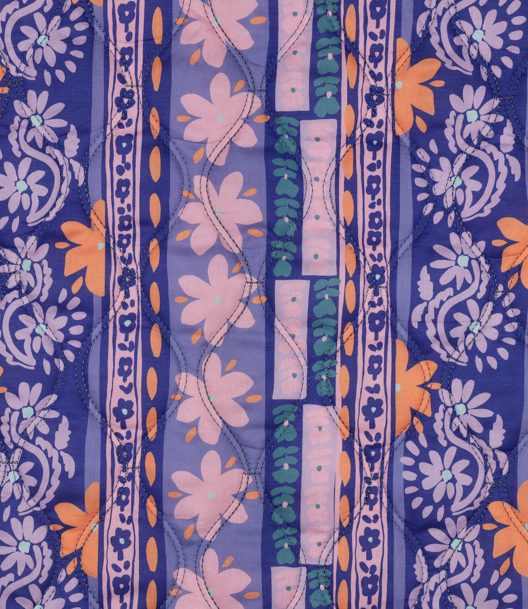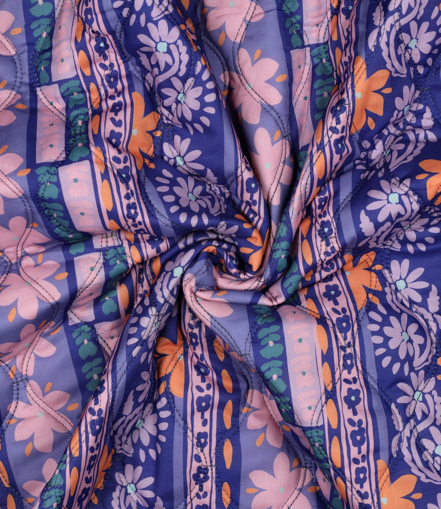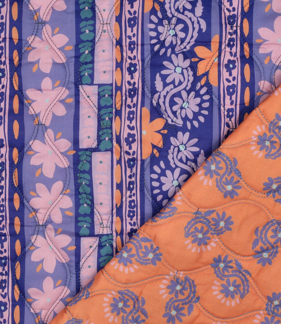A double-faced quilted cotton with a purple and orange print. Perfect for a Junna cardigan, a large or small bag, a blanket, etc.