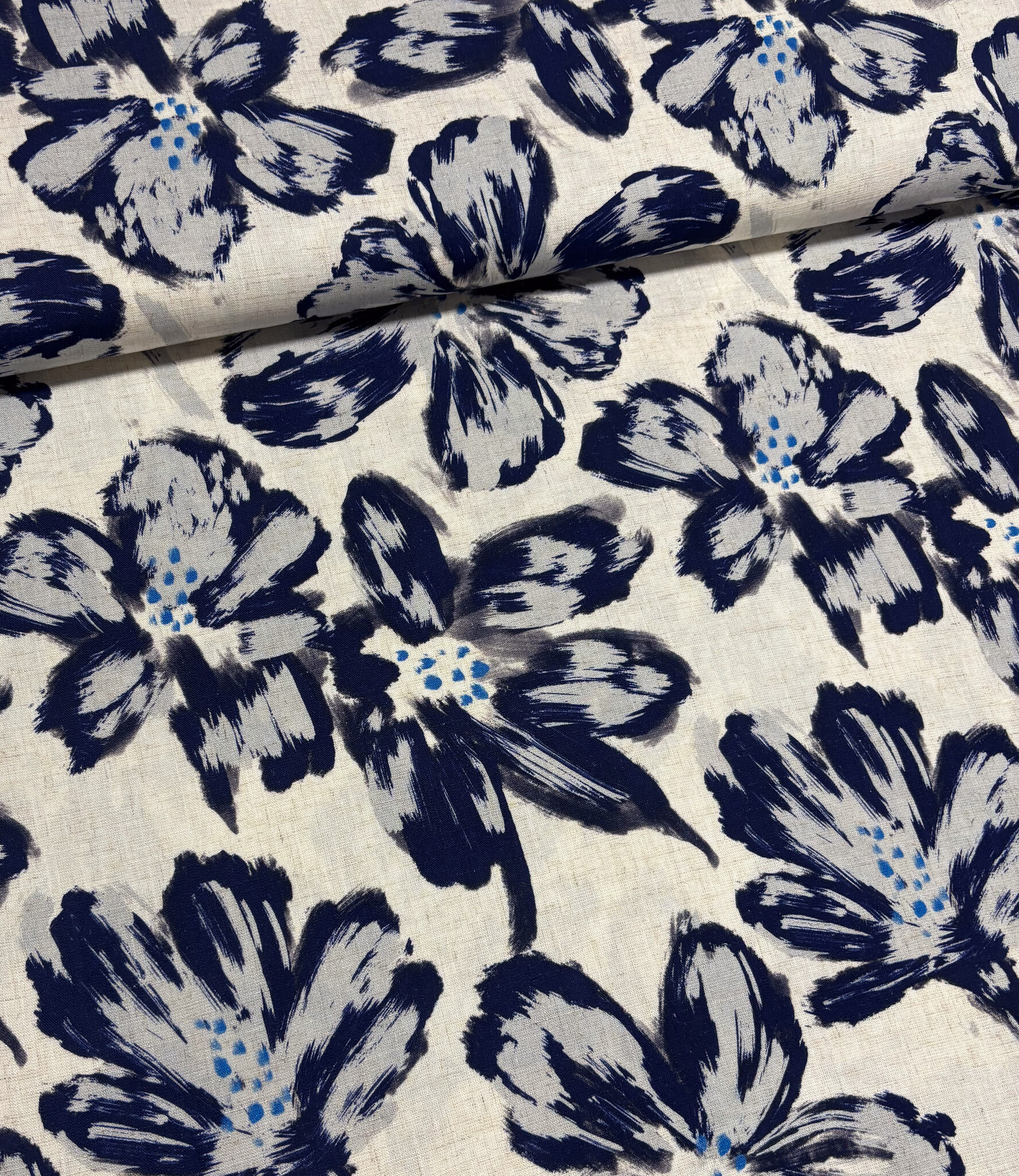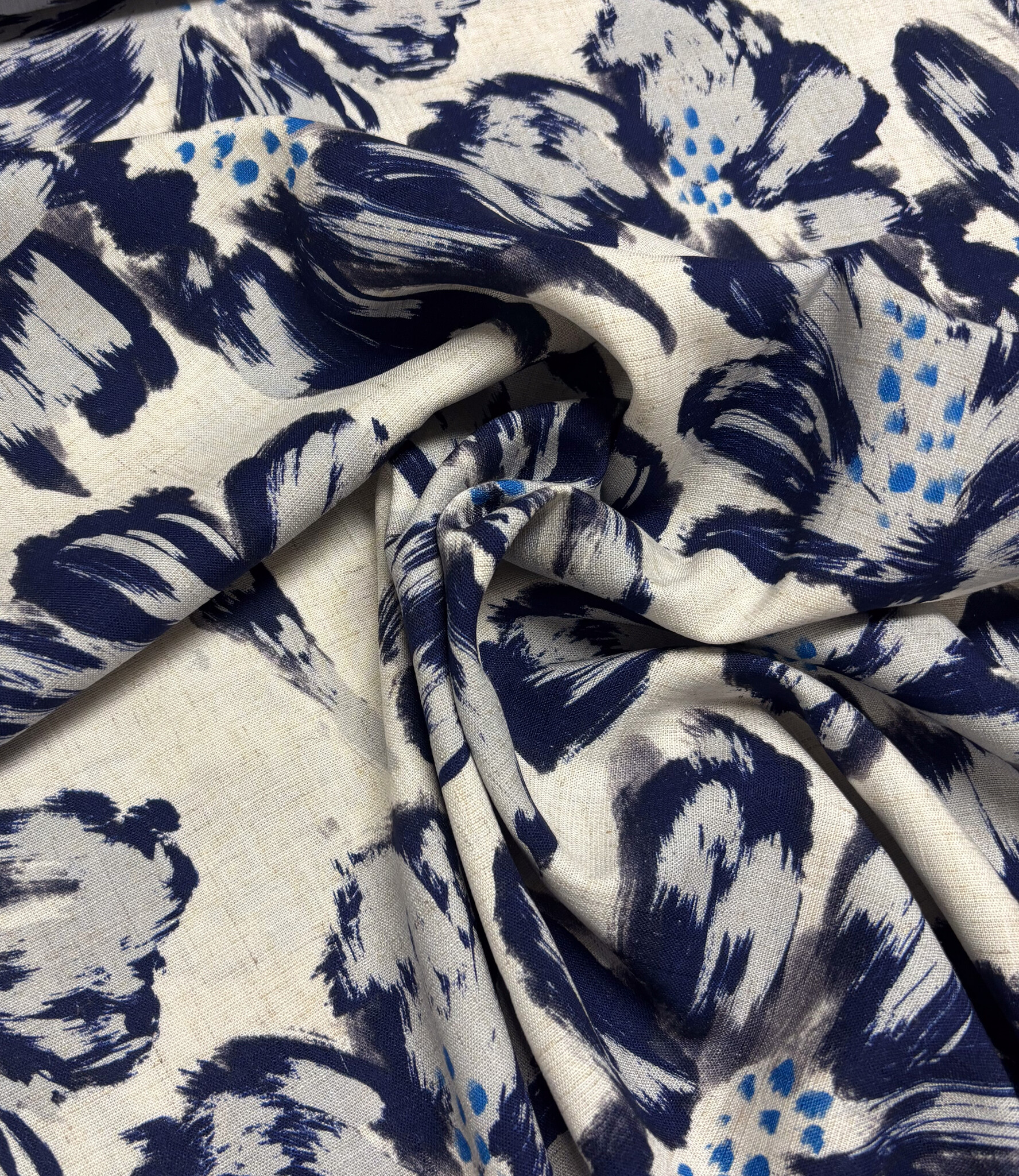A beautiful, softly flowing linen rayon blend with floral details. Perfect for summer dresses, blouses, skirts, or loose-fitting trousers.