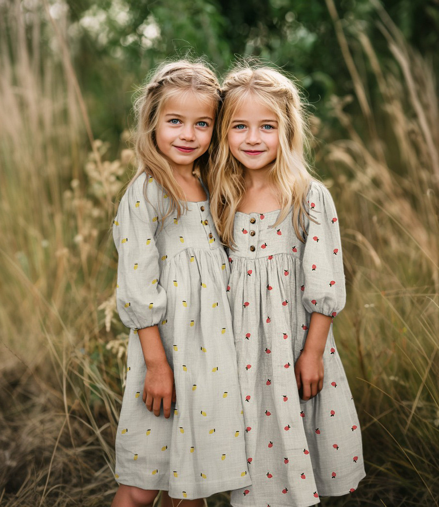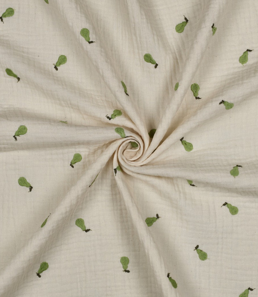 A soft tetra fabric, double gauze with beautiful embroidered pears. Perfect for dresses and blouses. For both children and adults. Wonderfully soft and airy! OEKO-tex certified.