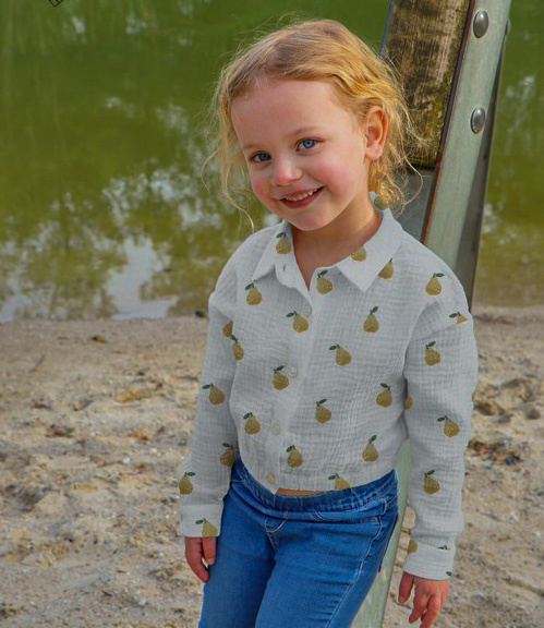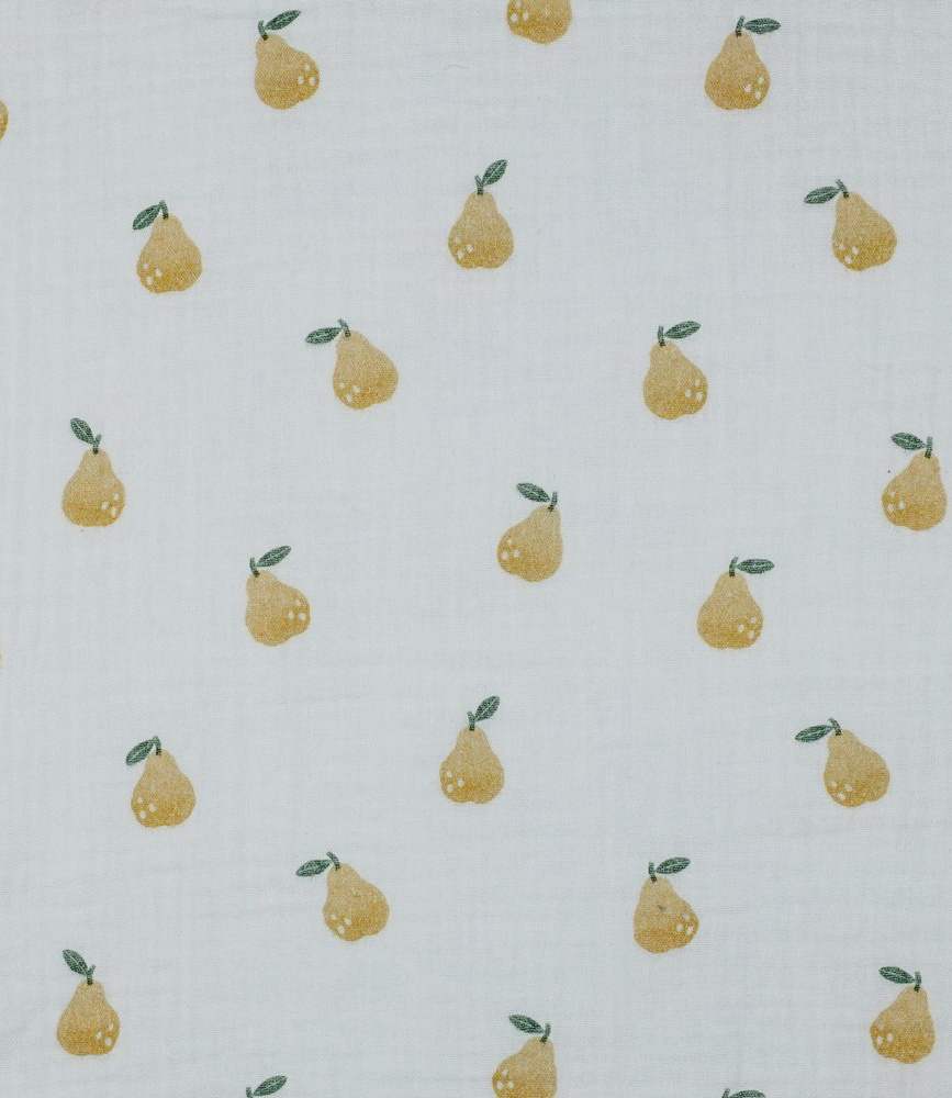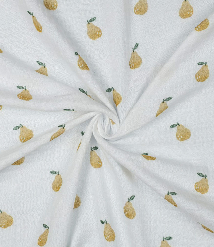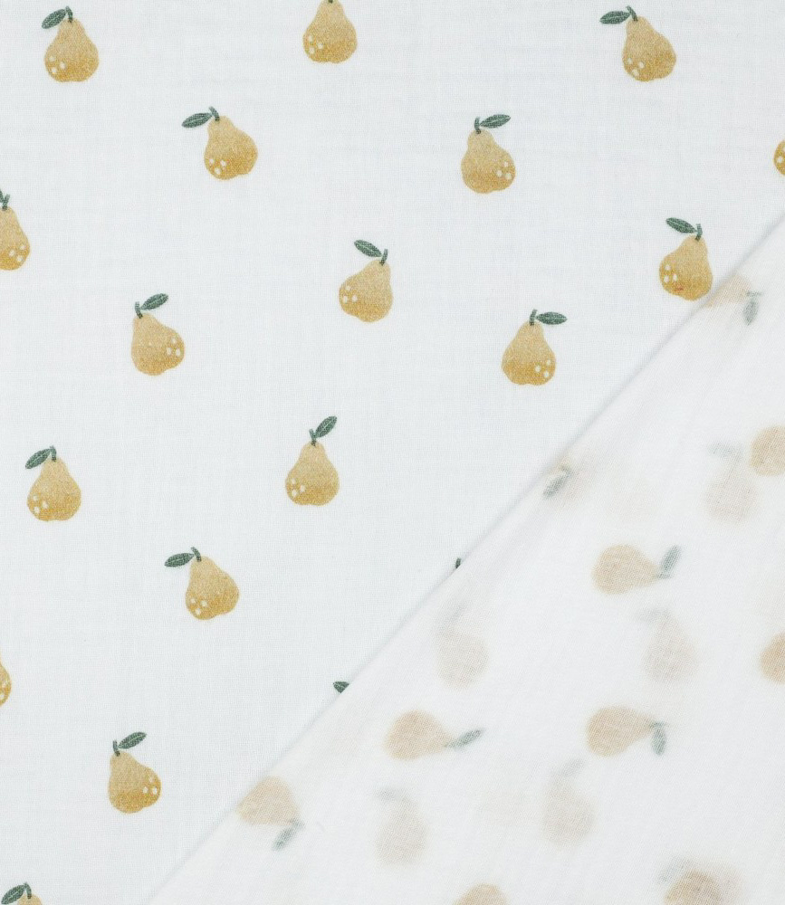 Beautiful quality double gauze with pears. Perfect for dresses, tops, T-shirts, and baby and children's items (nests, blankets, etc.). Wonderfully soft. OEKO-Tex certified.