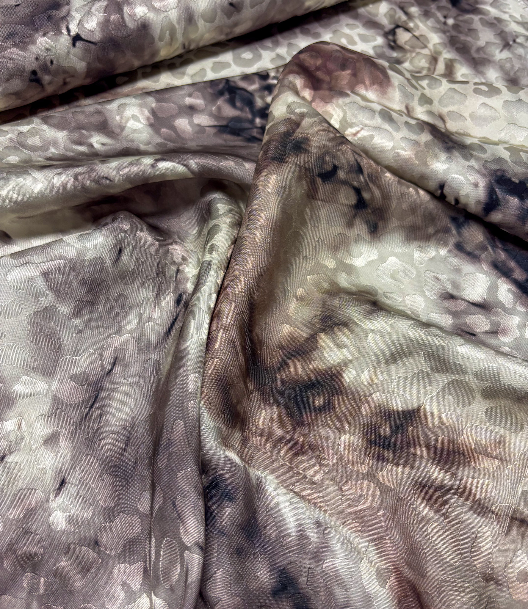 A beautiful viscose with a woven leopard print. It's opaque. Perfect for blouses, dresses, and skirts. Also great as a lining for a jacket.