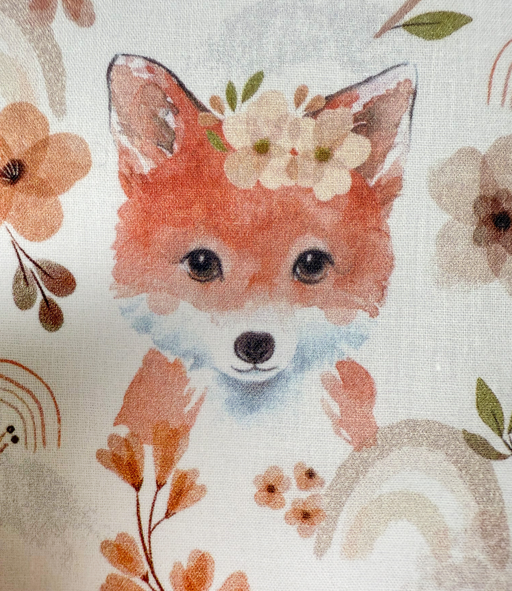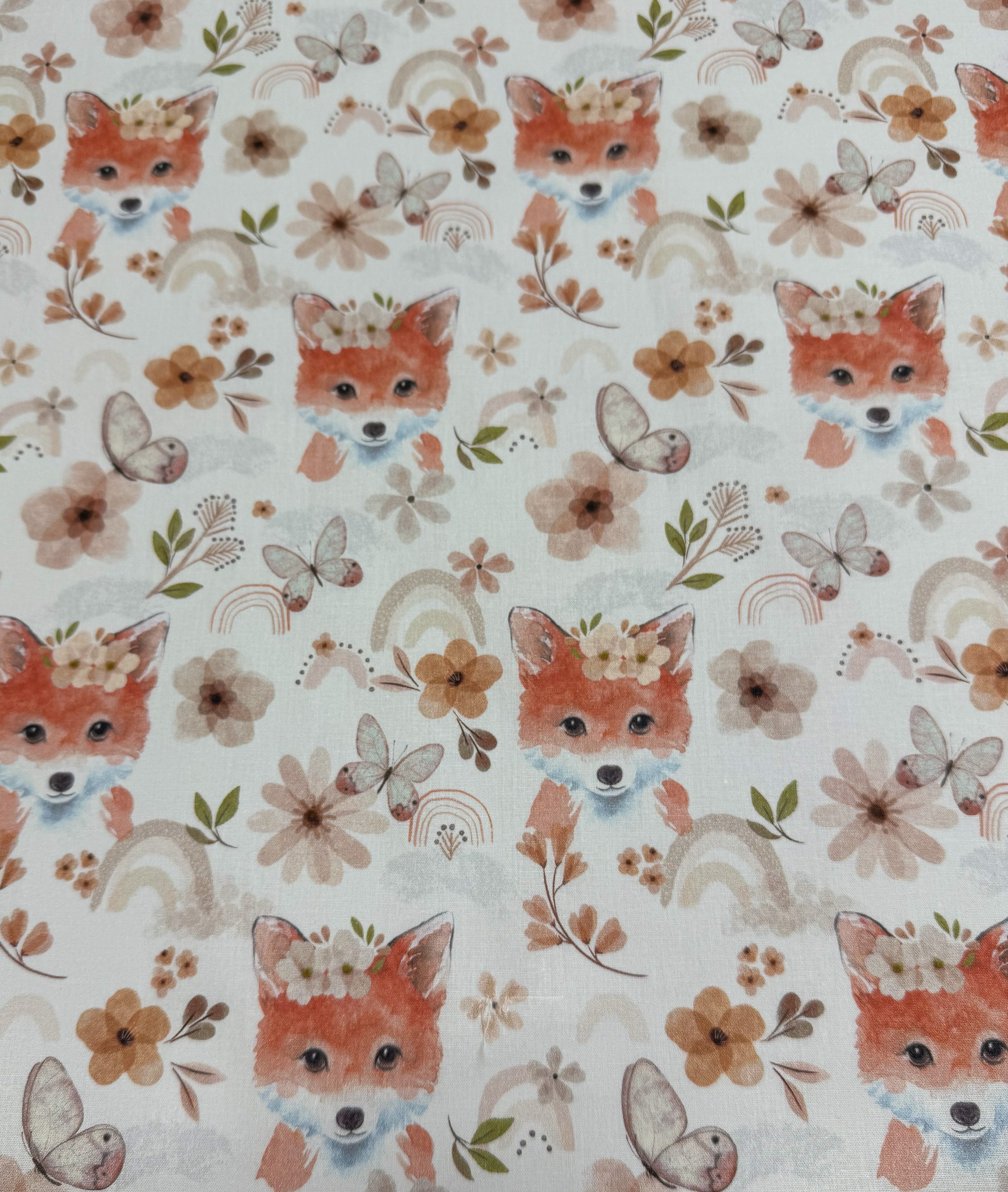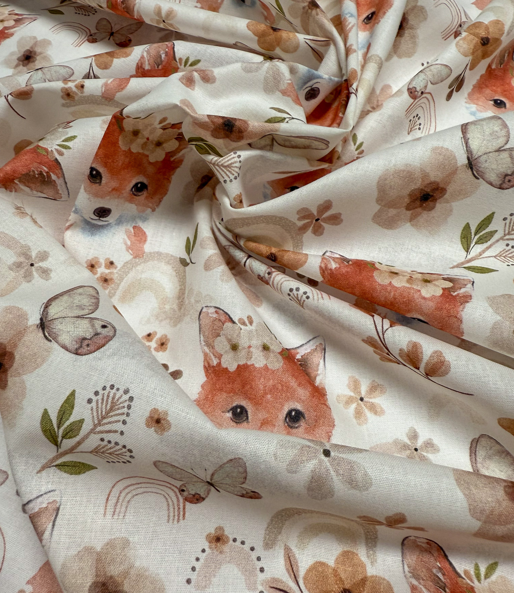 A soft cotton fabric with fox patterns. OEKO-Tex certified. This fabric is perfect for shirts, skirts, and dresses. Also great for baby clothes.