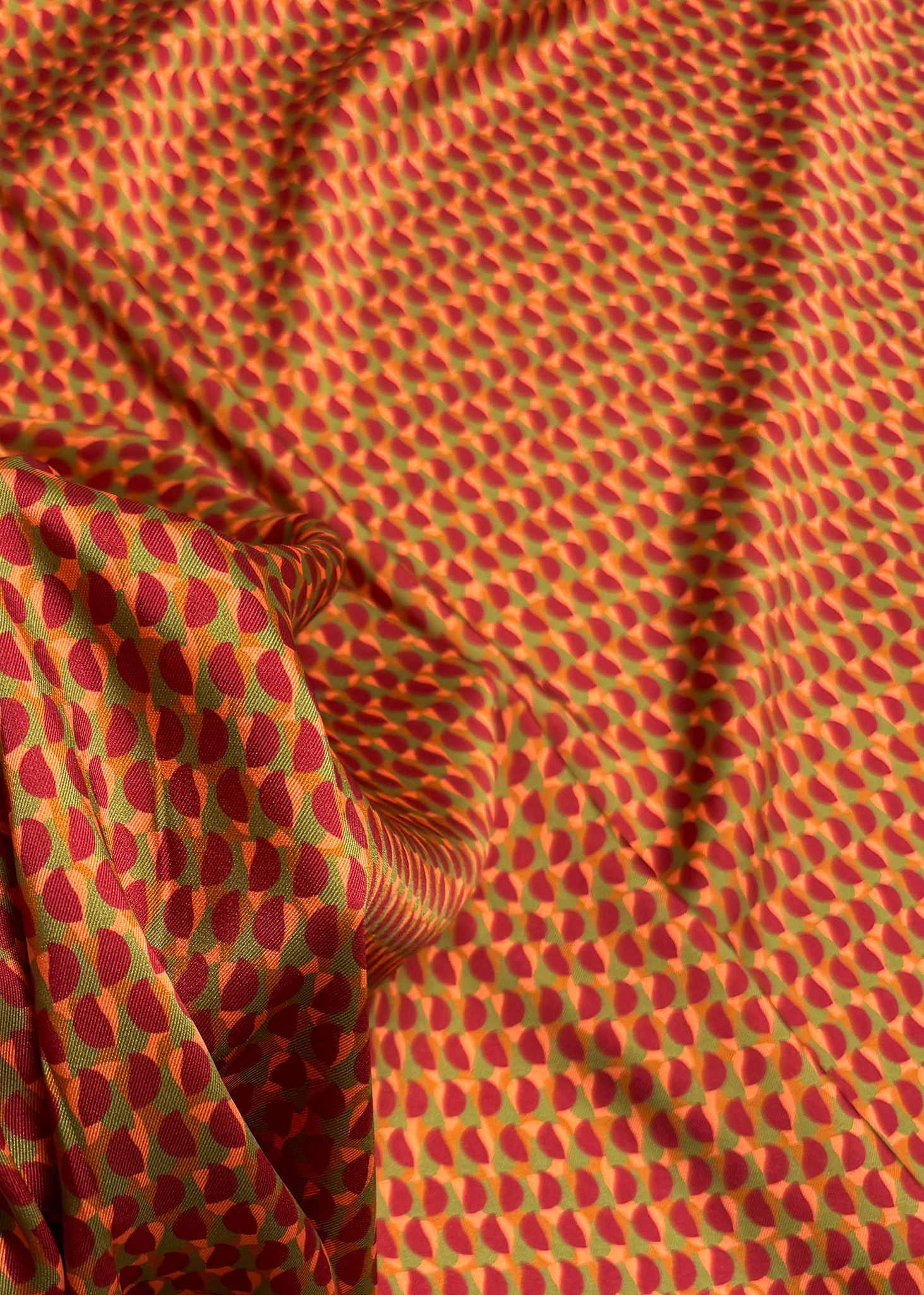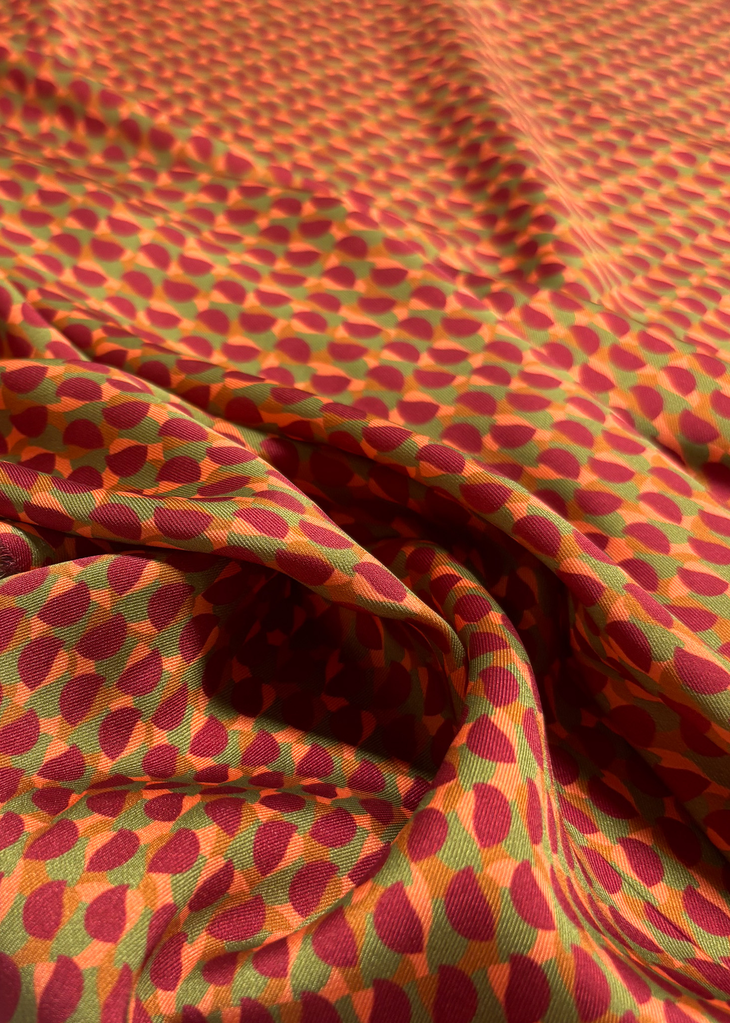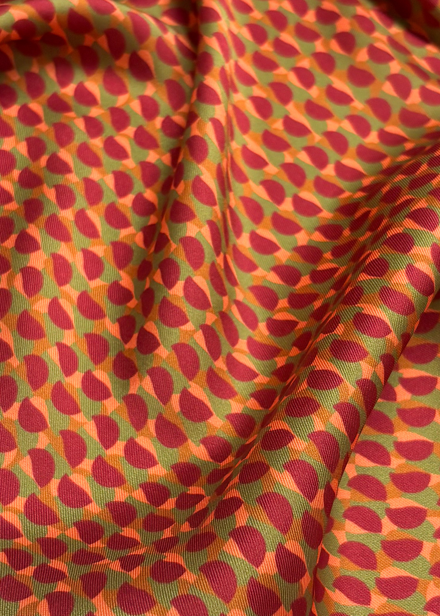 A soft satin with retro print. This fabric comes from our deadstock collection. This supple fabric falls beautifully and is perfect for skirts, dresses, blouses and trousers.