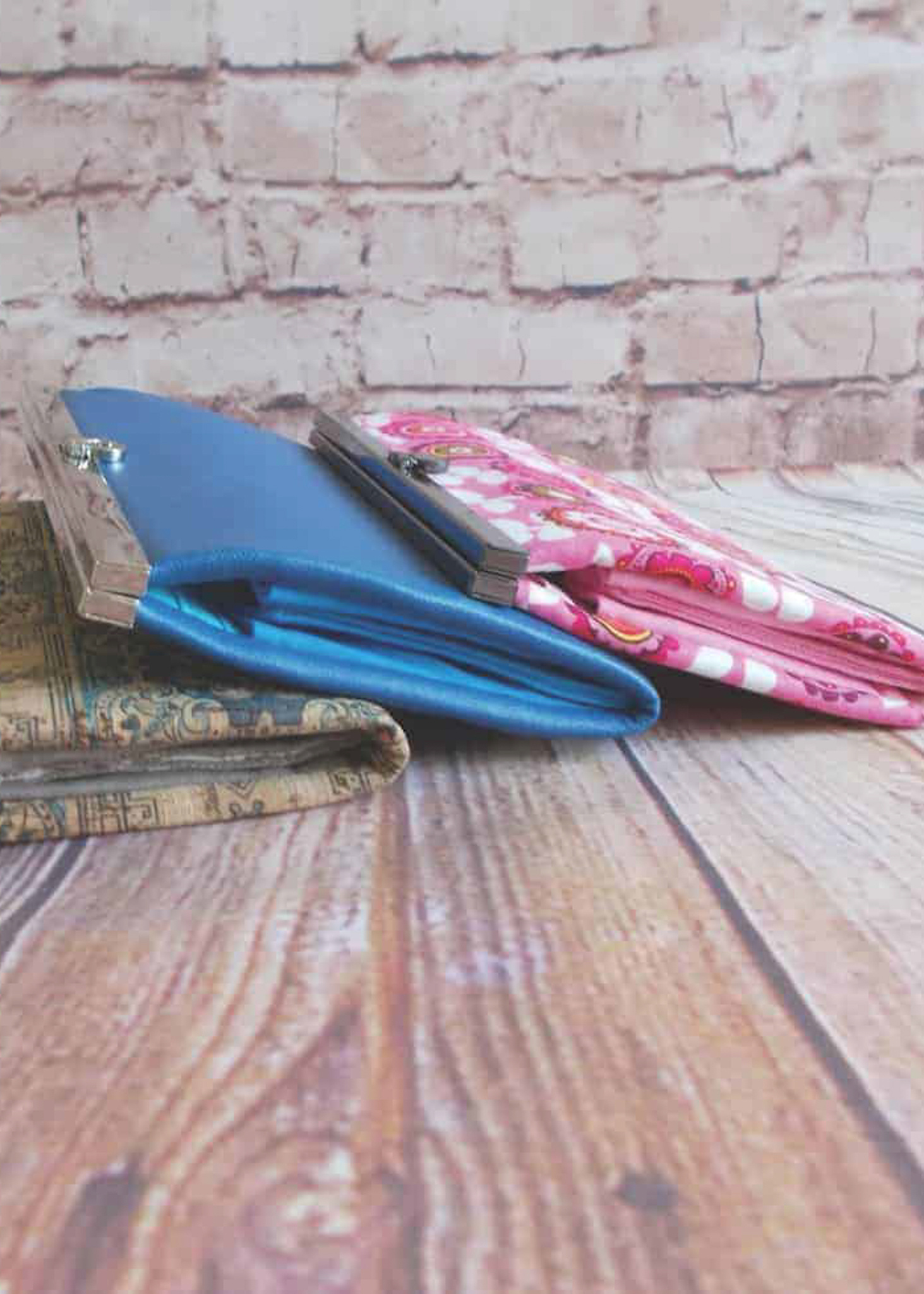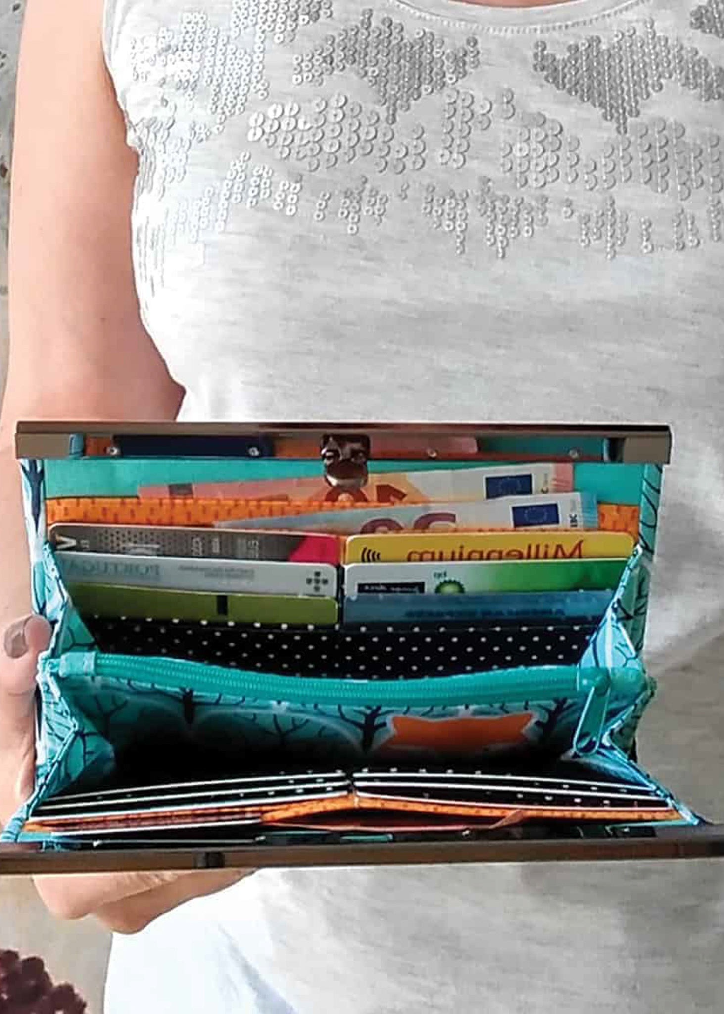 The wallet has three wide pockets, two small pockets, a coin compartment with zipper and twelve card slots. There is enough space for your smartphone. Once you've cut out and reinforced the pattern pieces, you'll find it comes together quickly.