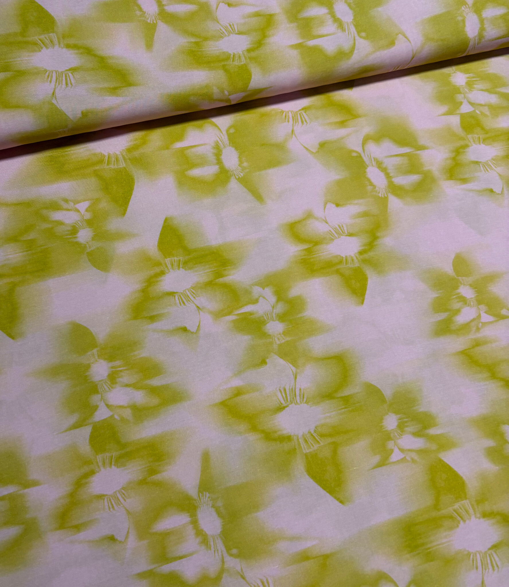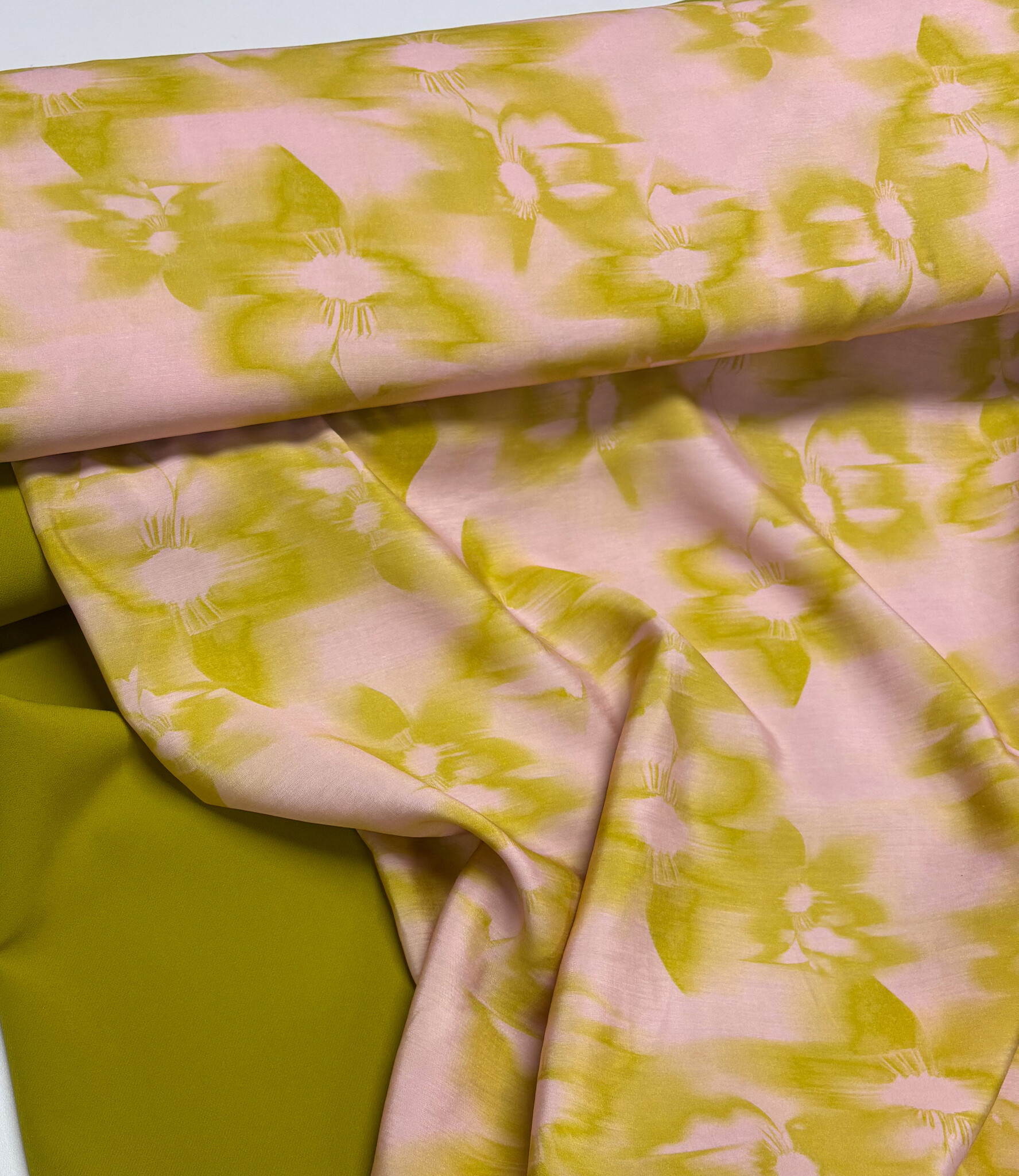 A silky-soft satin viscose with ochre-colored subtle flowers.