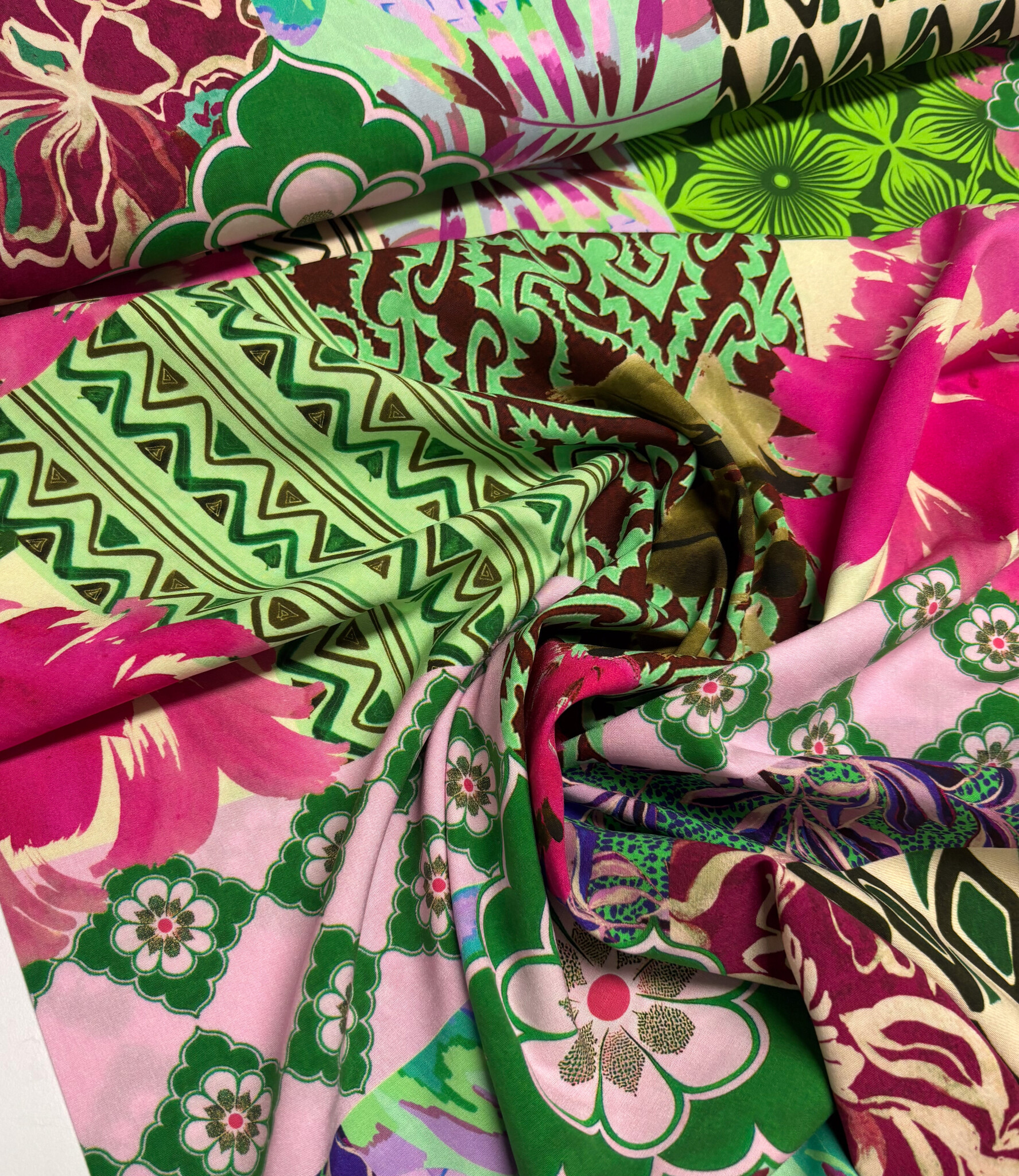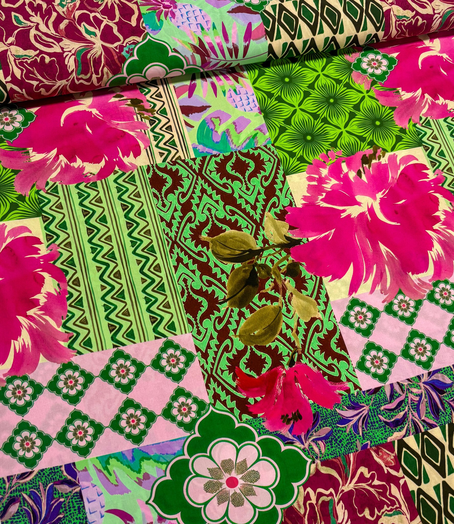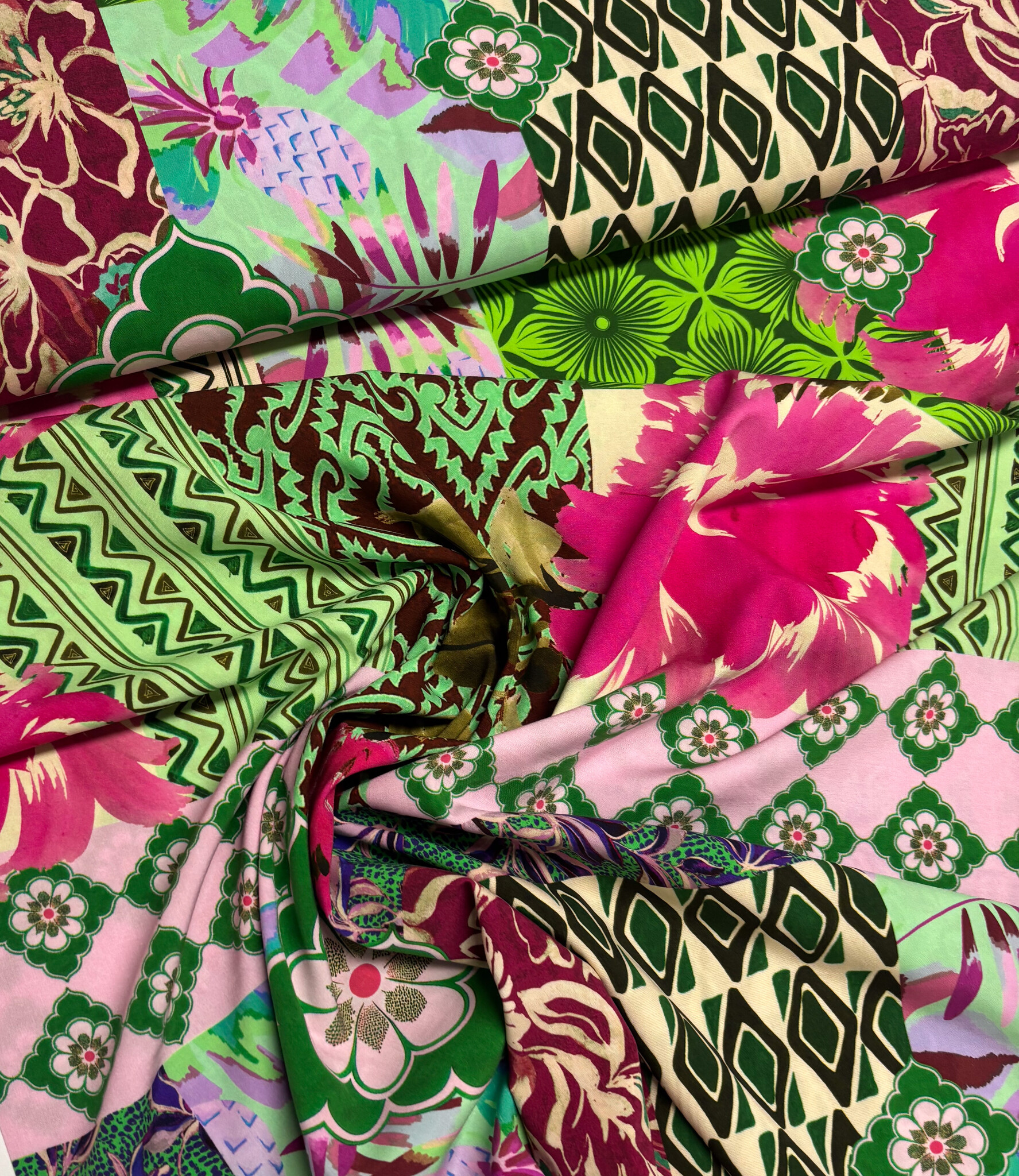 A beautiful viscose with a patchwork print. Light stretch.