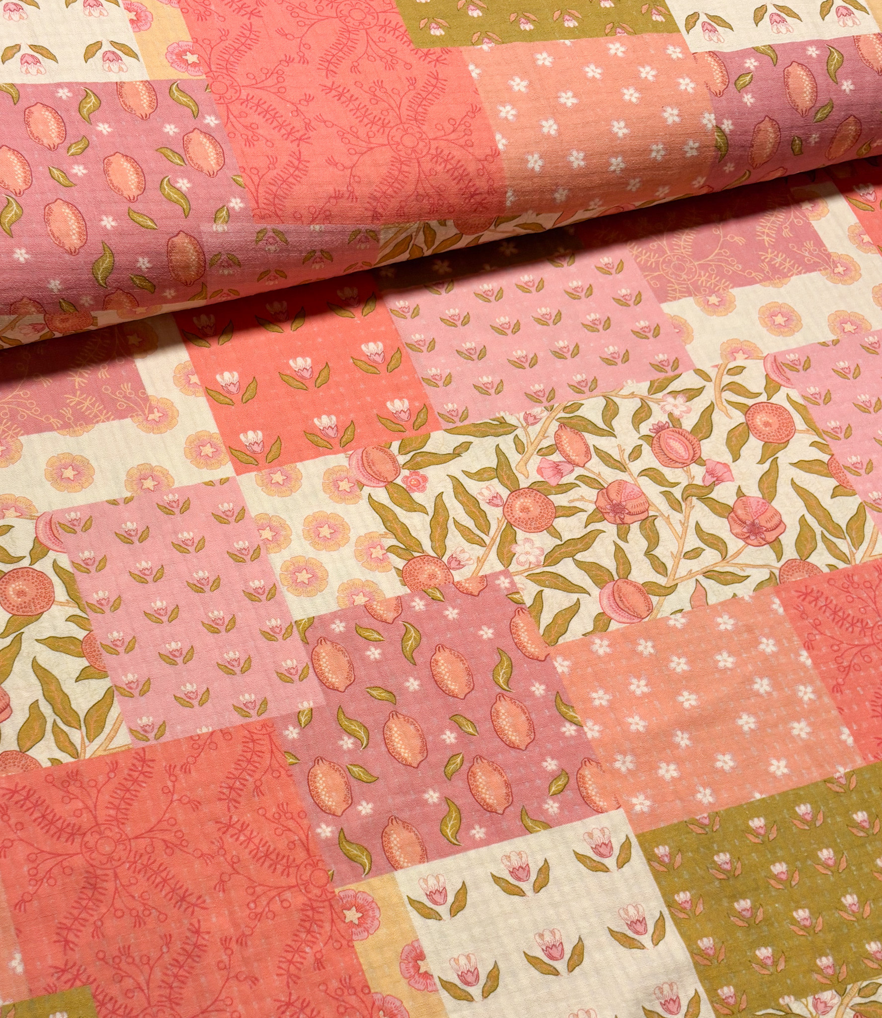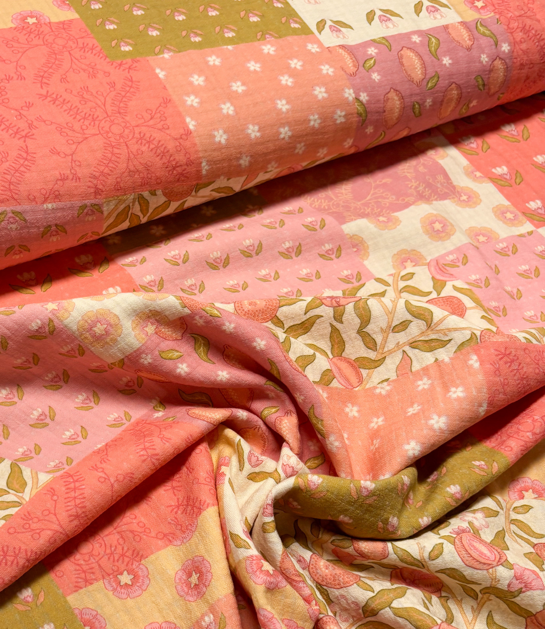 Beautiful quality double gauze with various prints and a pactchwork look. Perfect for dresses, tops, T-shirts, and baby and children's items (nests, blankets, etc.). Wonderfully soft. OEKO-Tex certified.