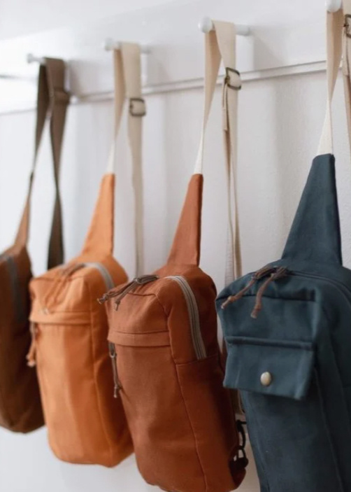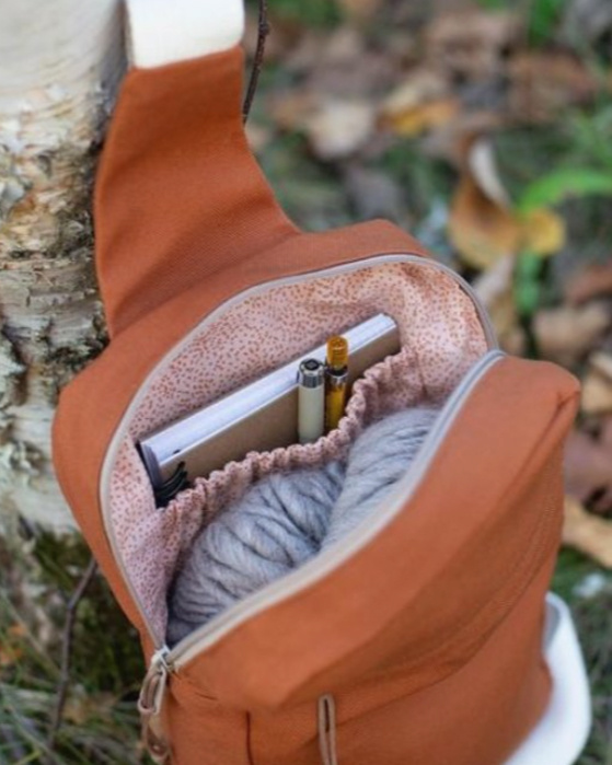 ENGLISH pattern. Sew this "sling" bag to carry your daily essentials. The convenient shoulder strap design makes it easy to access and stays out of the way when not in use. It's compact yet roomy enough for all your essentials. Choose from a front zip pocket or patch pocket, both of which are great for quickly accessing smaller items. The adjustable strap lets you customize the bag to your size. Perfect for biking or everyday use!
