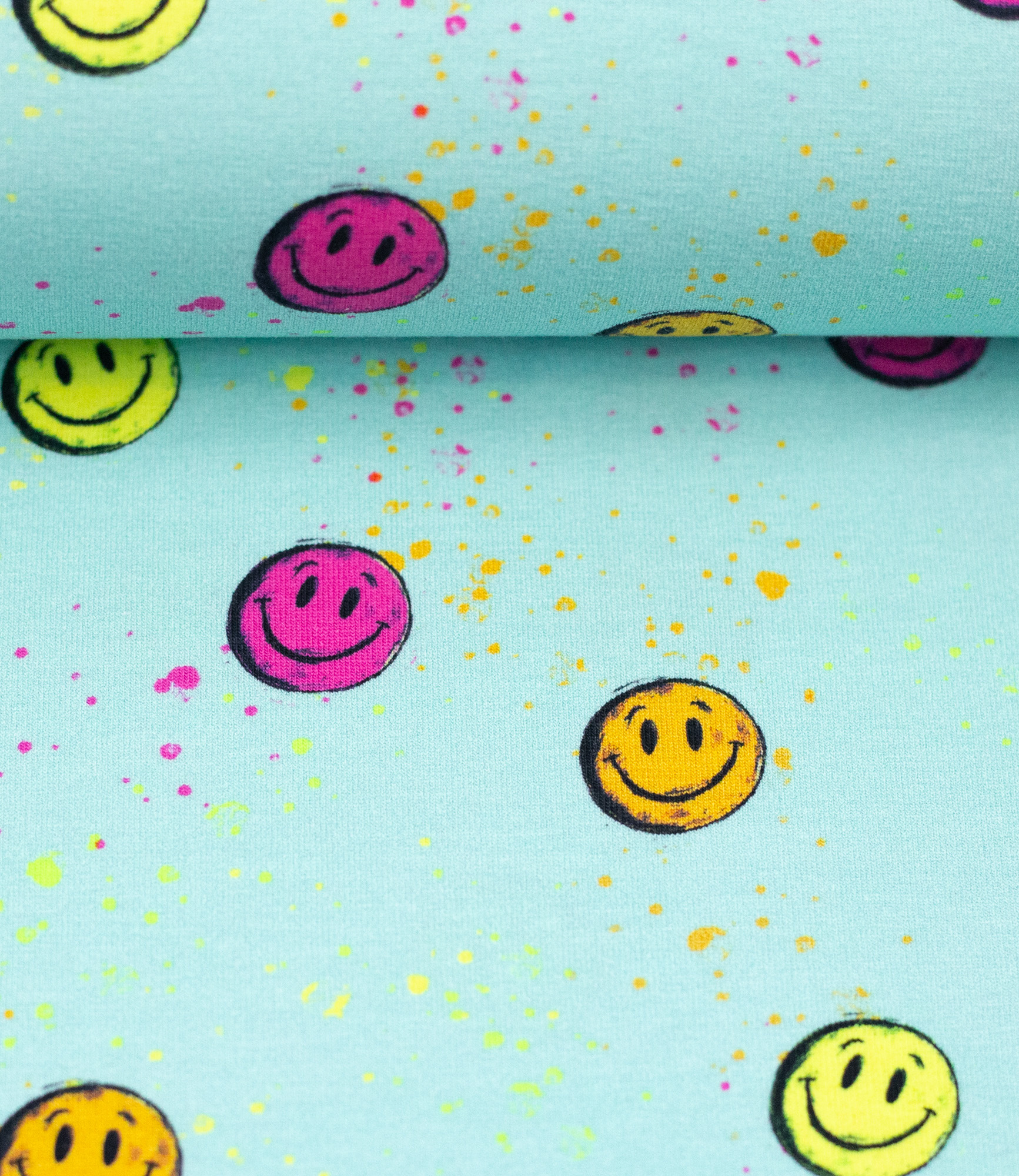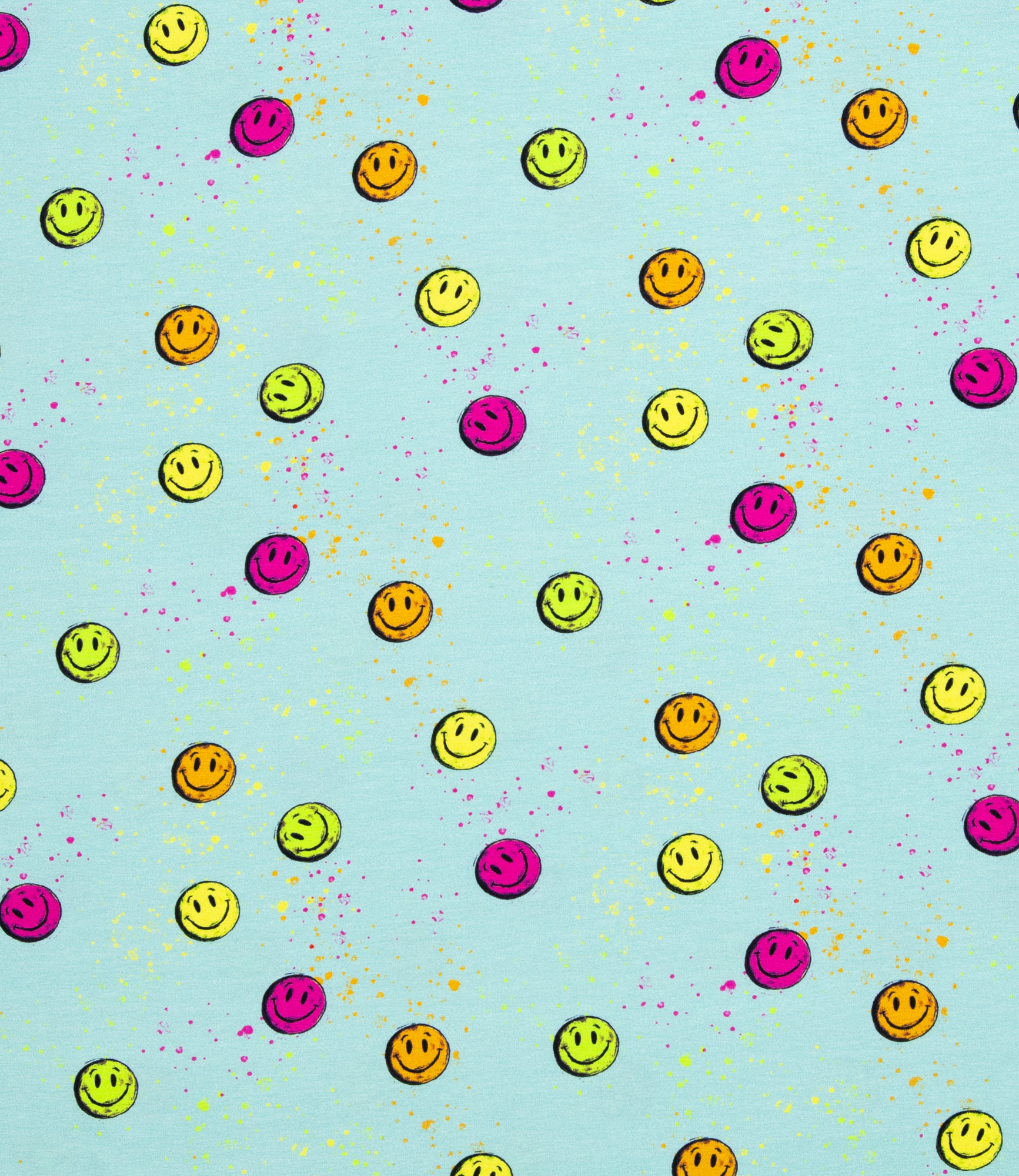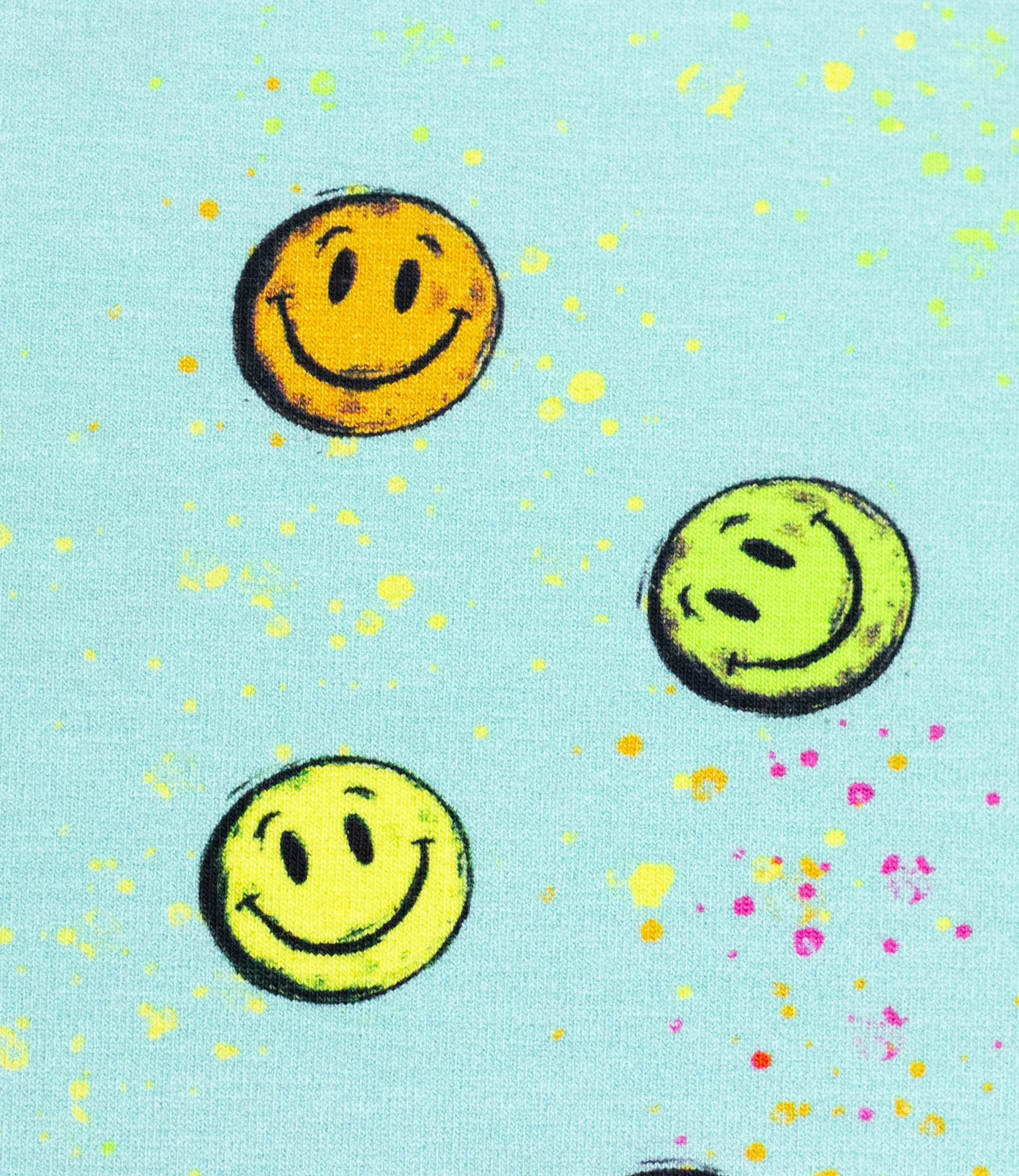 A knit with smiley faces. Perfect for T-shirts, rompers, leggings, dresses, and more.