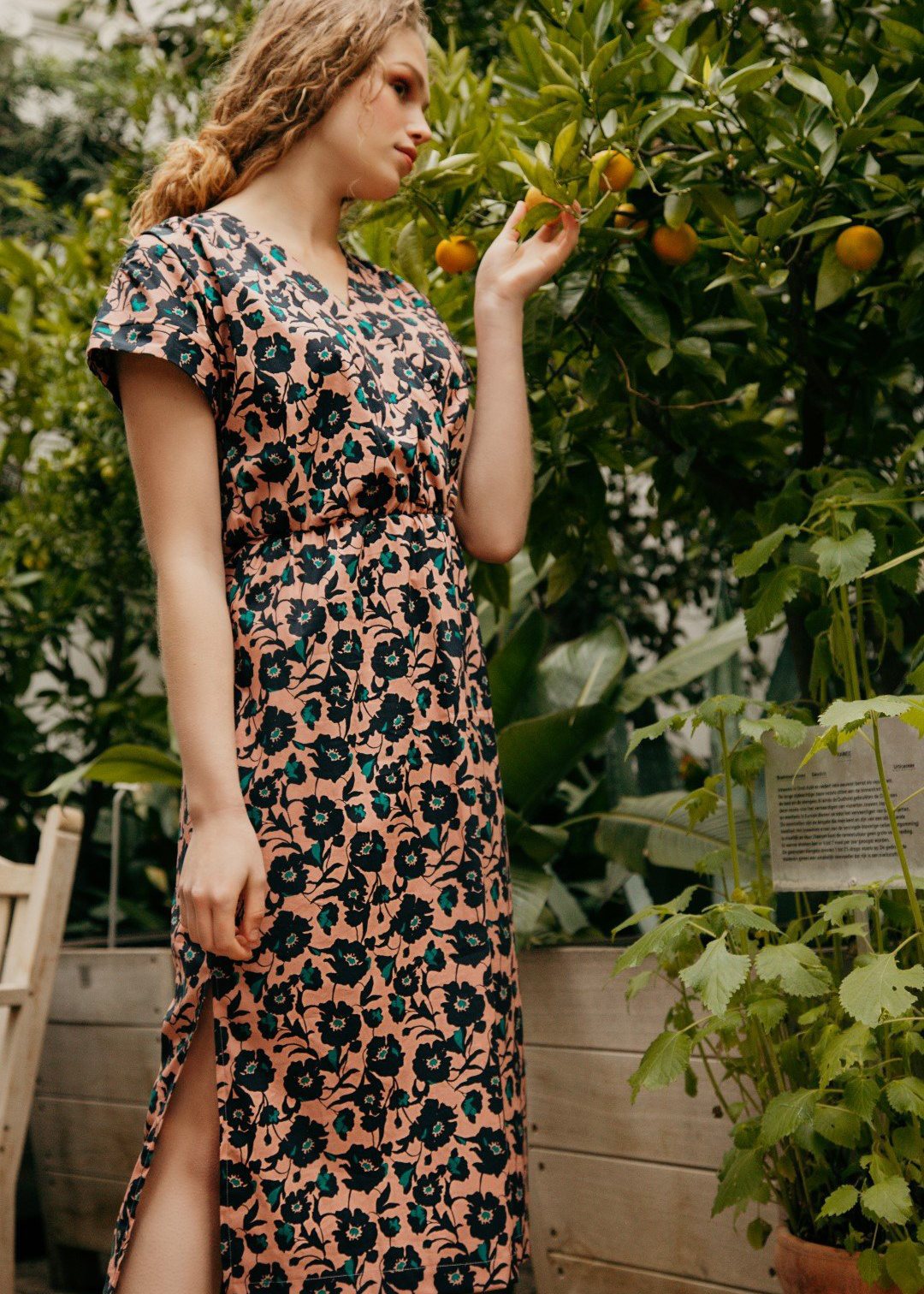 Solange is a wonderful summer dress with a nice V-neckline, a gathered front at the shoulder seams and elegant cuffs at the sleeves. The midi skirt with side slits gives the dress a nice breezy effect. The dress comes with an elastic in the waist so it fits perfectly. You can personalize Solange by adding a belt or ribbon, just the way you like it. No doubt this dress will become one of your wardrobe staples!