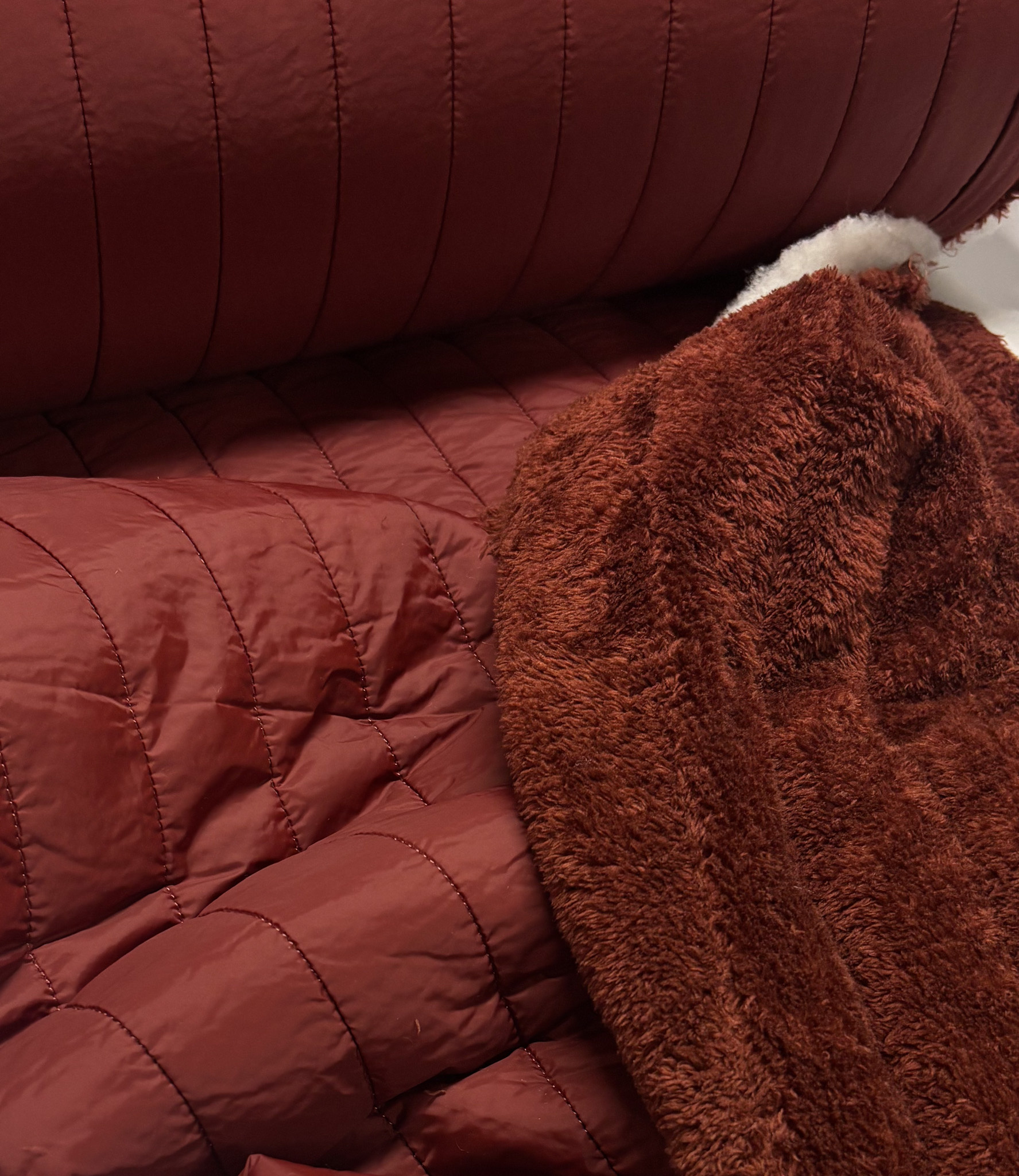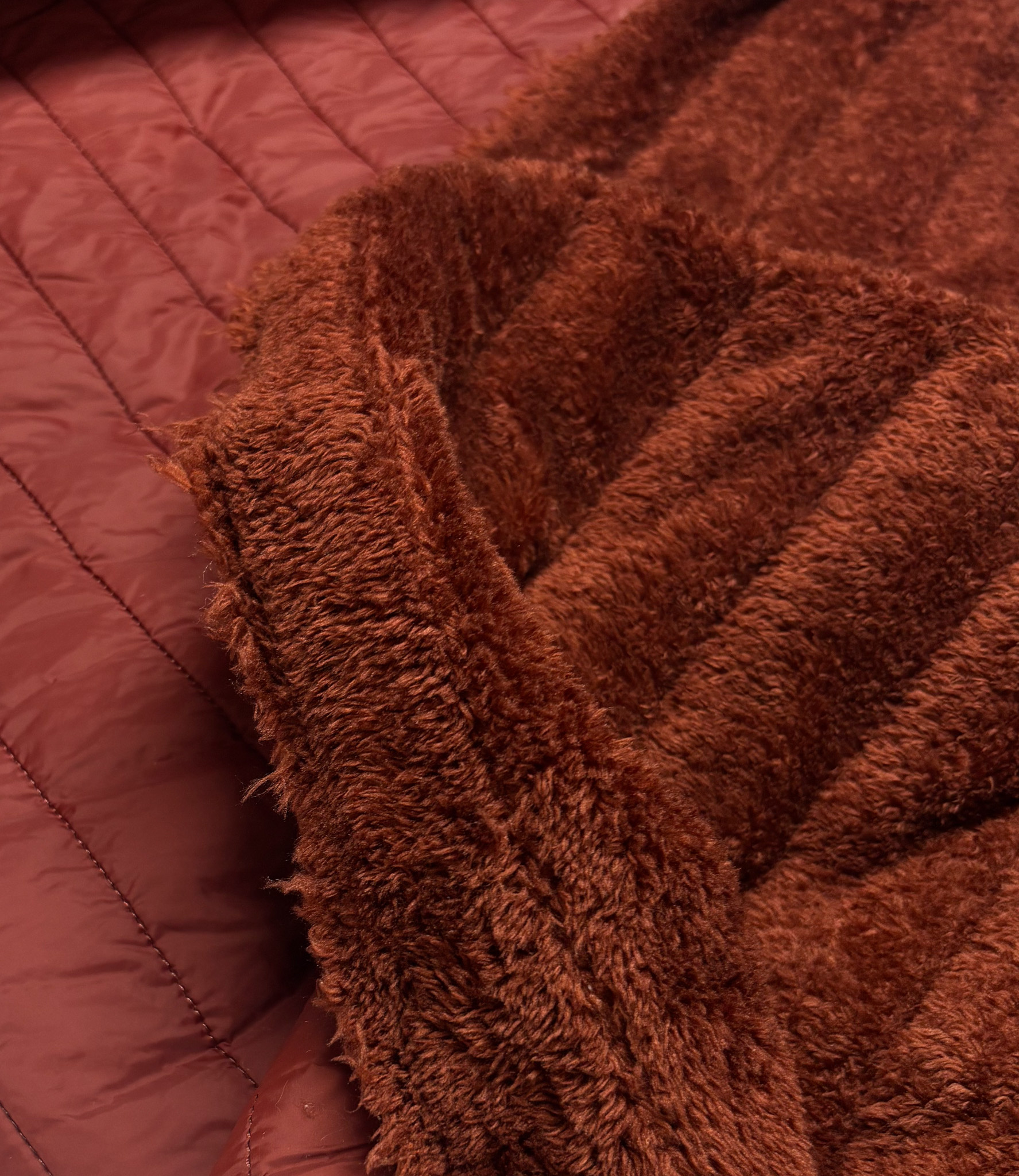 A beautiful quilted and quilted coat fabric. Inside, this fabric has a soft and warm layer of teddy fleece. Perfect for coats and cardigans. The fabric is finished on both sides and therefore does not need to be lined. This fabric is water-repellent.