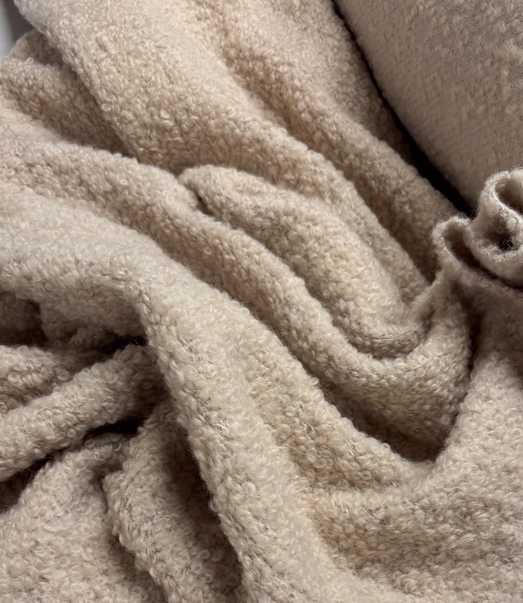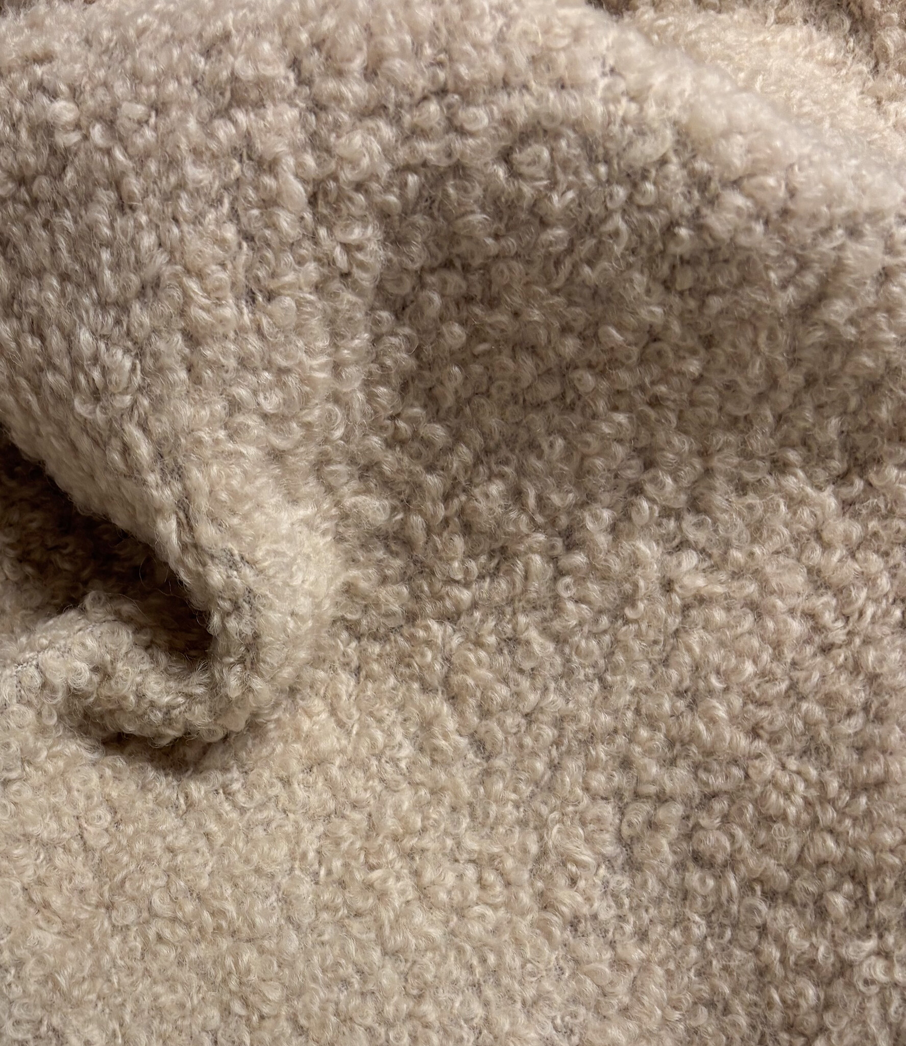 A beautiful teddy bouclé fabric made with 75% wool. Perfect for coats, cardigans, and warm sweaters.
