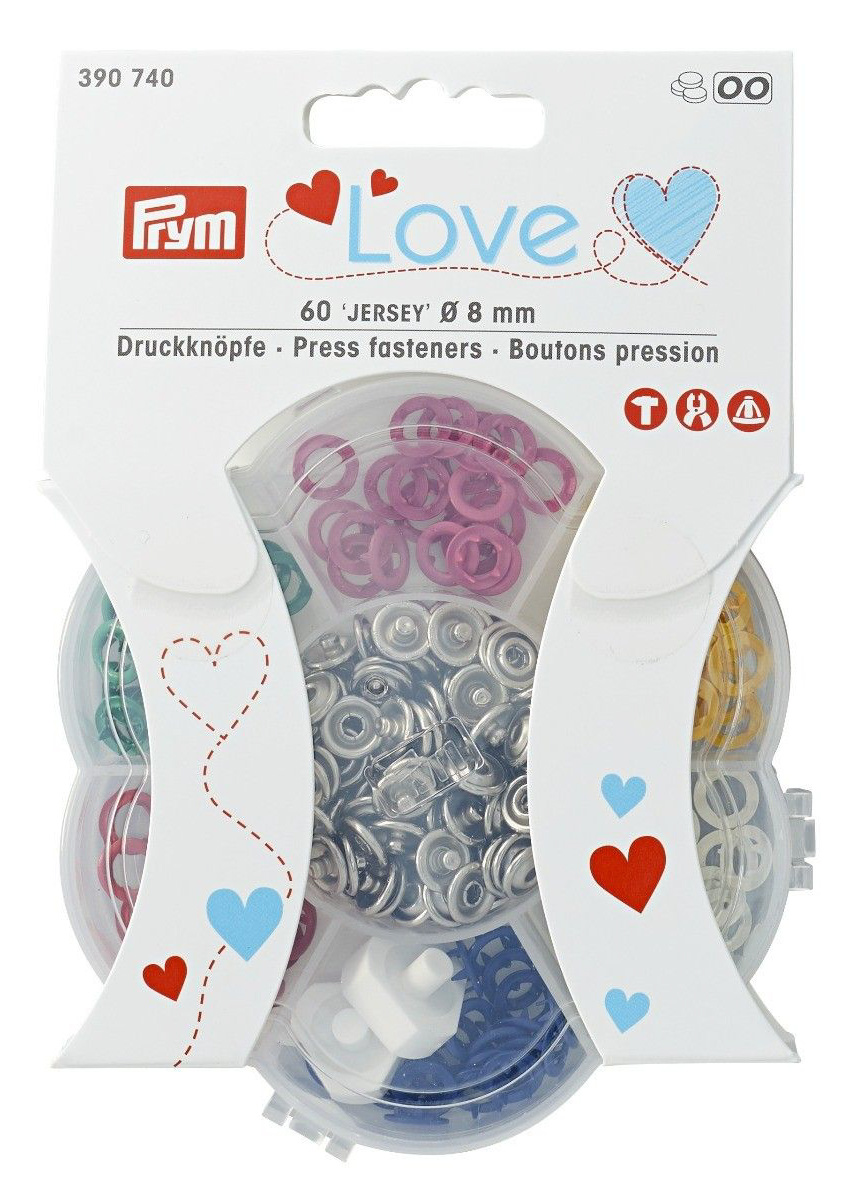 Doos met kleurgesorteerde drukknopen. Ideaal voor op dunne, rekbare stoffen, zoals jersey.