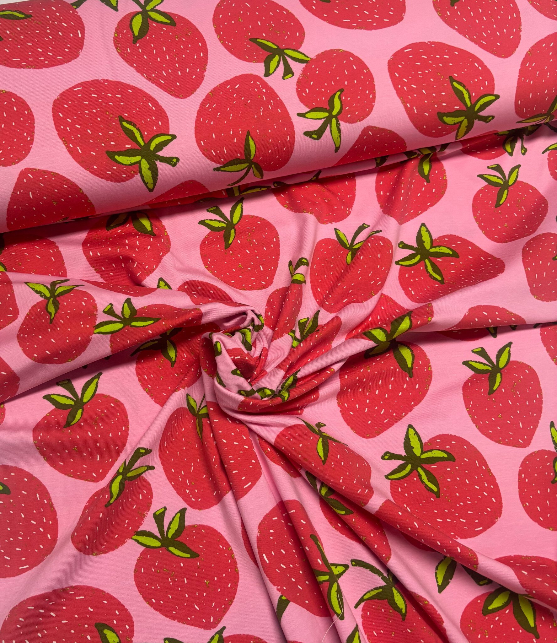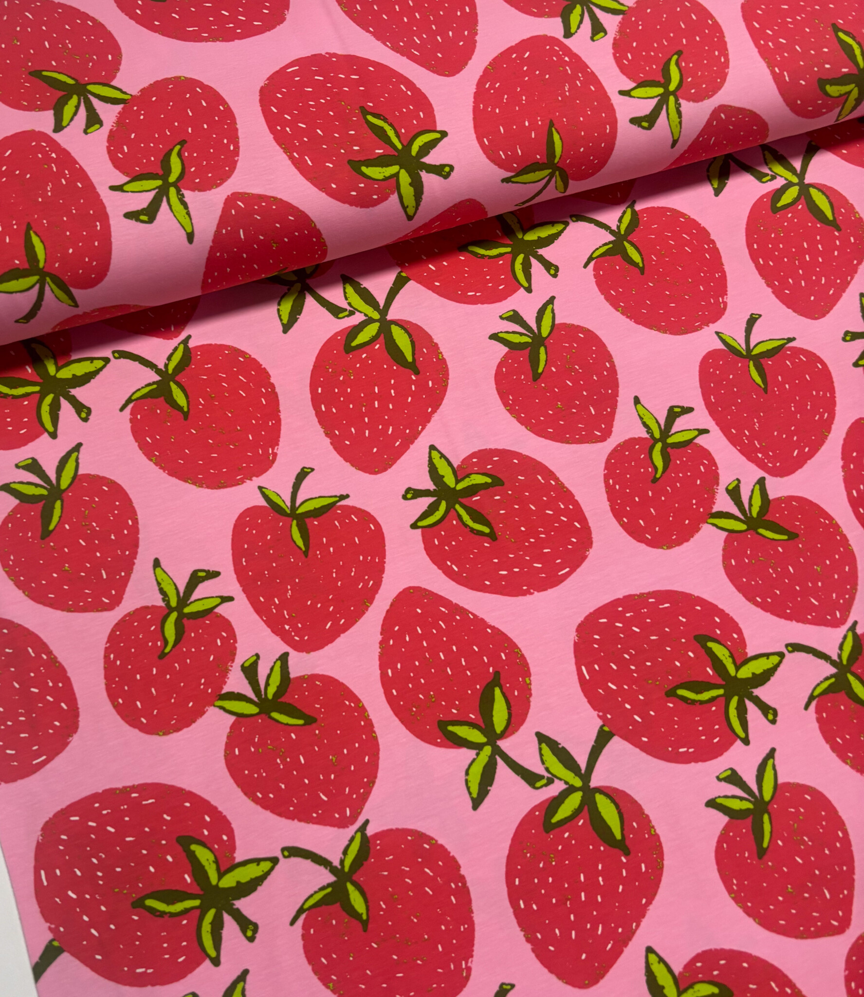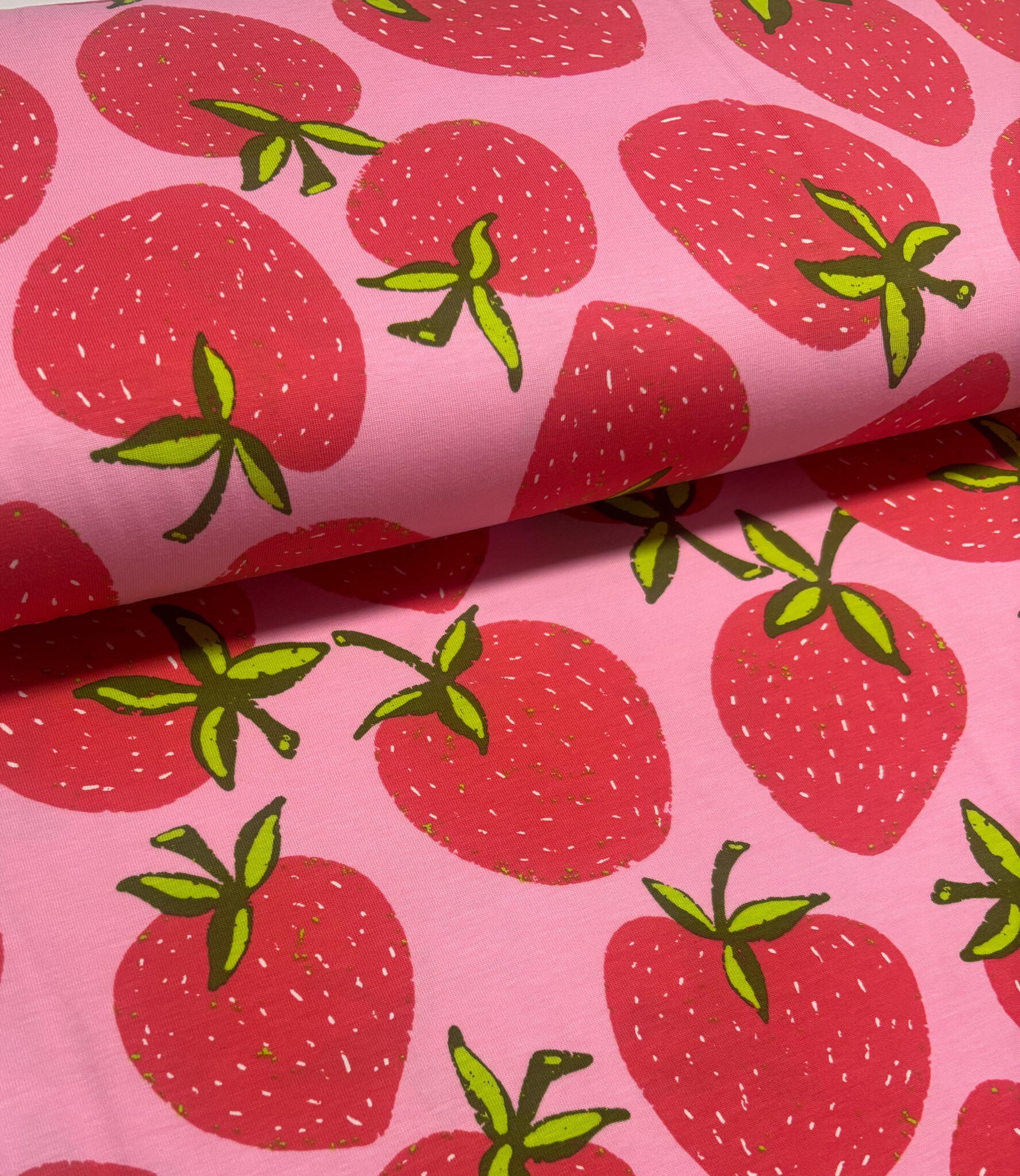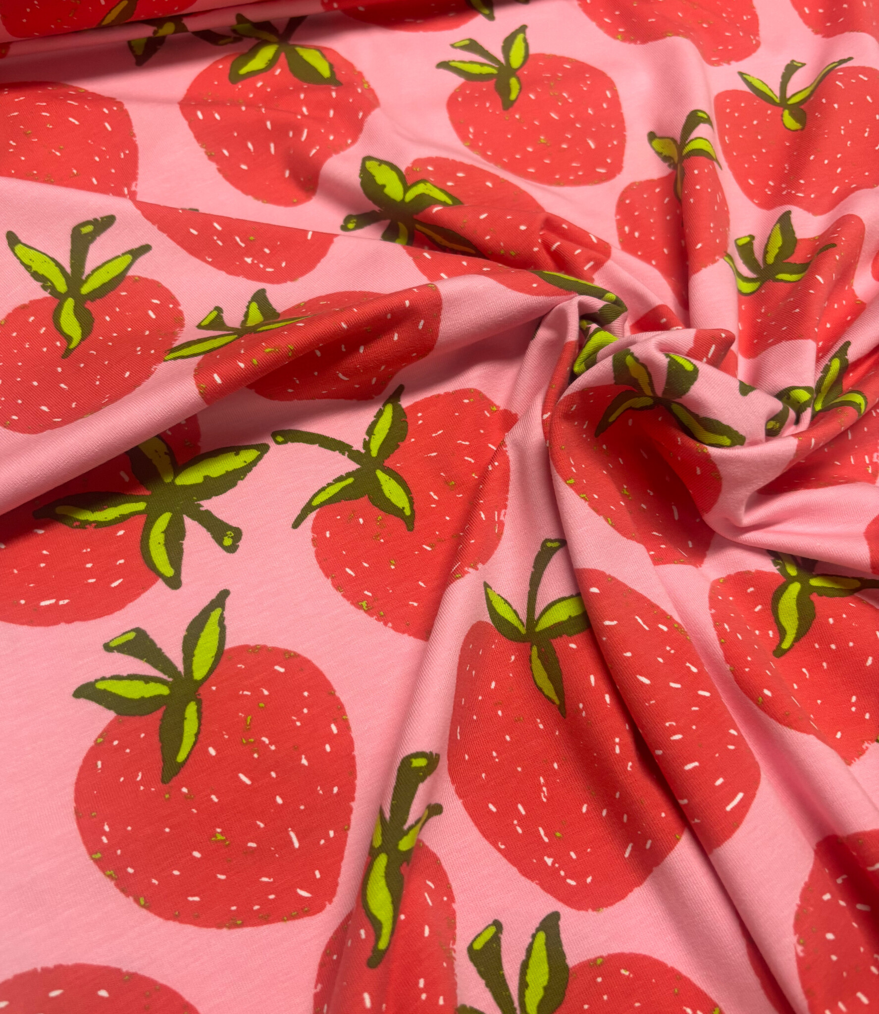 Een tricot met aardbeien. Oeko tex. Perfect voor t-shirts, leggings, ...