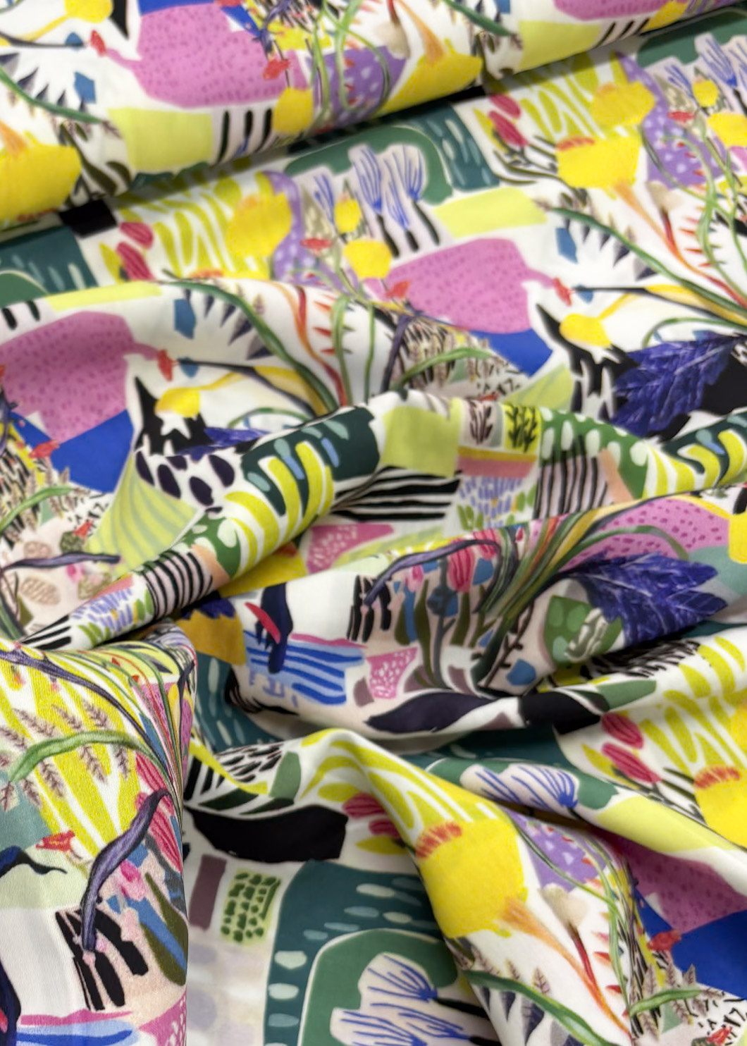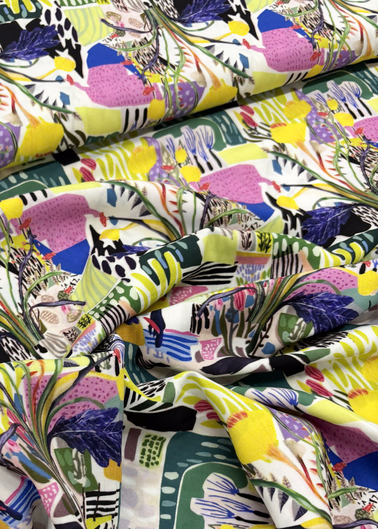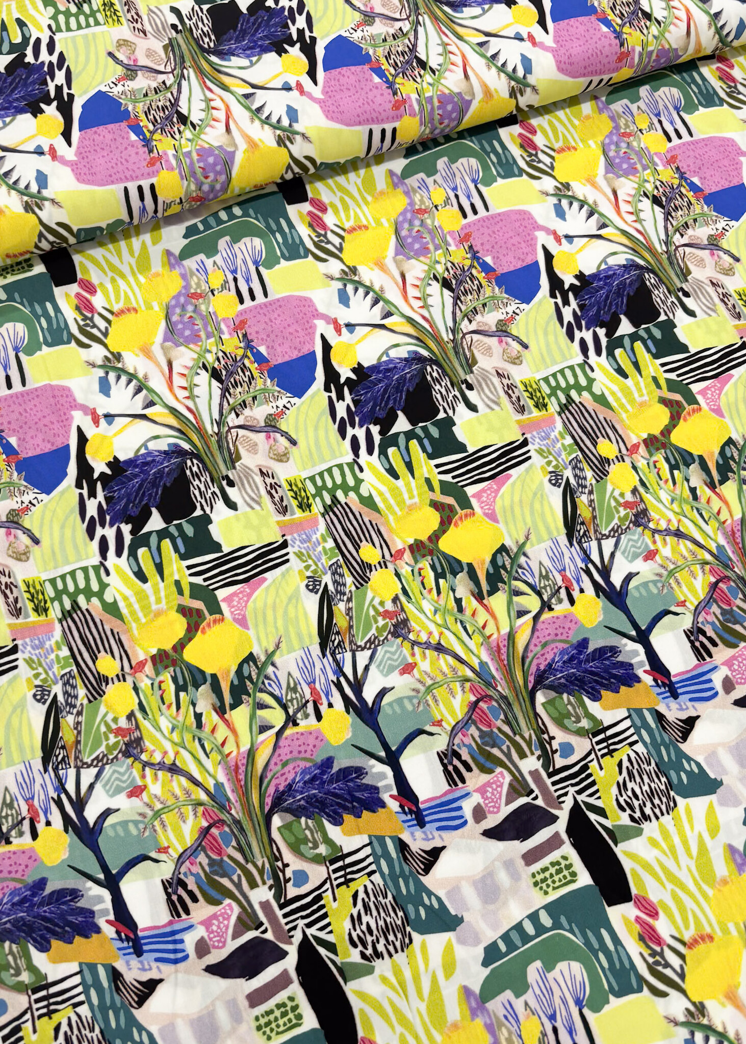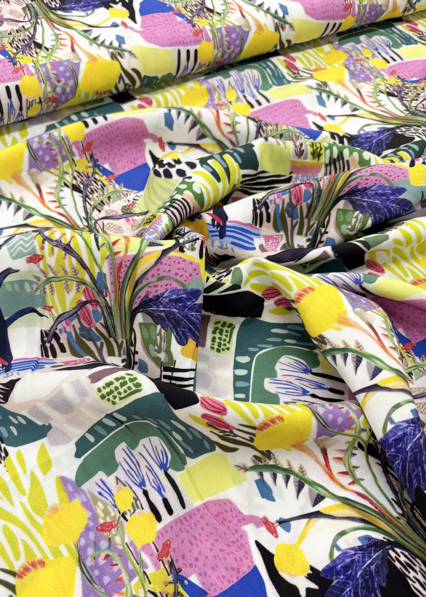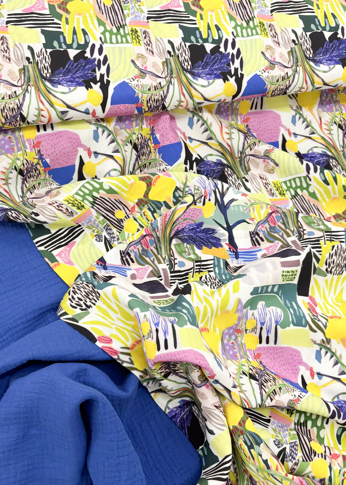Een mooie en soepele viscose met abstracte landschapssprint. Ideaal voor een blouse, jurk of losse broek.