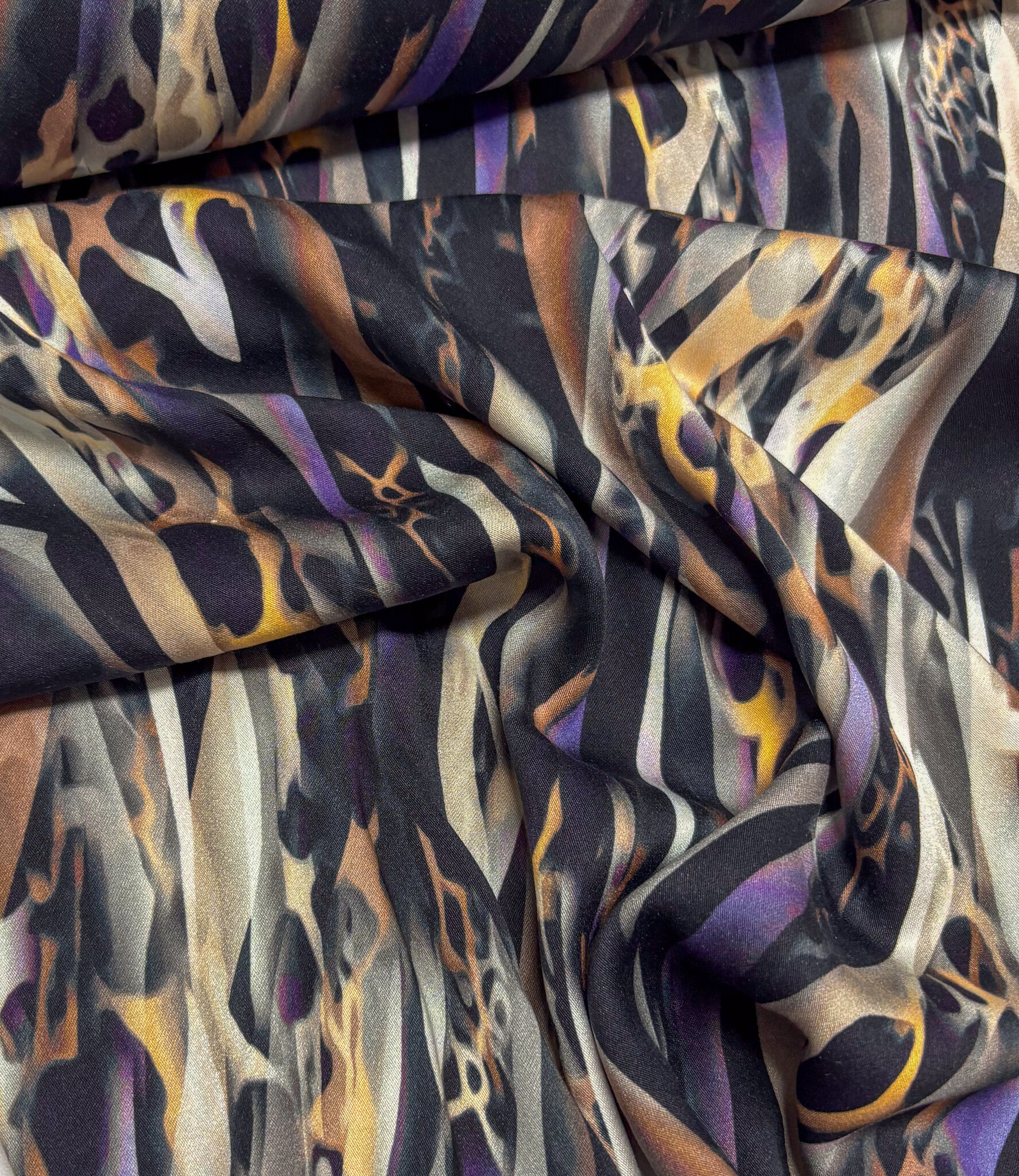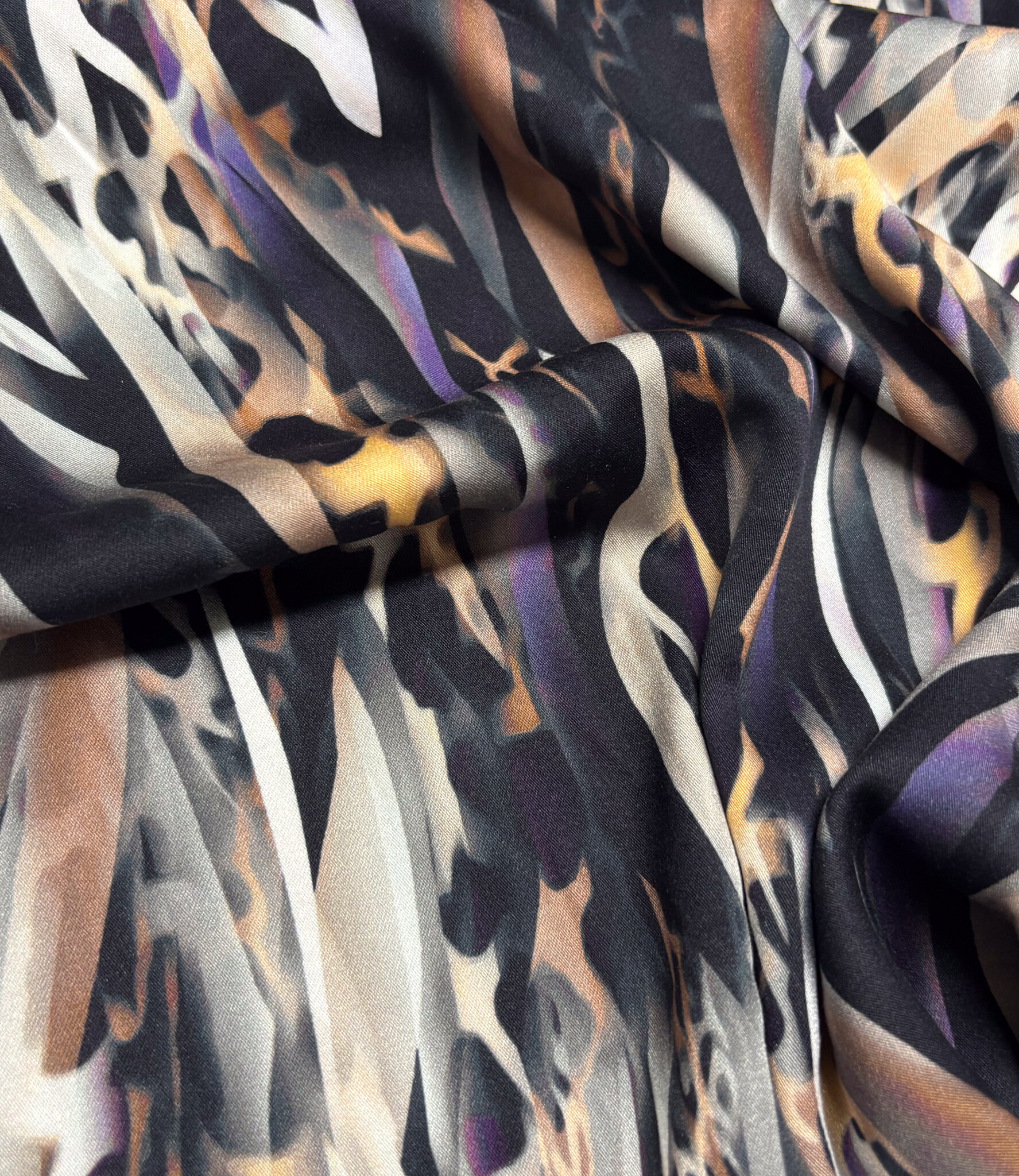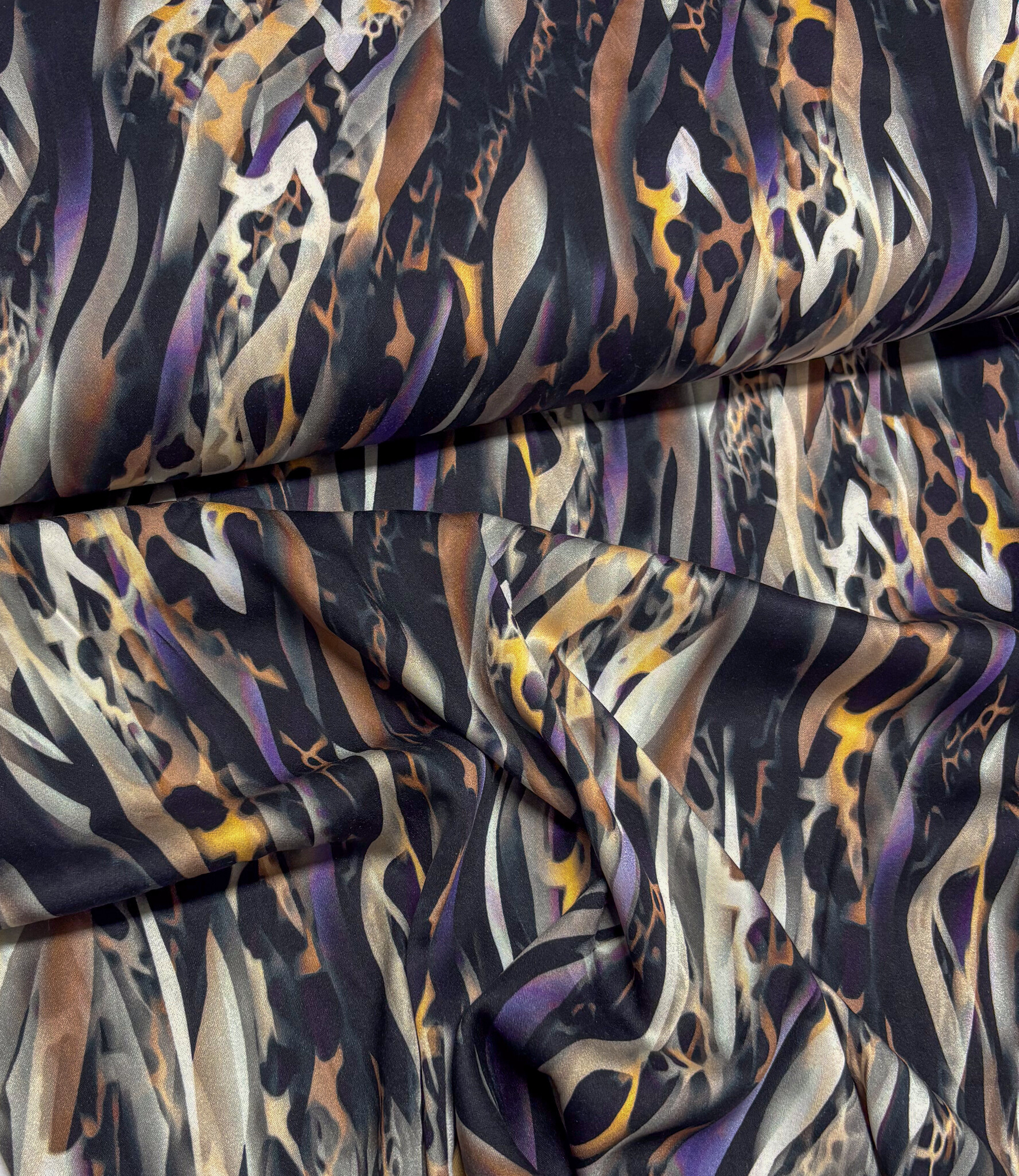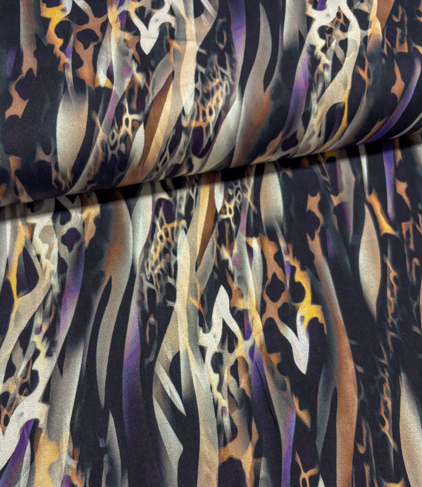 Een viscose met abstracte dierenprint. Deze stof rekt een klein beetje mee voor comfort.