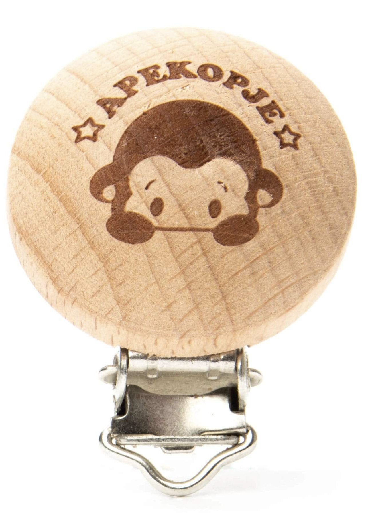 Een schattige fopspeenklem van glad hout met tekst "Apekopje".