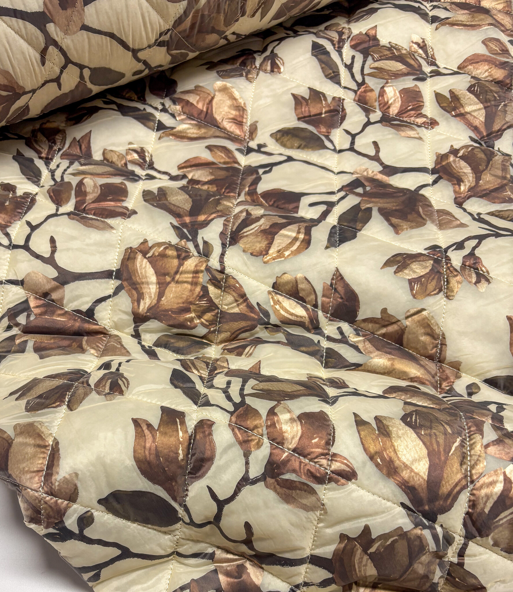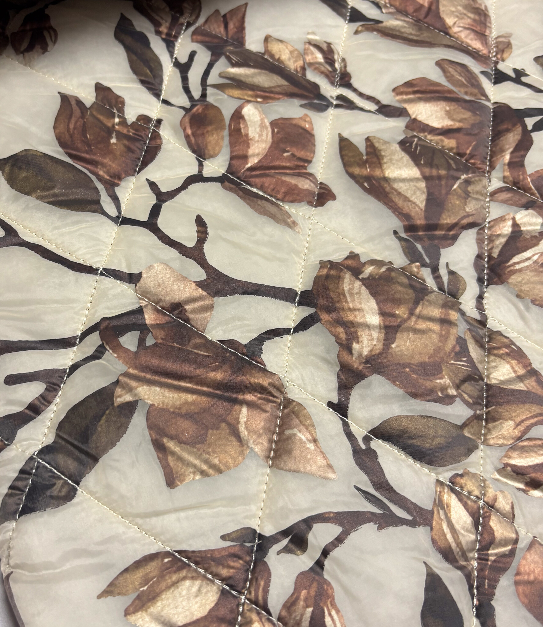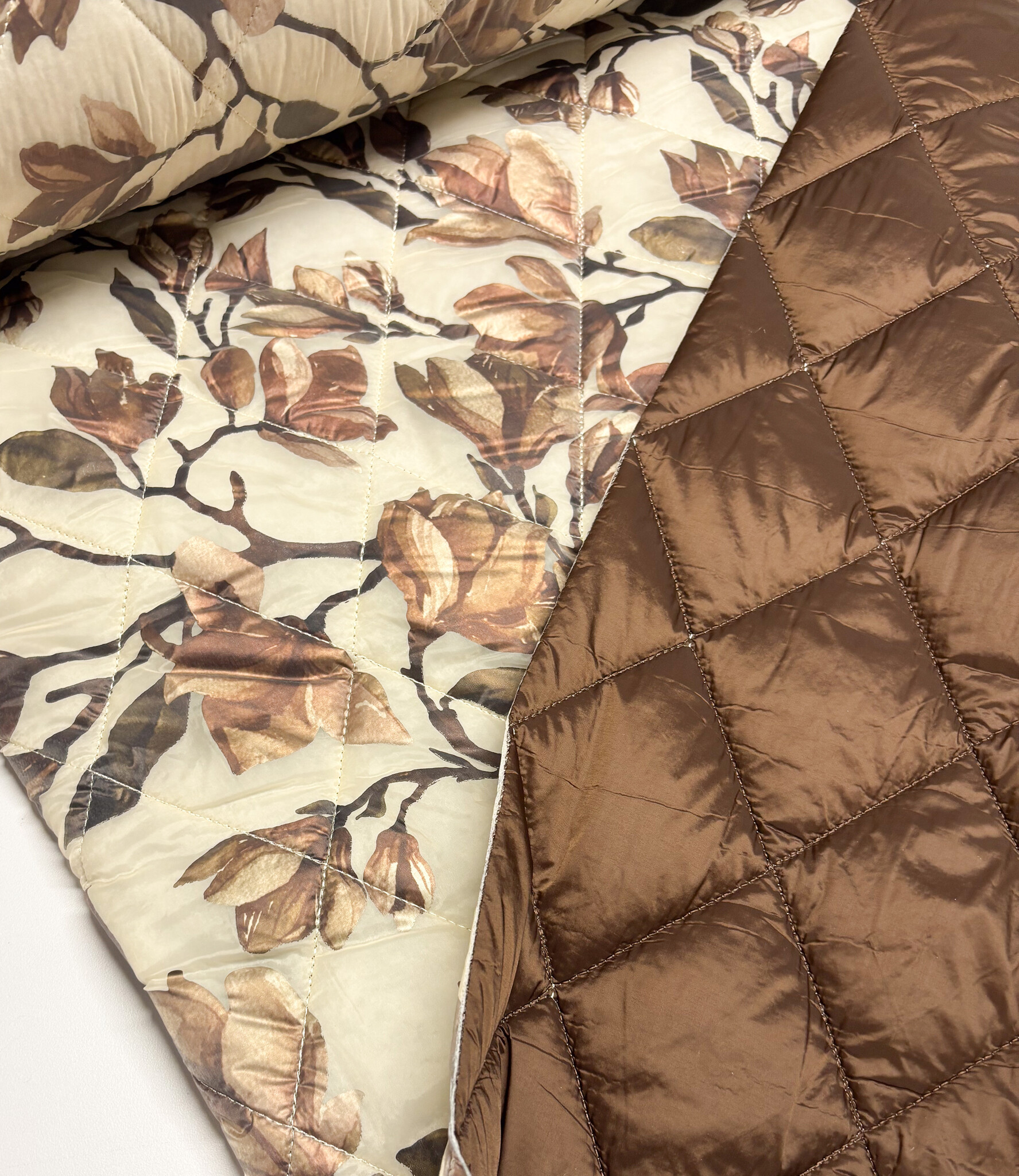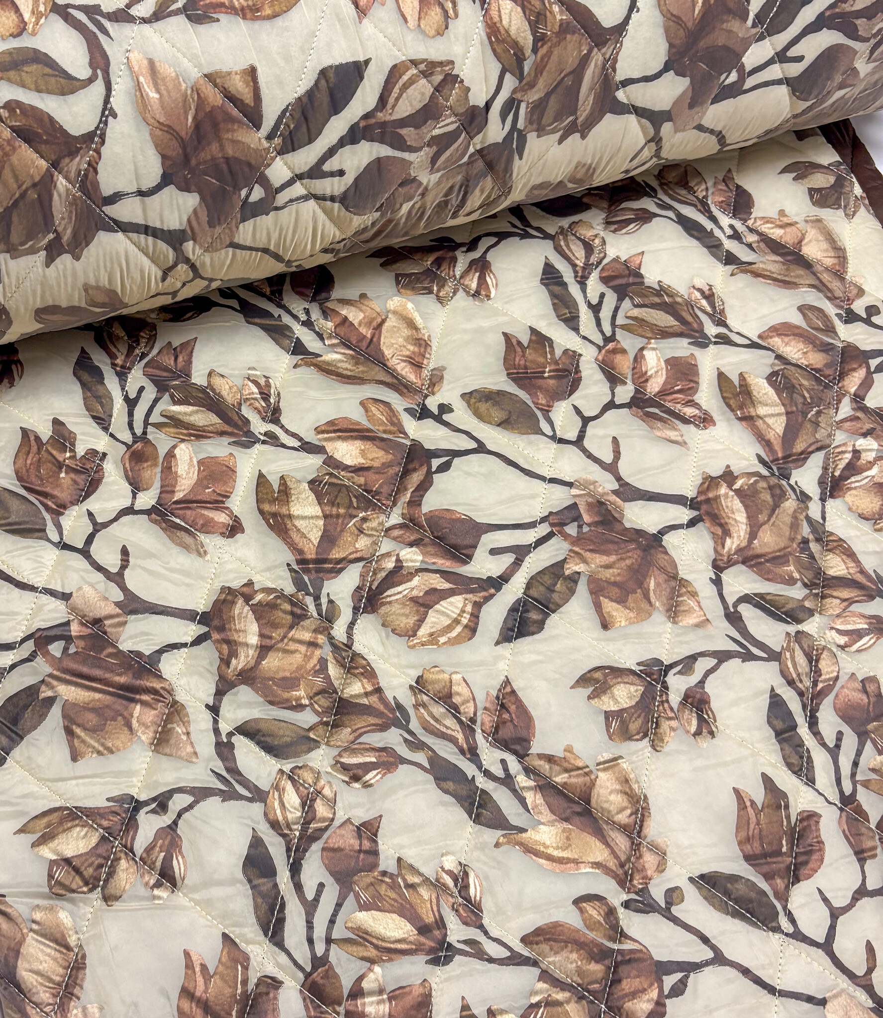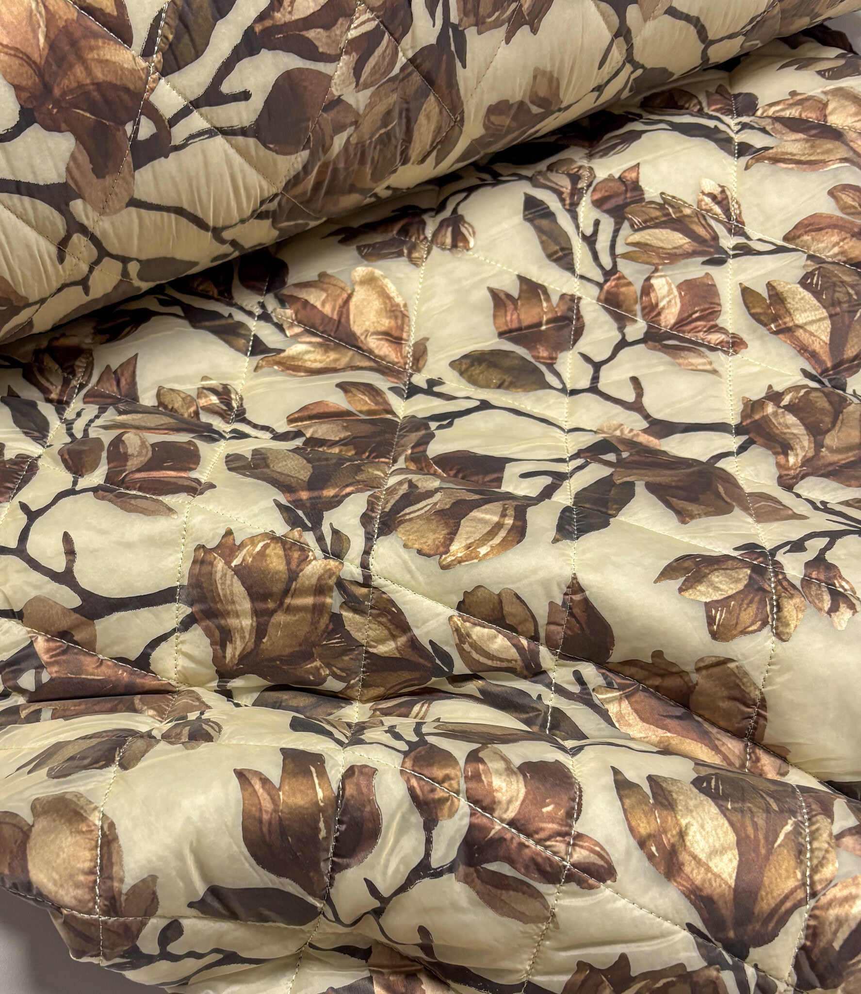 Hele mooie doorstikte en gematelasseerde pufferstof met bloemen. Heel mooi voor mantels en vestjes. De stof is aan twee kanten afgewerkt en moet dus niet gevoerd worden. Deze stof is waterafstotend.