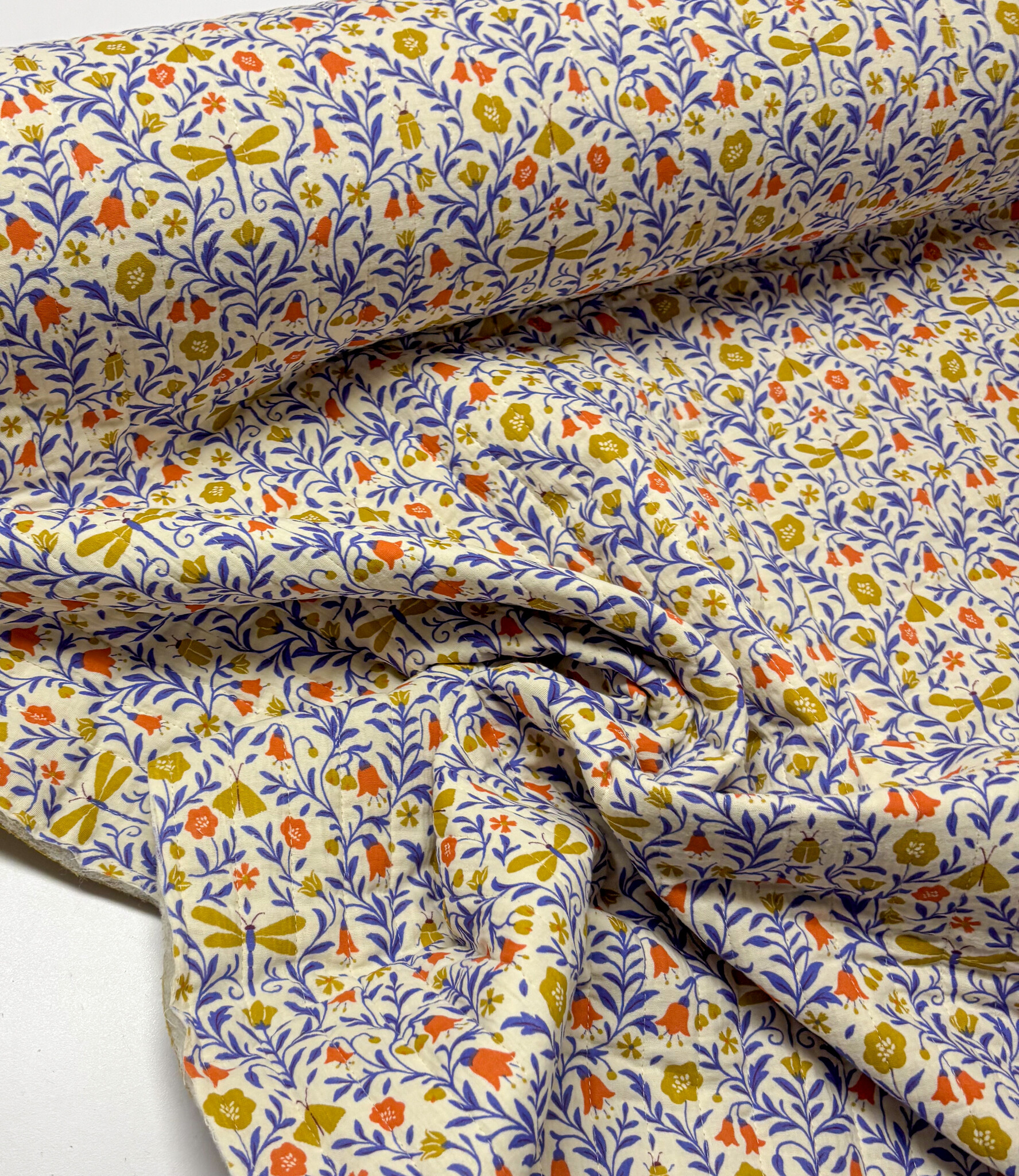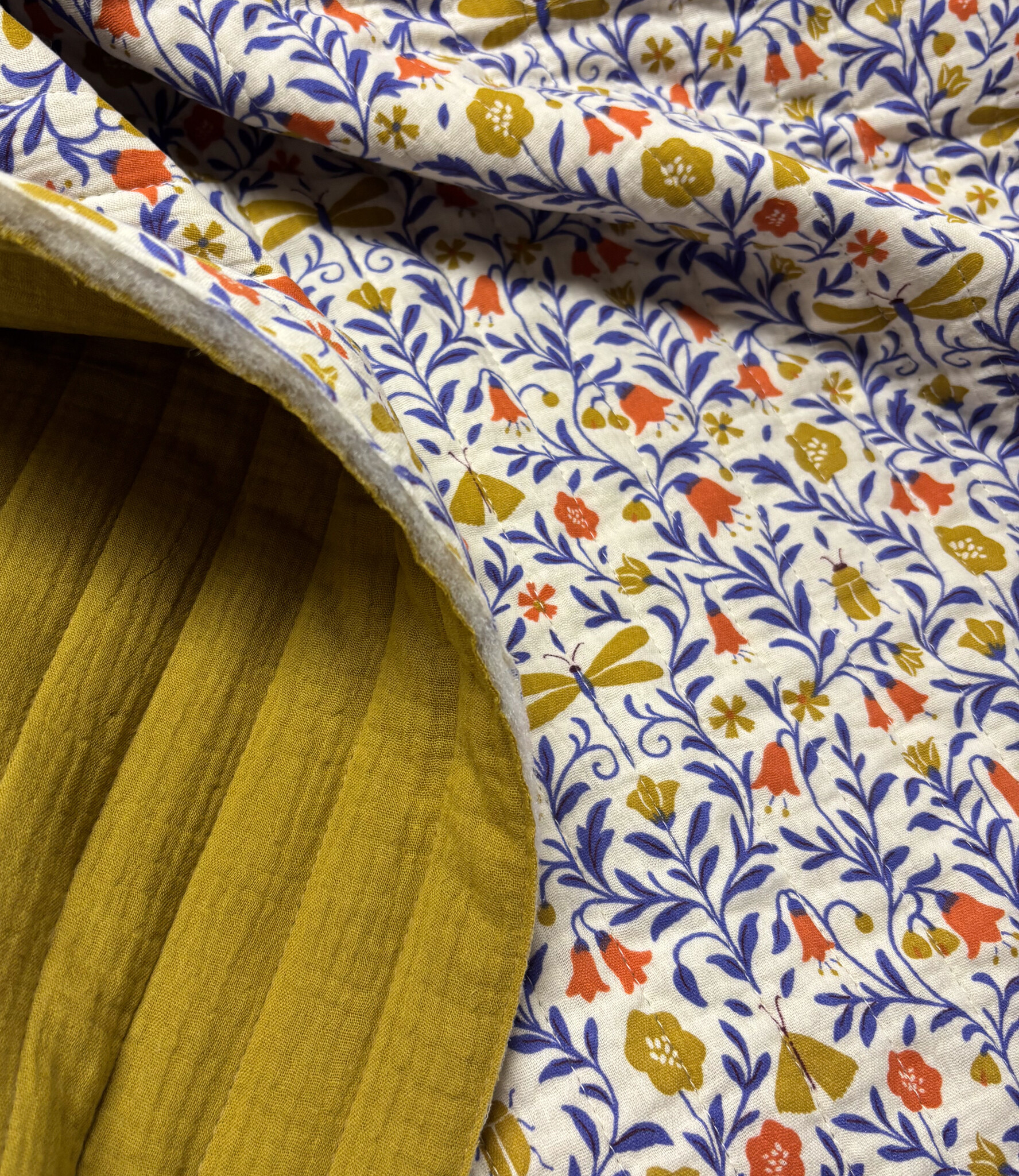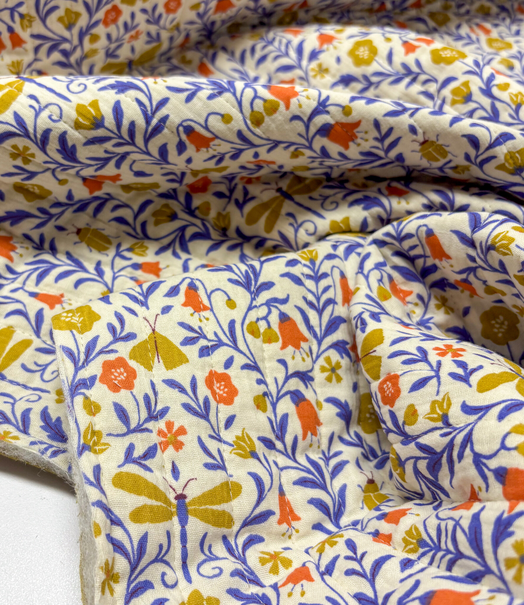 Een zachte gewatteerde double gauze tetra met abstracte print. Double face, dus deze stof is bruikbaar langs beide kanten. Aan de ene kant heeft deze stof een mooie print, aan de andere kant is ze effen. Perfect voor jasjes, bodywarmers, dekentjes, toilettasjes, ...