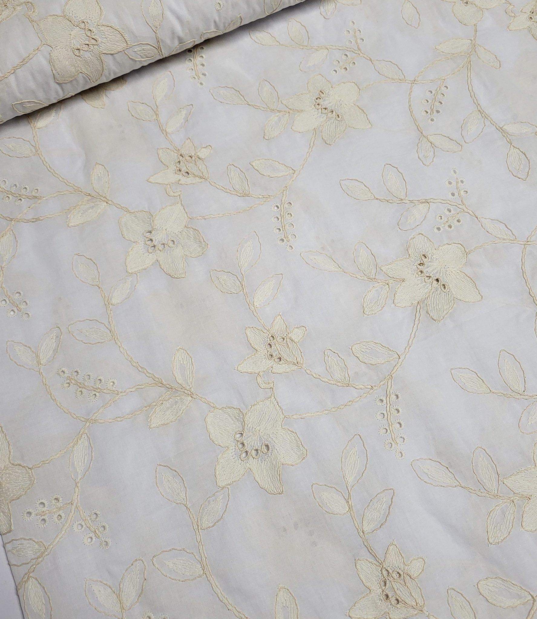 Mooie kwaliteit soepele, zachte fijne katoen met prachtige geborduurde bloemen. Hier en daar is het borduurwerk opengewerkt met kleine gaatjes. Supermooi voor blouses en jurken.