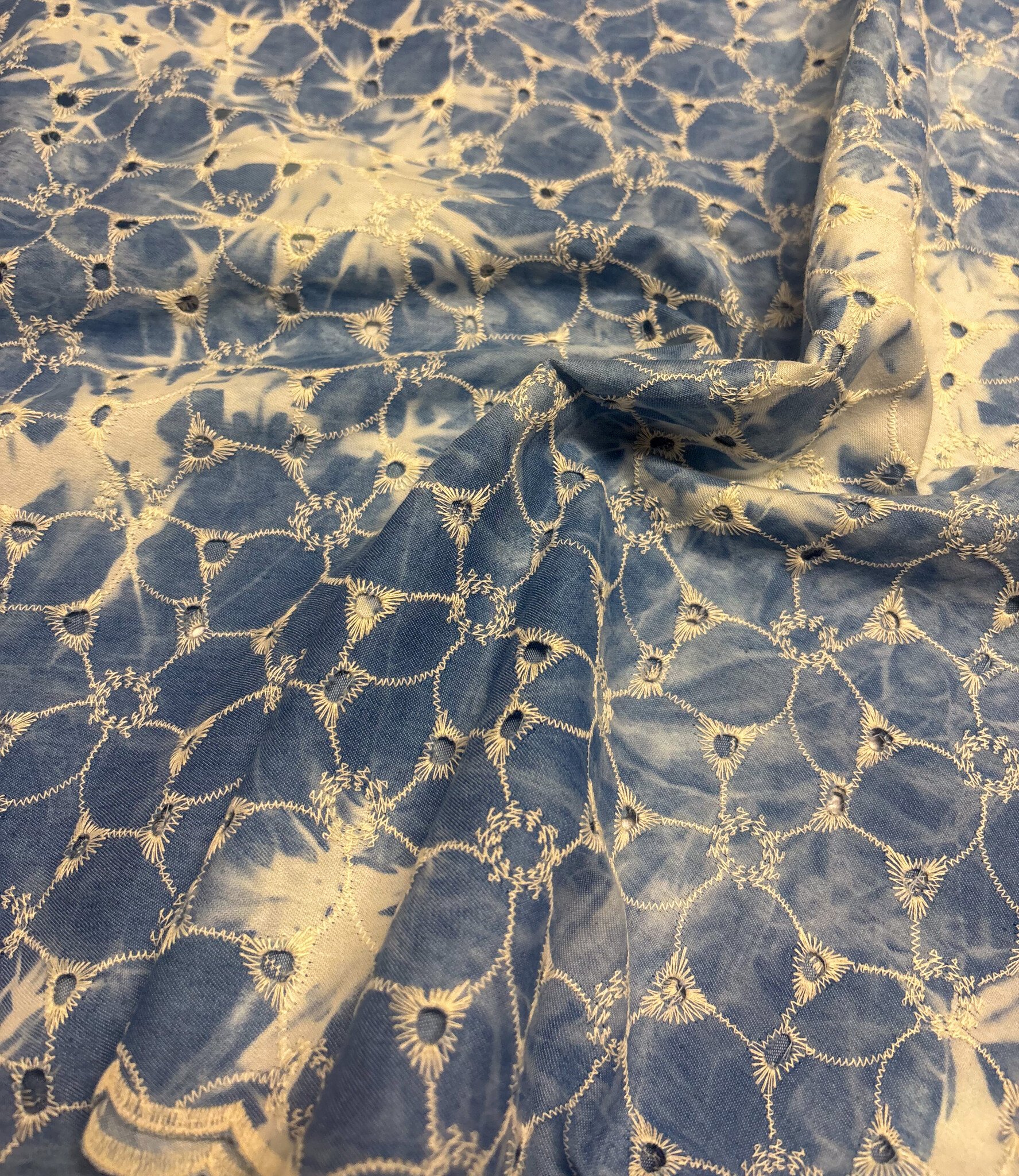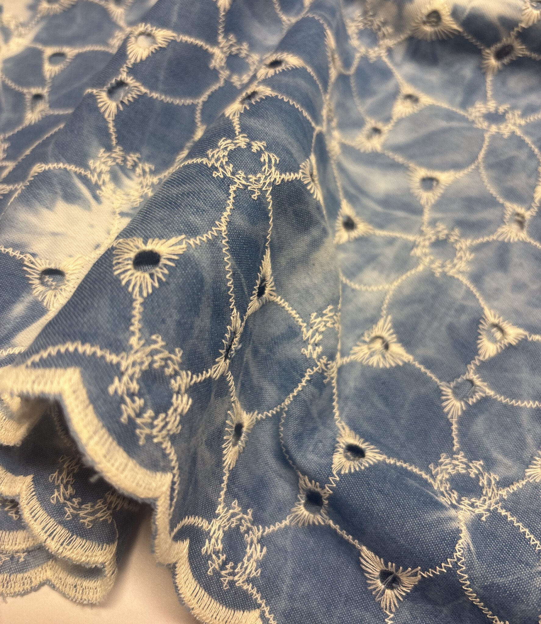 Een prachtige broderie katoen met geschulpte rand. Deze geschulpte rand kan je bijvoorbeeld aan de mouw gebruiken.