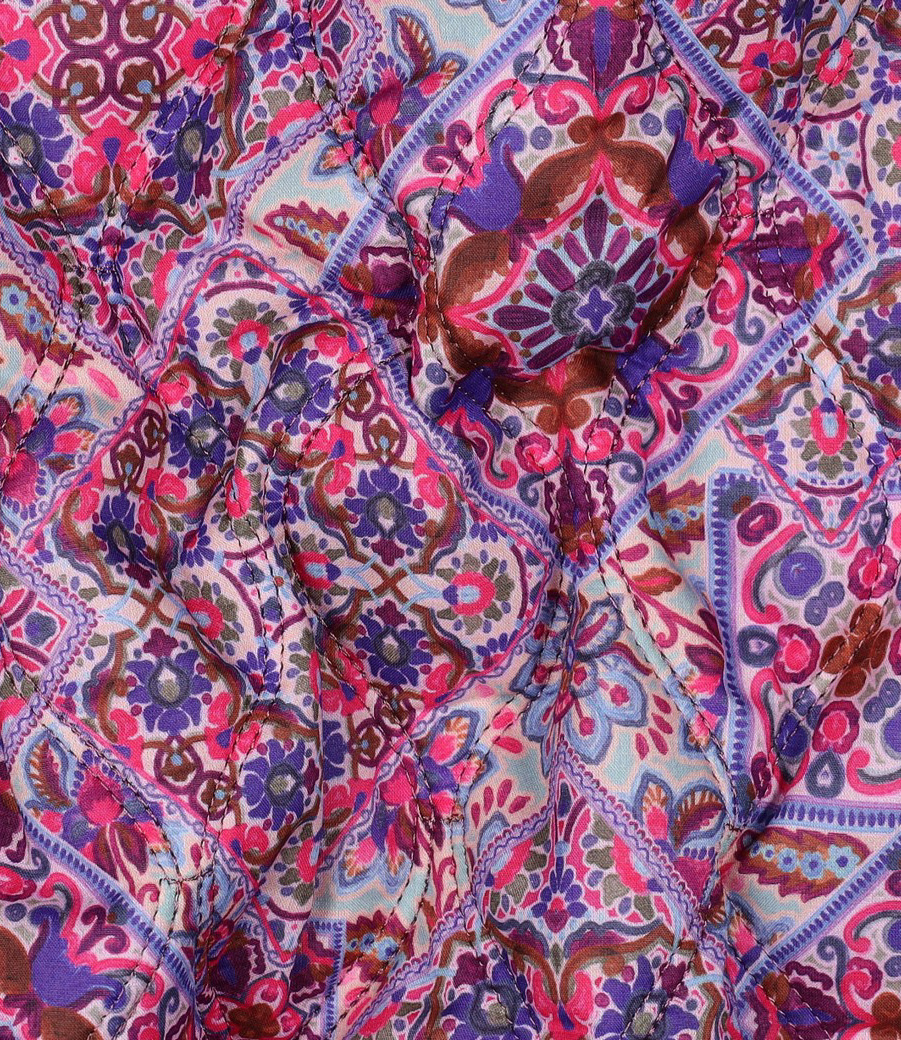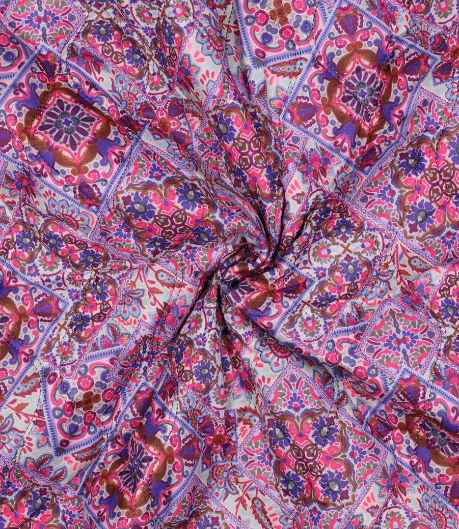 Een gewatteerde katoen met blauwe print. Deze stof wordt gebruikt in Poppy meets Pommé editie 26.