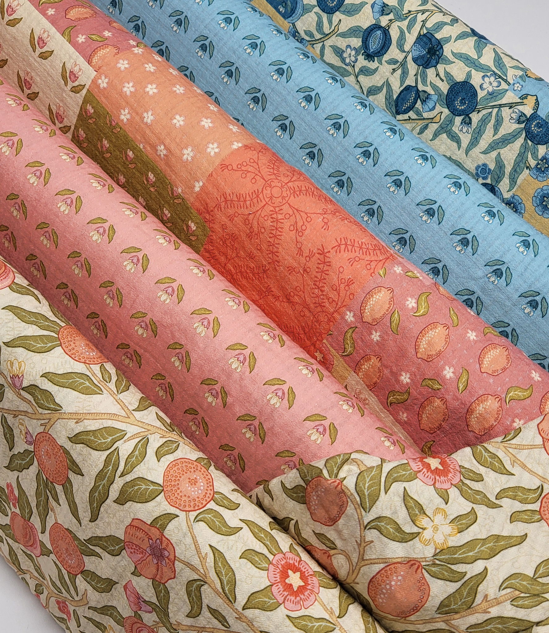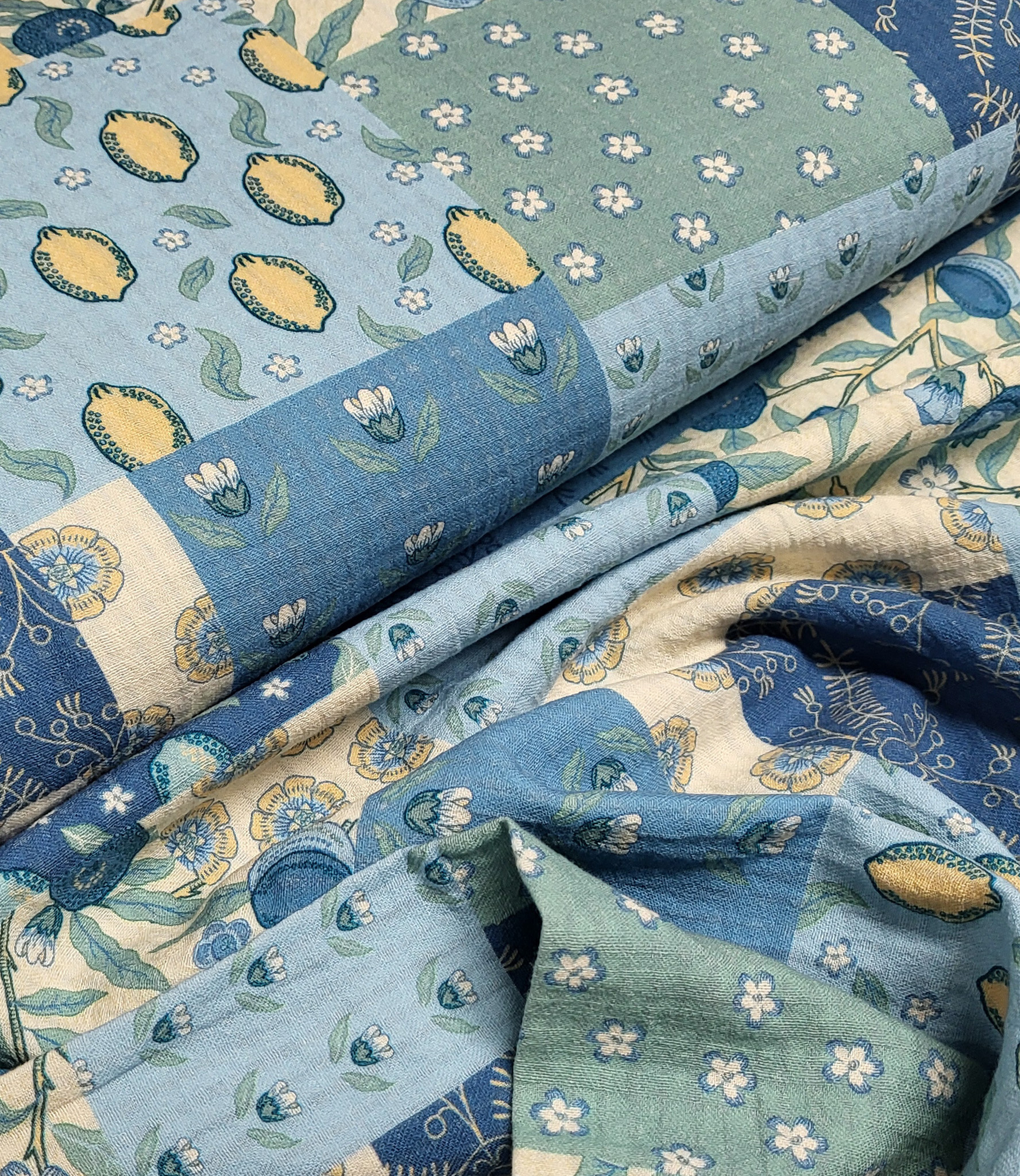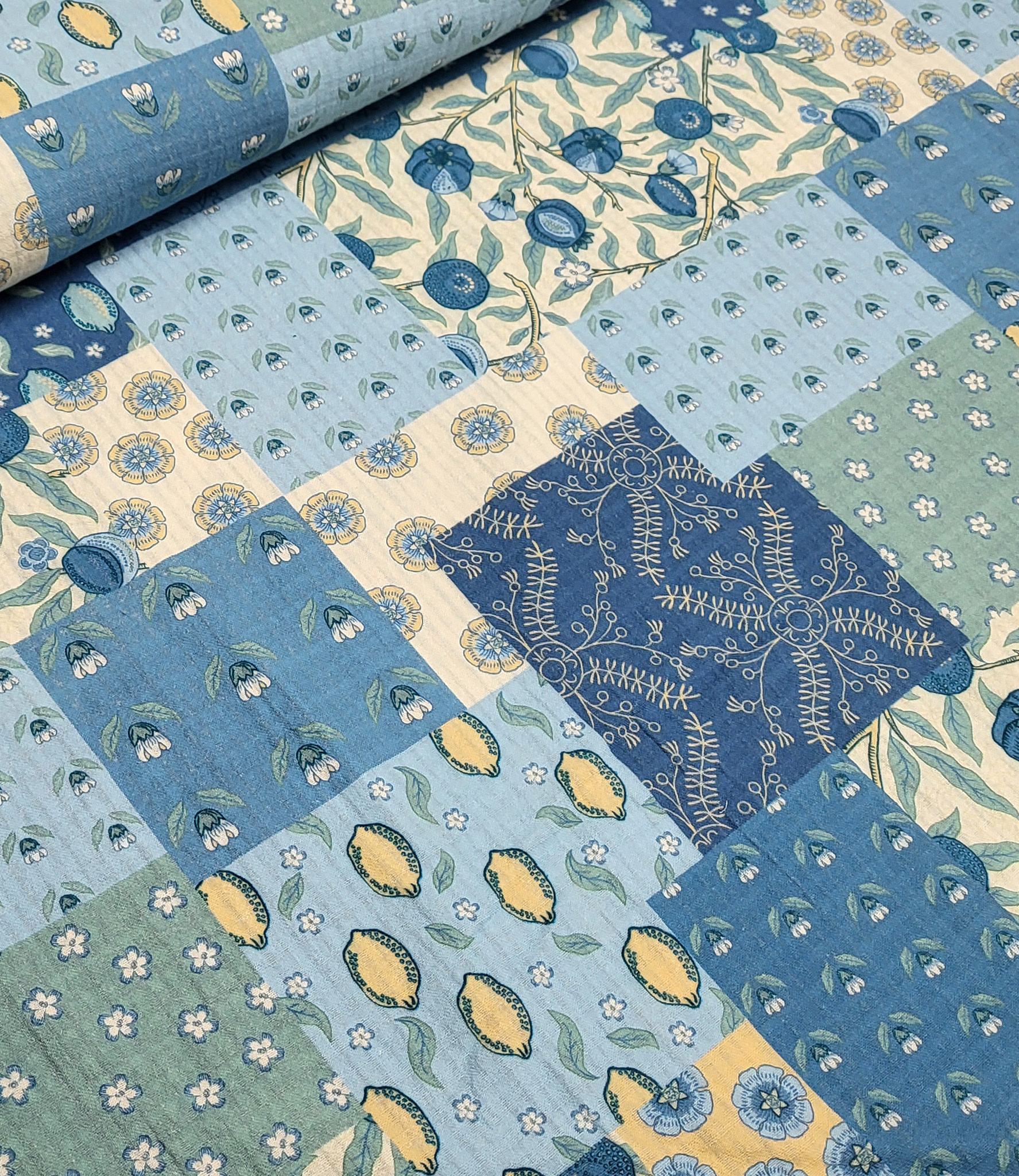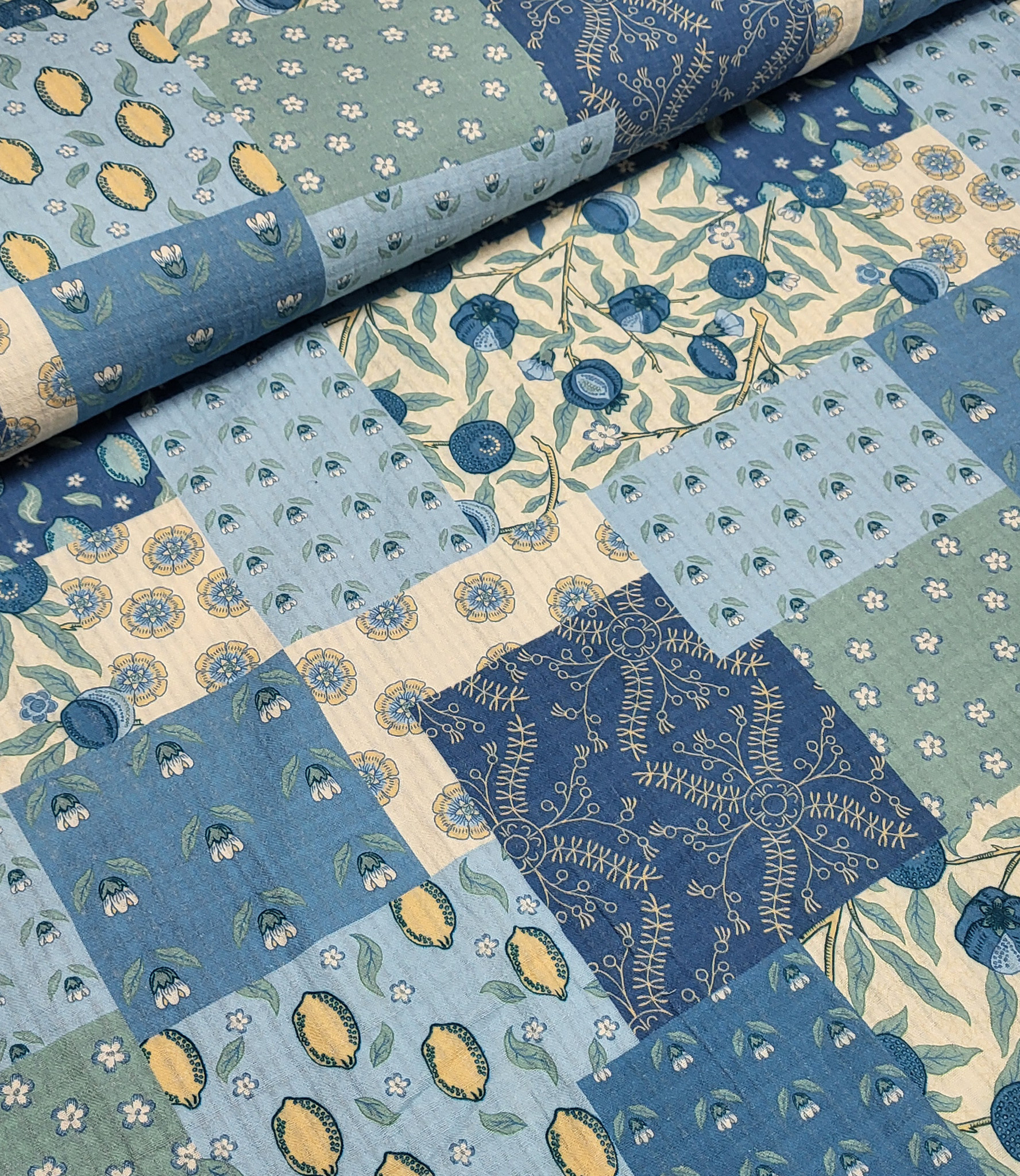 Mooie kwaliteit double gauze met verschillende printjes, patchwork look. Perfect voor kleedjes, tops, T-shirts en voor baby- en kinderspulletjes (babynestje, dekentje, ...). Heerlijk zacht. OEKO-tex.