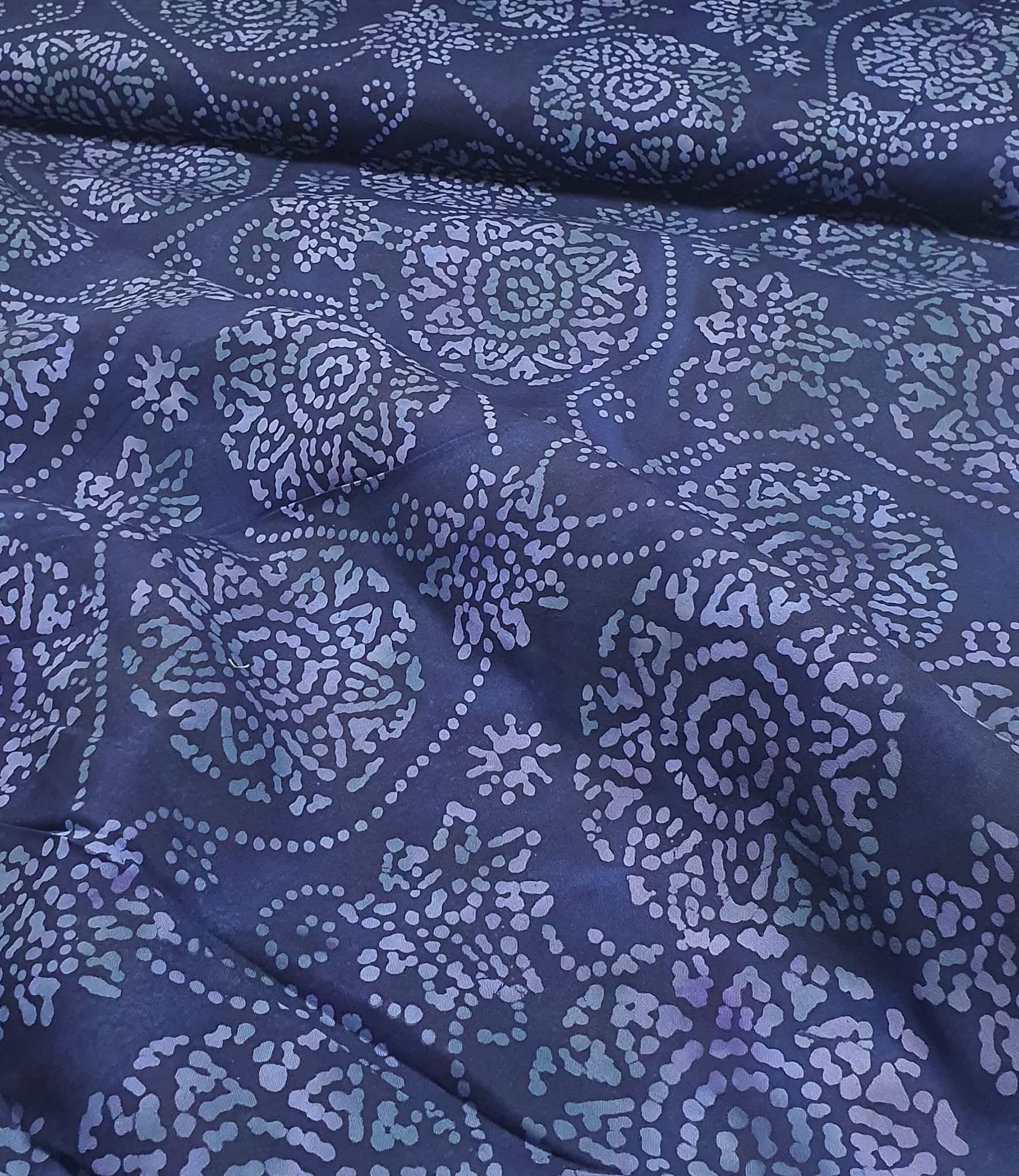 Een prachtige viscose met blauwe batikprint. Supermooi voor luchtige en soepelvallende kleding. OEKO-tex.