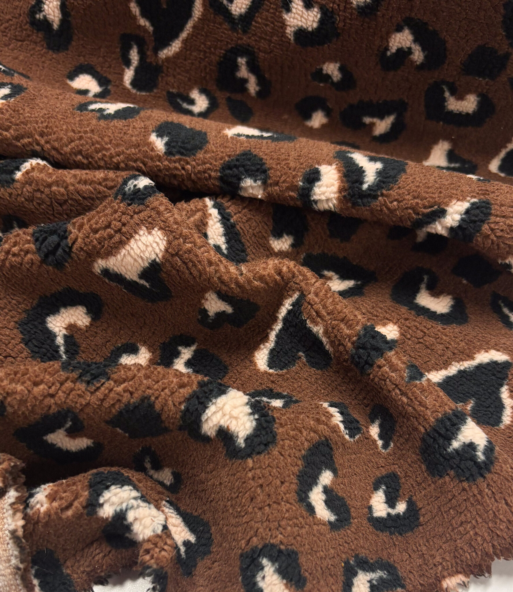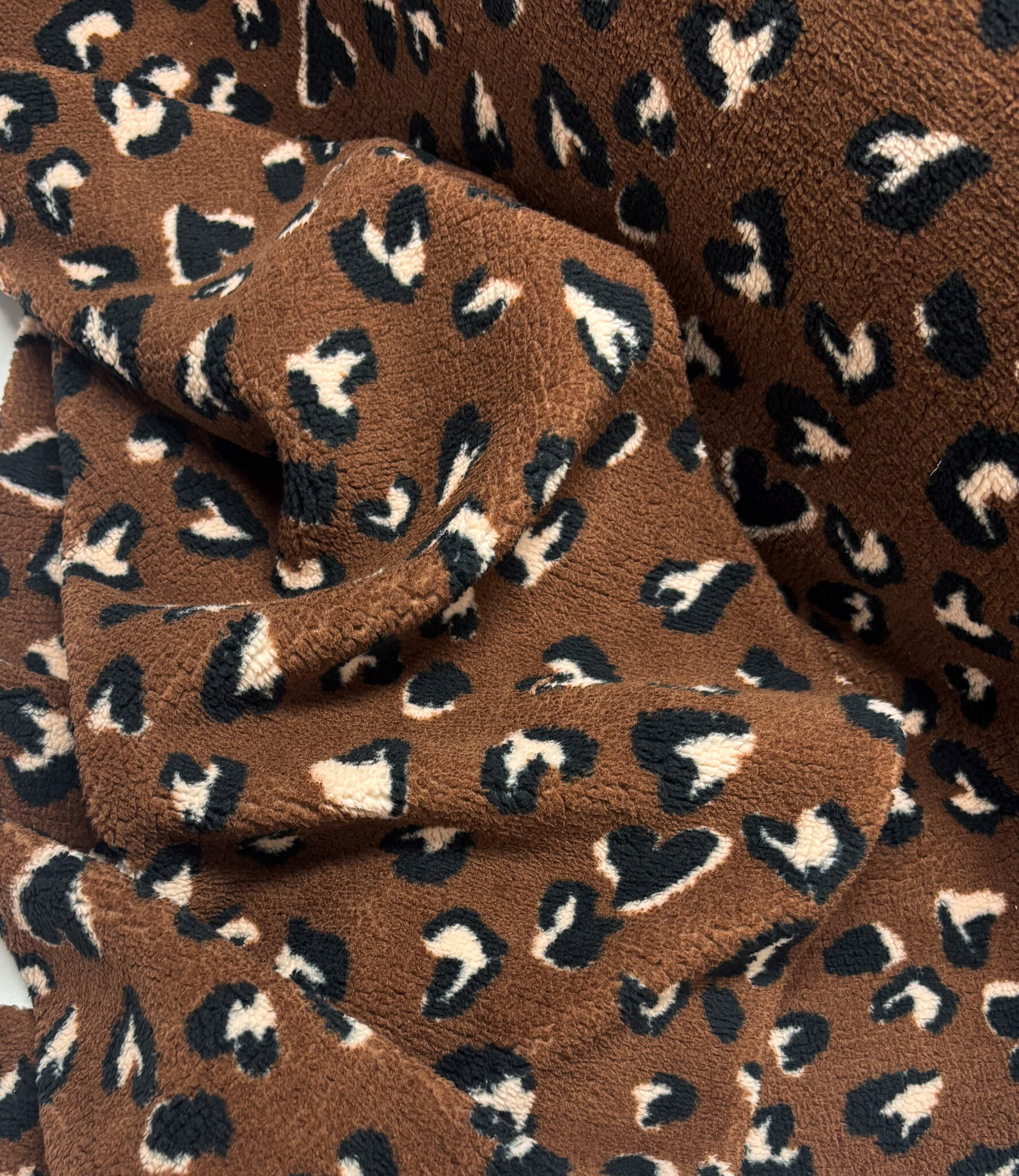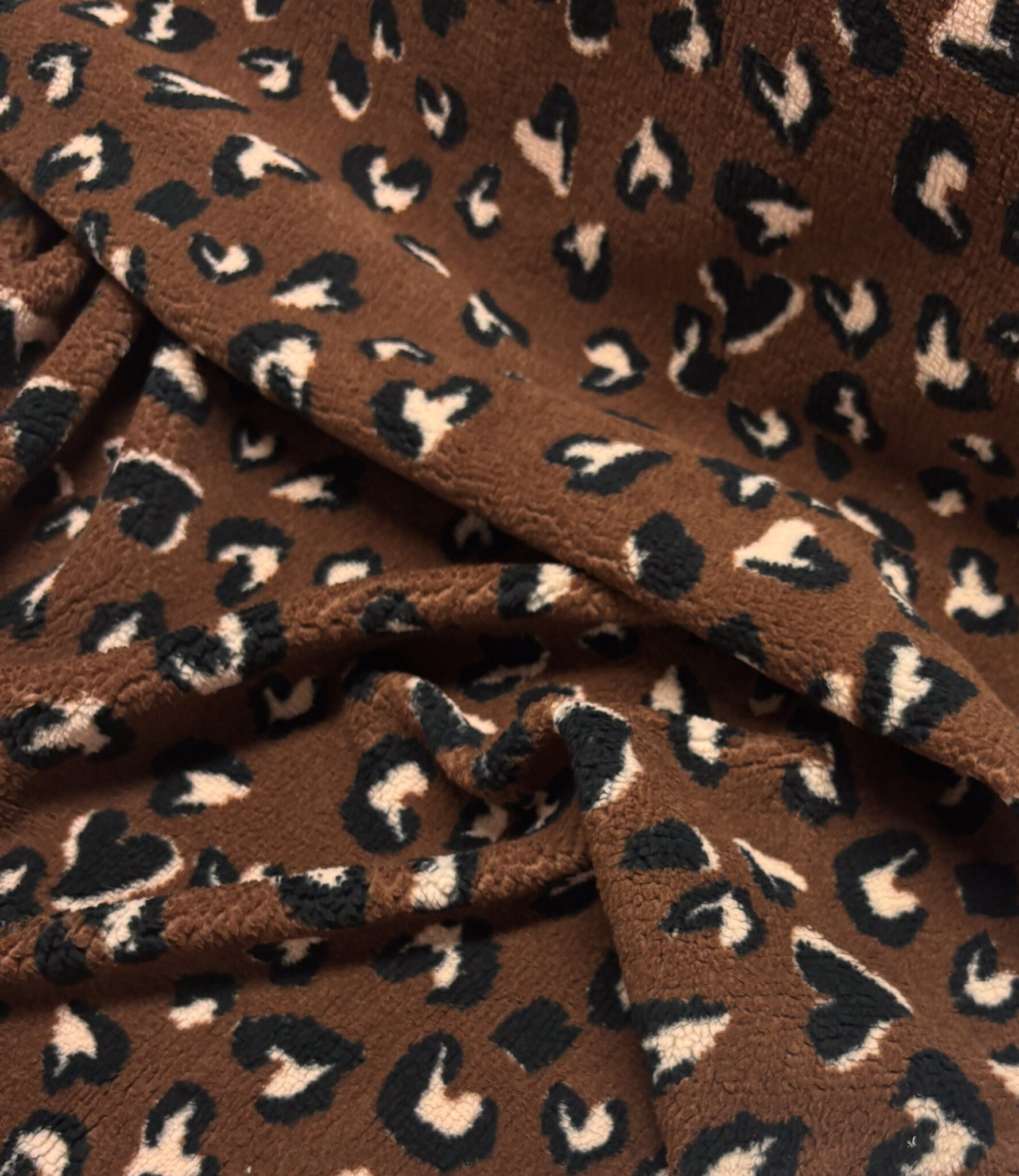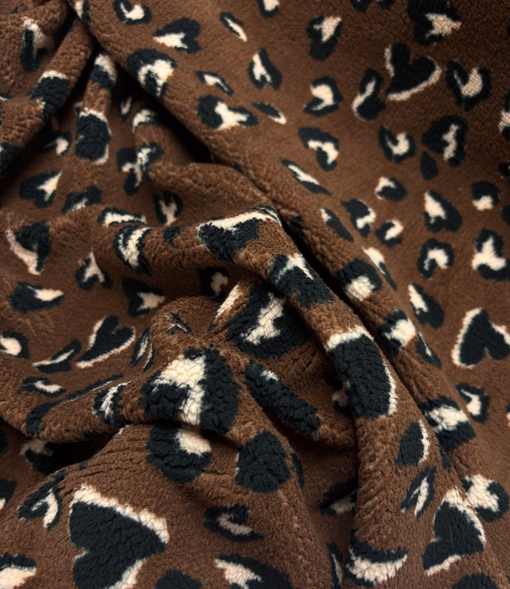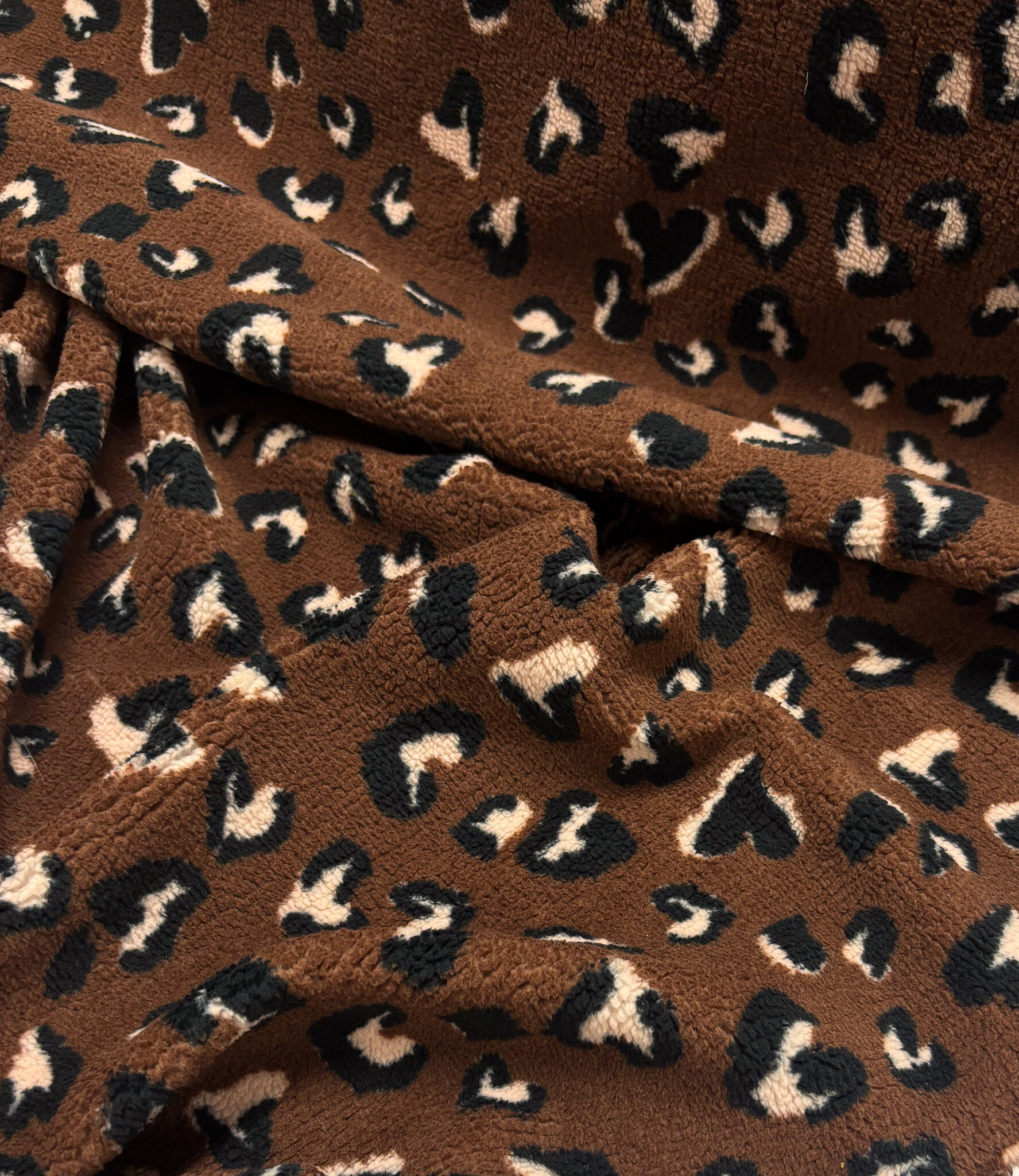 Een zachte sherpa teddy stof met luipaardprint. Perfect voor een Junna vest, maar ook voor warme truien.