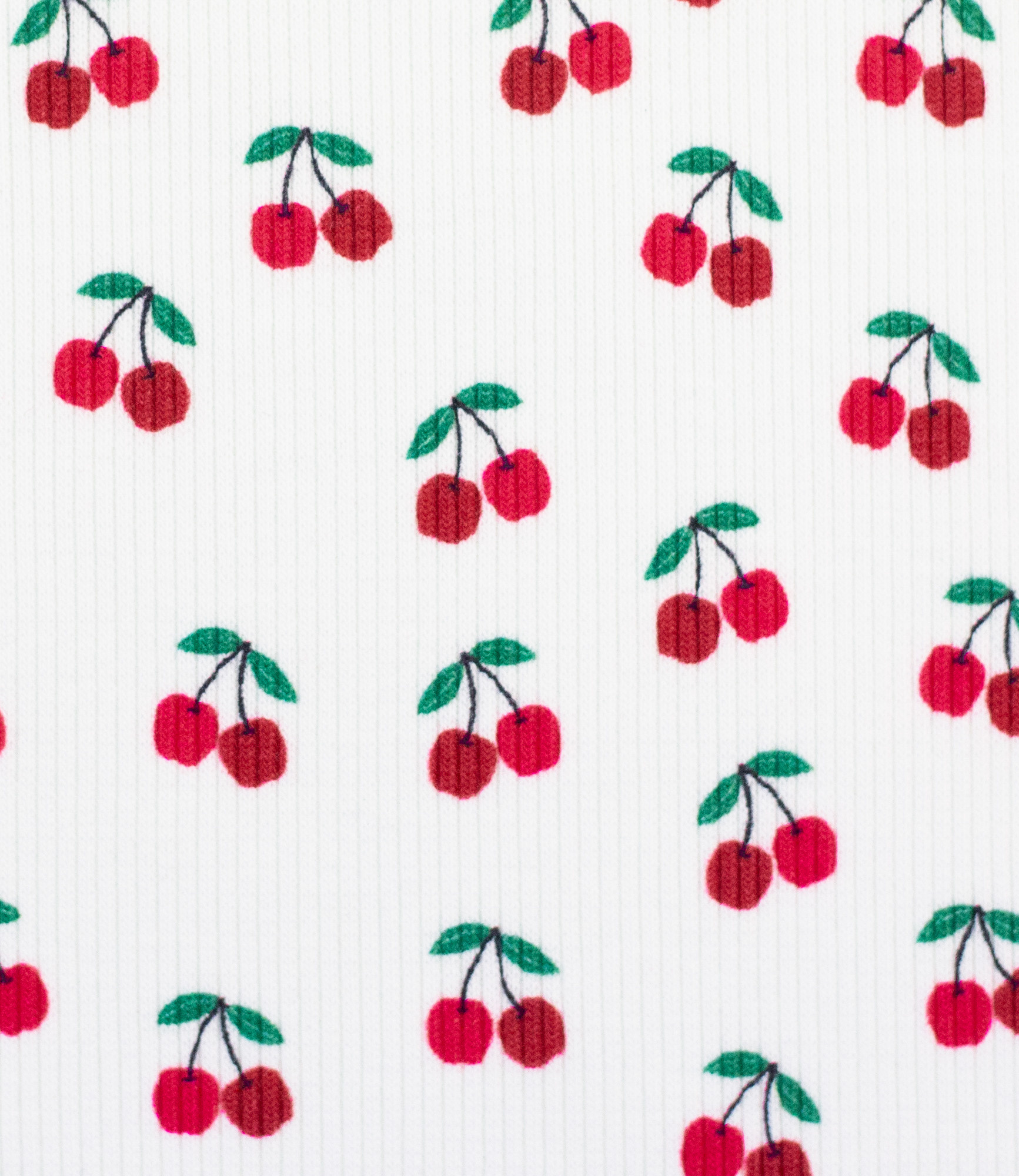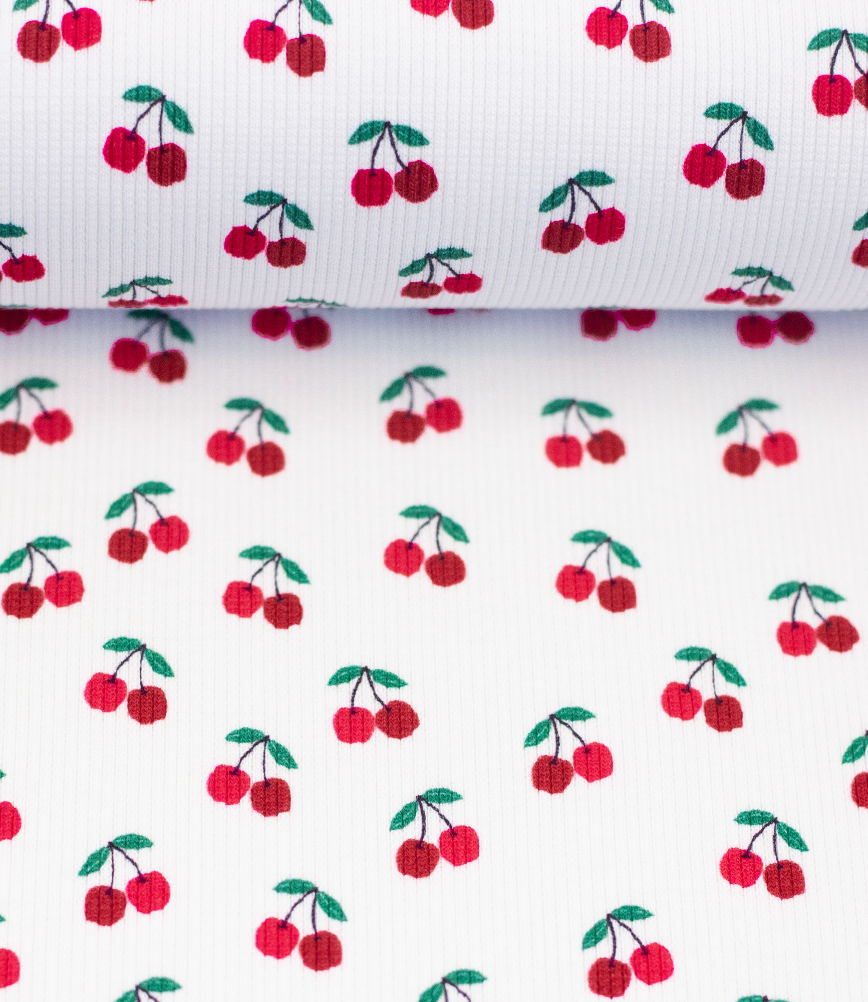 Een geribbelde tricot met kersjes. Swafing stoffe. Supertof voor kinder- en babykleding. OEKO-tex