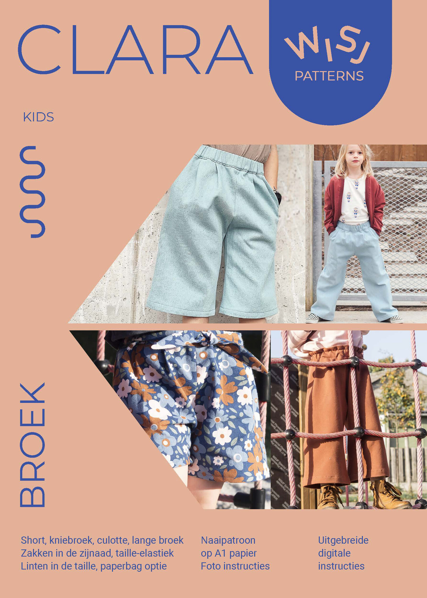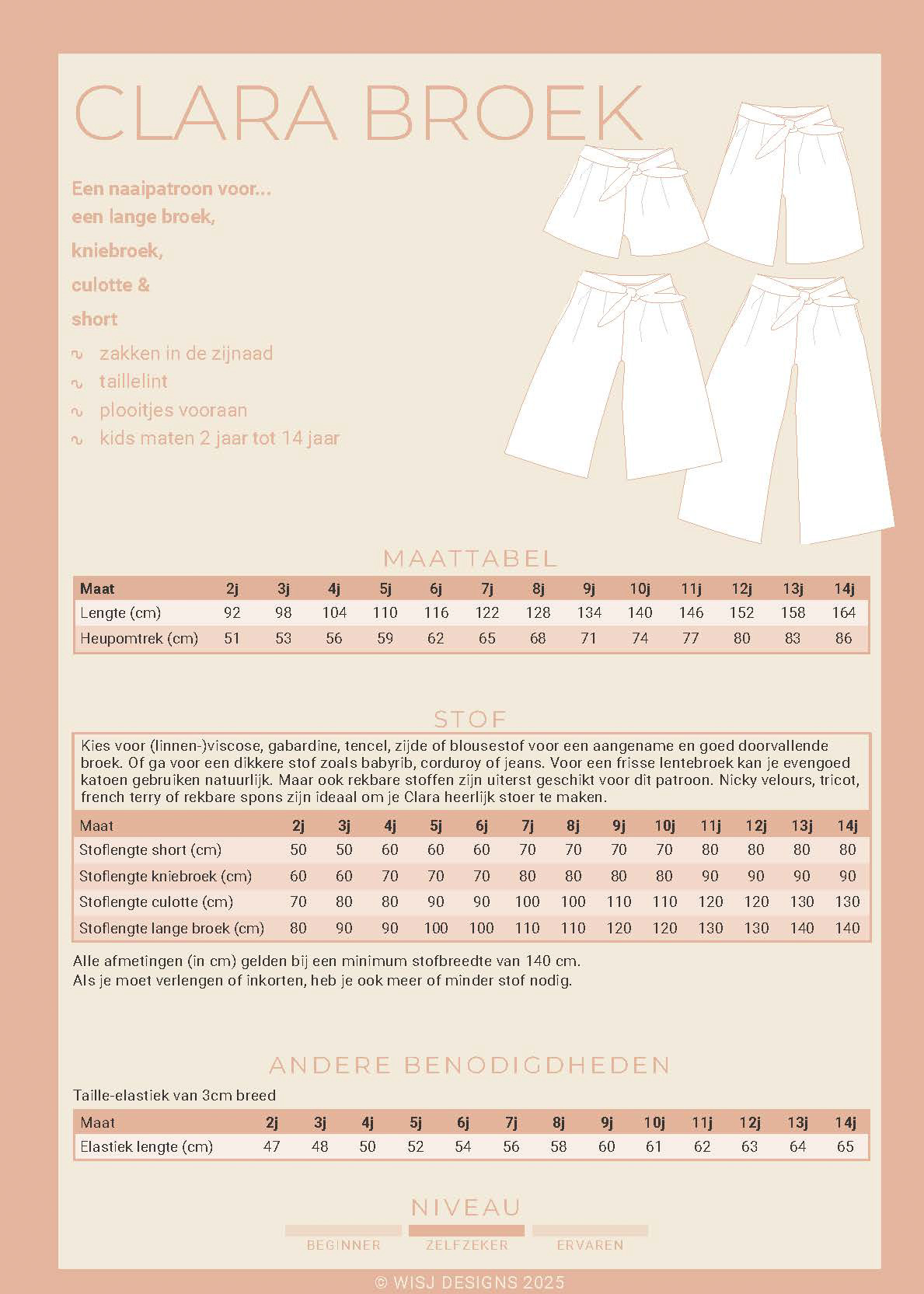 Kies voor (linnen-)viscose, gabardine, tencel, zijde of blousestof voor een aangename en goed doorvallende broek. Of ga voor een dikkere stof zoals babyrib, corduroy of jeans. Voor een frisse lentebroek kan je evengoed katoen gebruiken natuurlijk. Maar ook rekbare stoffen zijn uiterst geschikt voor dit patroon. Nicky velours, tricot, french terry of rekbare spons zijn ideaal om je Clara heerlijk stoer te maken.