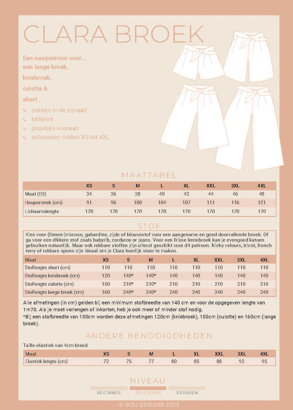 Kies voor (linnen-)viscose, gabardine, tencel, zijde of blousestof voor een aangename en goed doorvallende broek. Of ga voor een dikkere stof zoals babyrib, corduroy of jeans. Voor een frisse lentebroek kan je evengoed katoen gebruiken natuurlijk. Maar ook rekbare stoffen zijn uiterst geschikt voor dit patroon. Nicky velours, tricot, french terry of rekbare spons zijn ideaal om je Clara heerlijk stoer te maken.