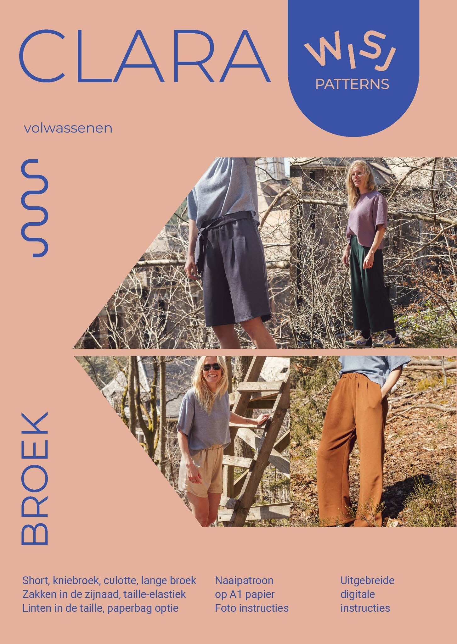 Clara is een wijde broek met plooitjes vooraan, een elastiek in de taille en zakken in de zijnaad. Optioneel kan je linten vastnaaien aan de zijnaad. Ideaal om een buikje te verdoezelen, zo’n knoop vooraan.