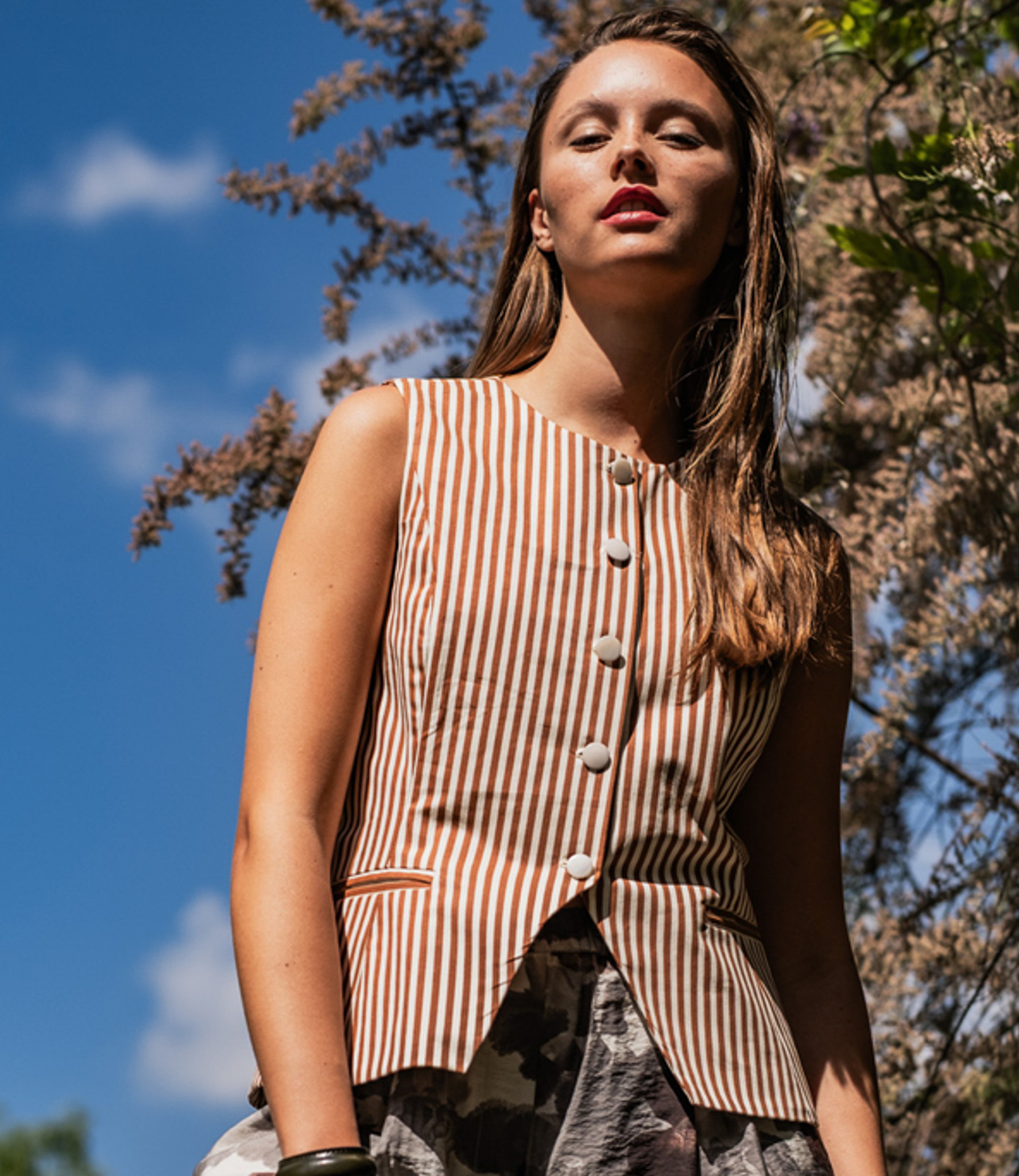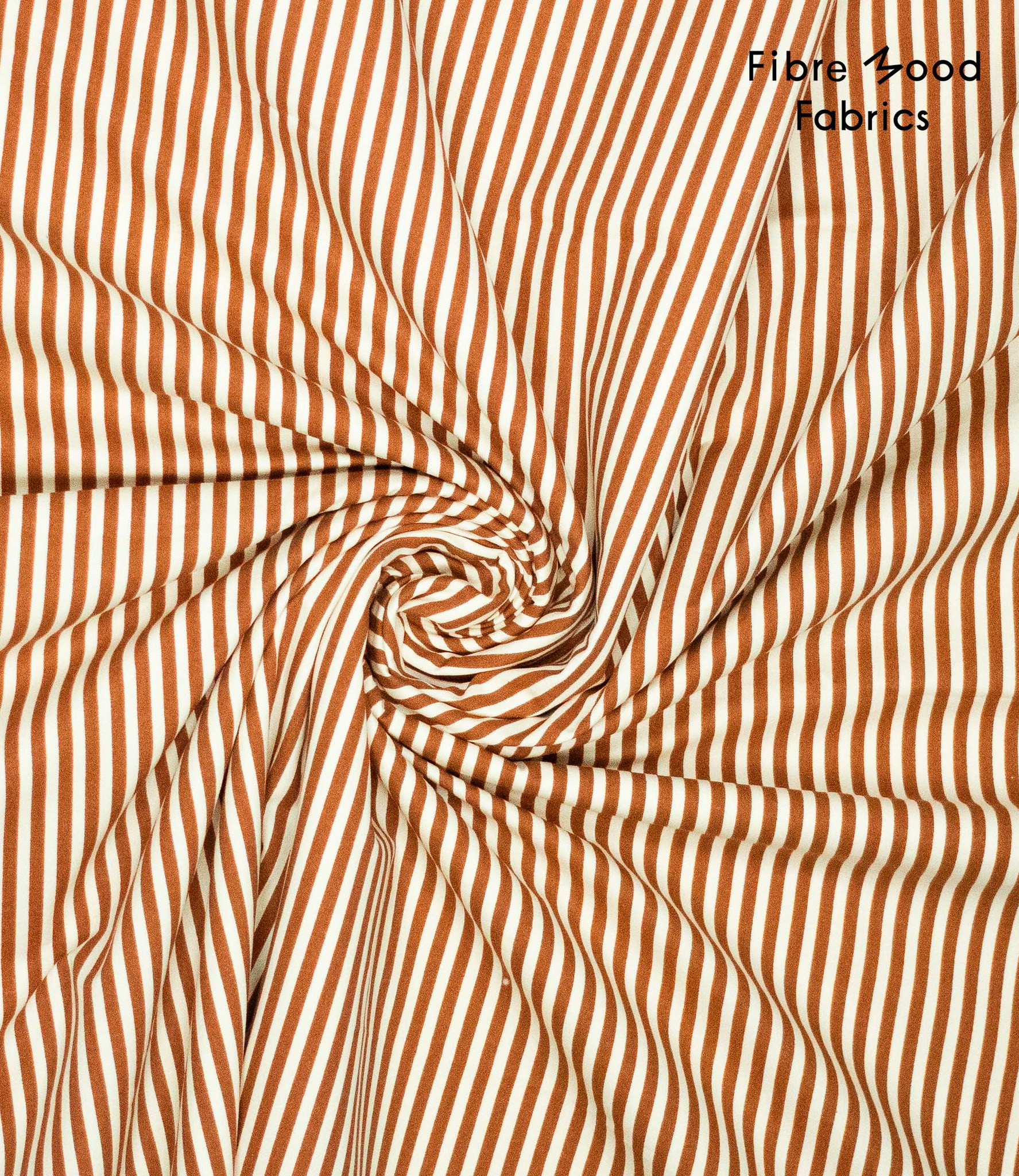 Deze geweven stof in bruin/wit met een klassiek streeppatroon is gemaakt van 100% katoen en heeft een gewicht van 190 g/m² en een breedte van 145 cm. De stof biedt een stevige maar ademende kwaliteit, wat het perfect maakt voor zowel casual als formele kledingstukken. De tijdloze strepen geven de stof een elegante uitstraling, terwijl de natuurlijke katoenvezels zorgen voor comfort en ademend vermogen. Deze stof voldoet aan de OEKO-TEX STANDARD 100-norm, wat betekent dat ze vrij is van schadelijke stoffen en veilig is voor mens en milieu. Ideaal voor blouses, overhemden of rokken.
