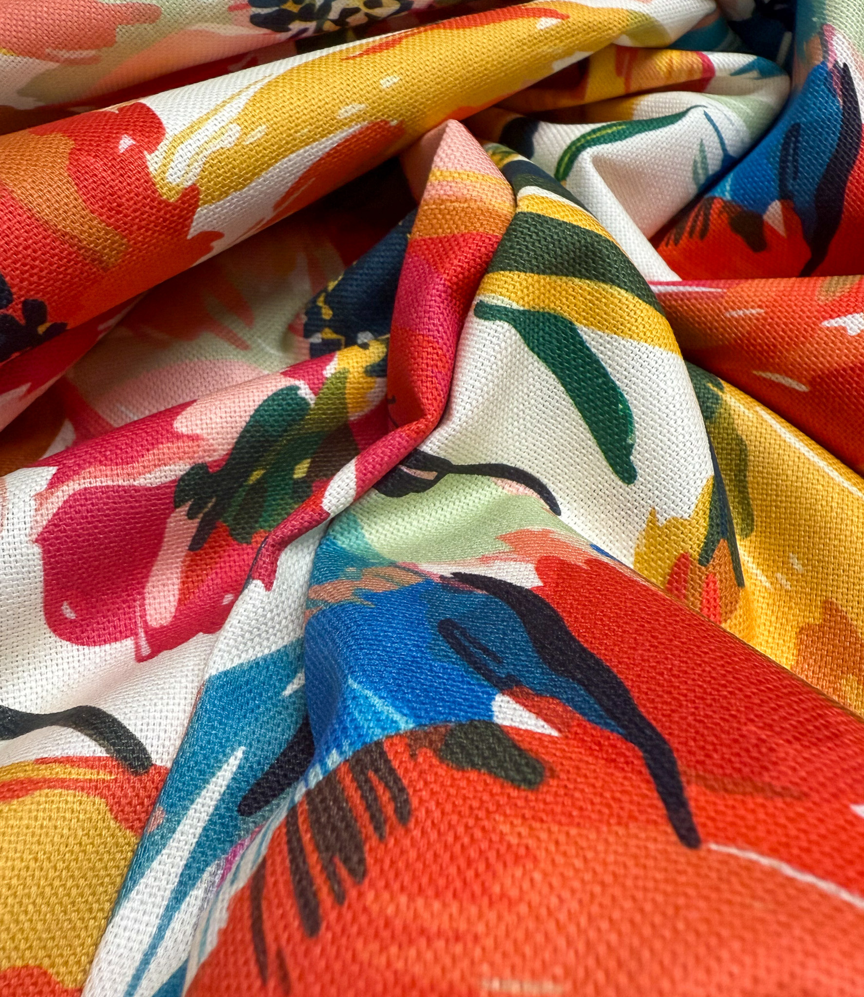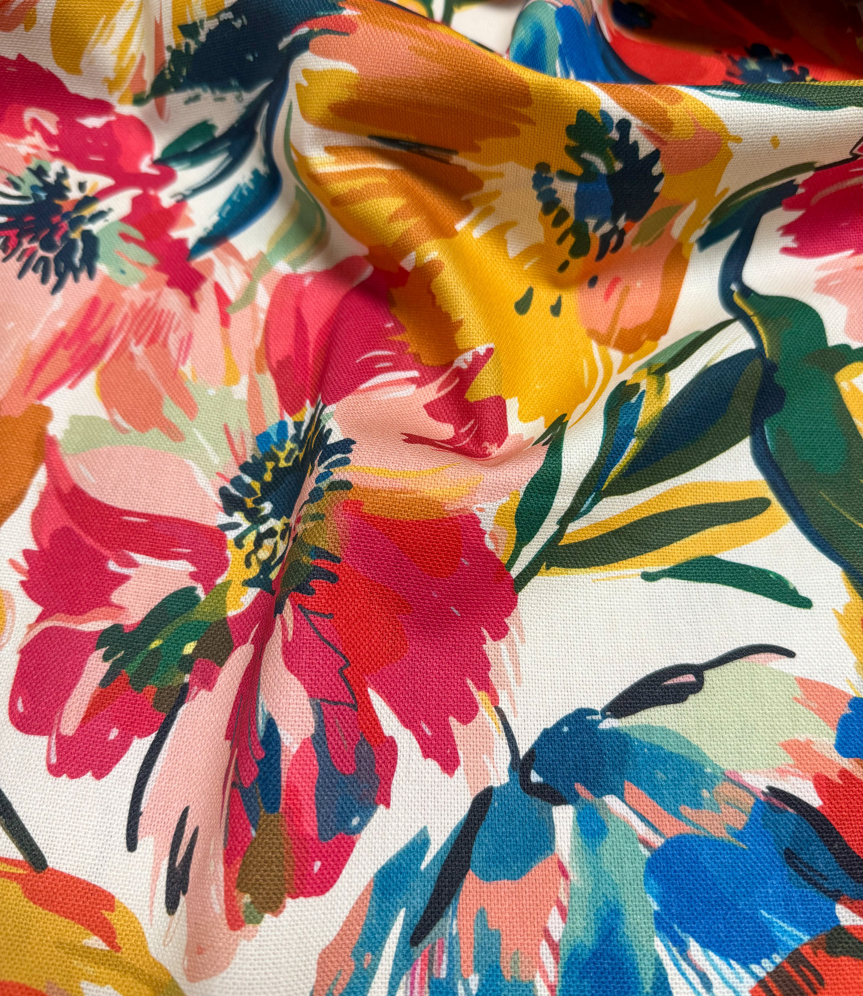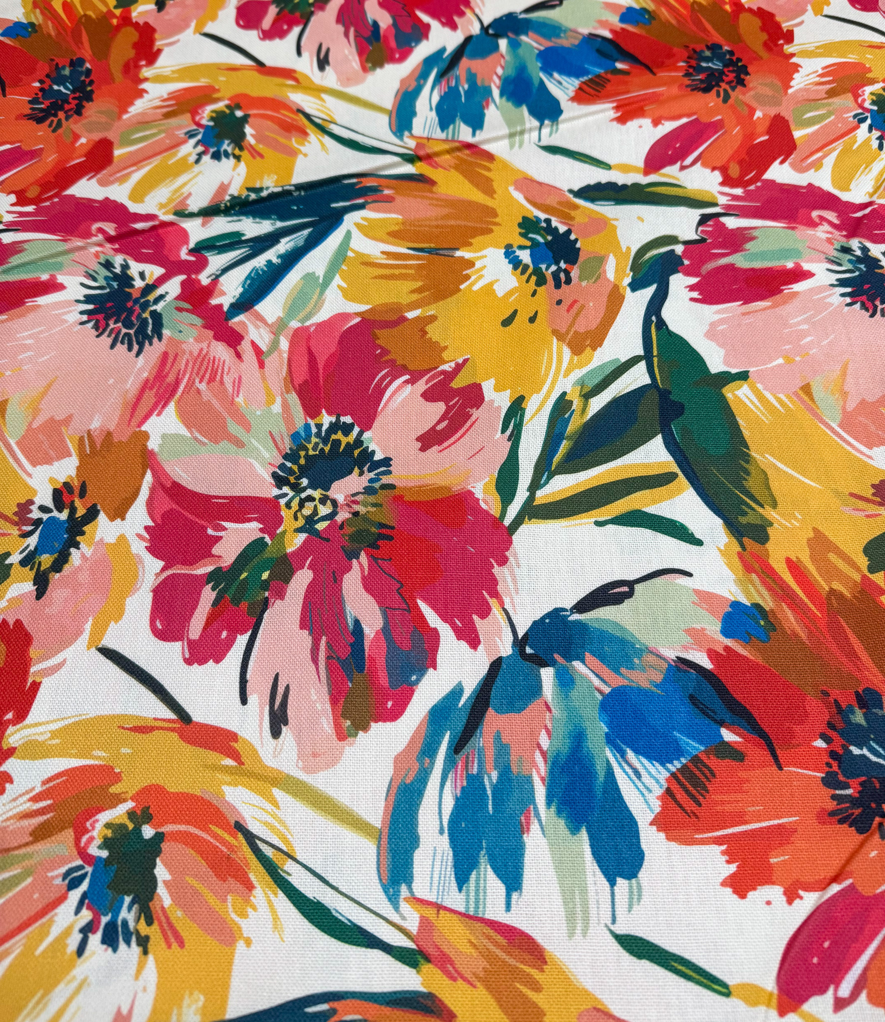 Een soepele en zachte canvas met bloemen in kleuren waar je vrolijk van wordt. Perfect voor schorten, decoratie, kussens, servetten, tafelkleedje,...