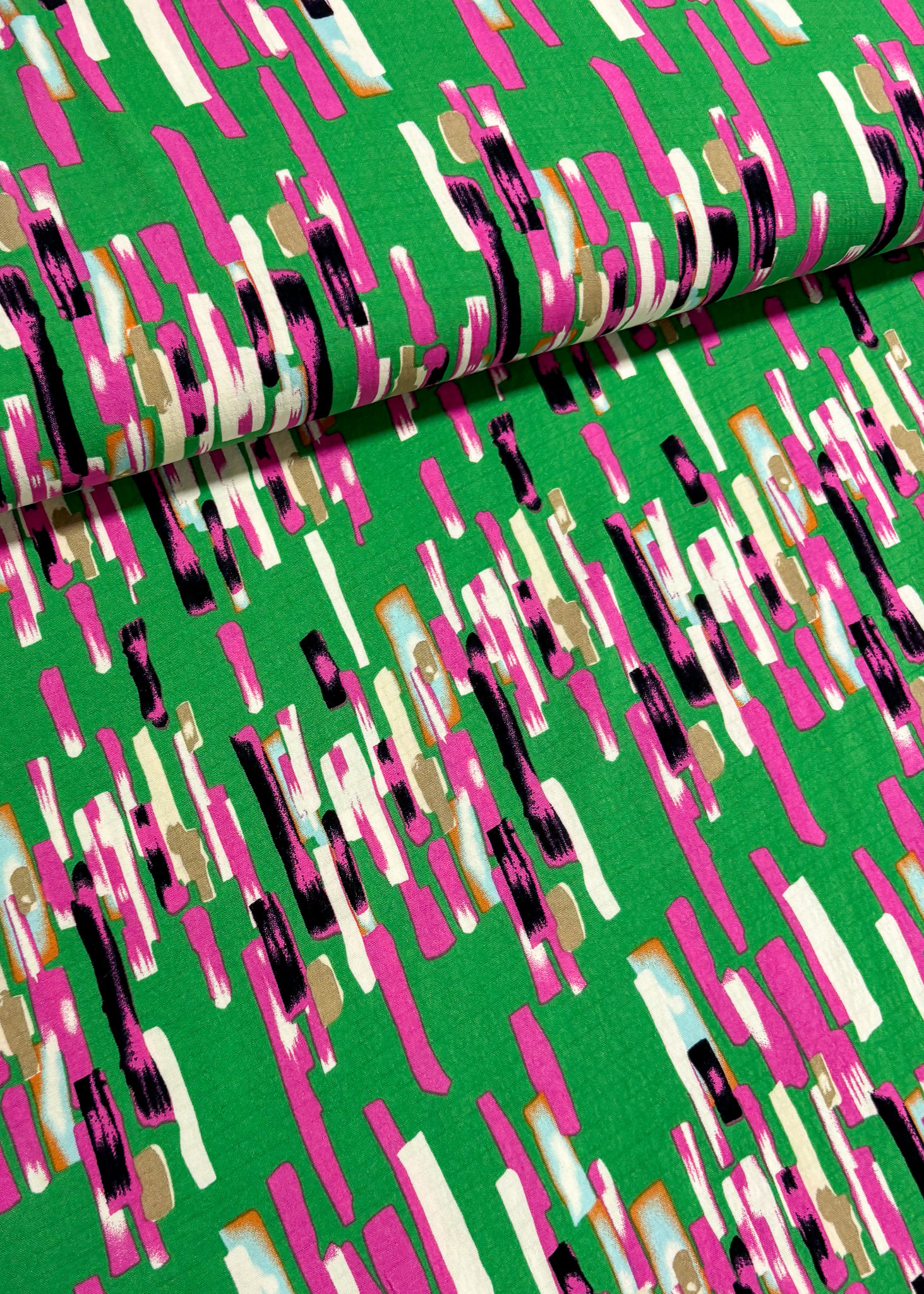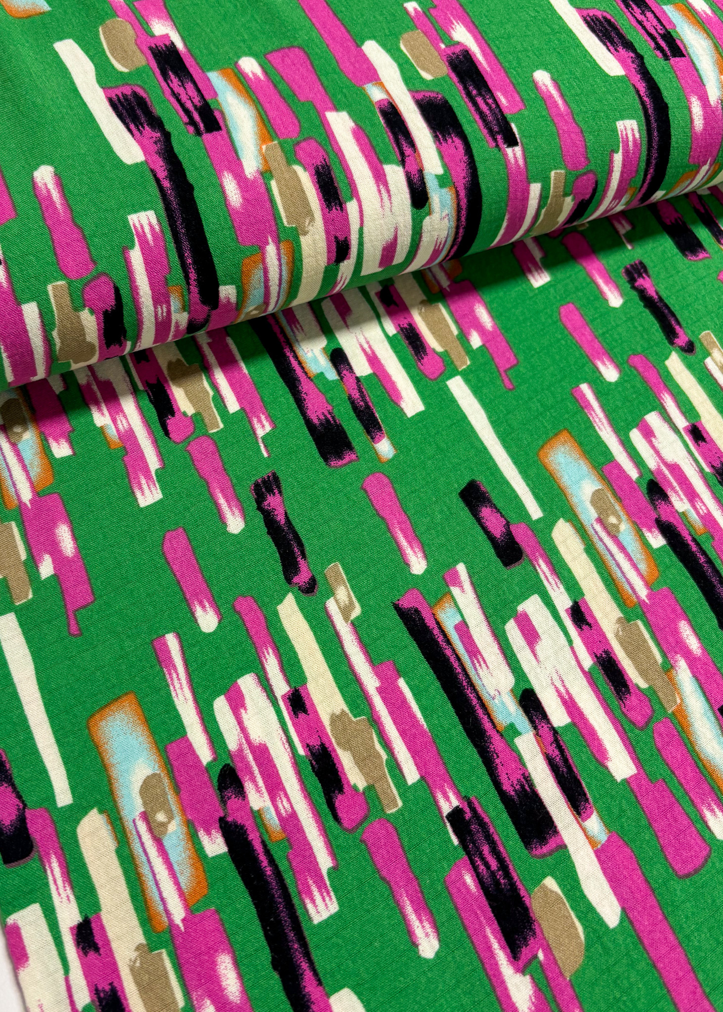 Een soepele geweven viscose met groene print. Geschikt voor jurken, blouses en rokken. Ook geschikt om te gebruiken als voering voor bv. een jurk, rok of jas.