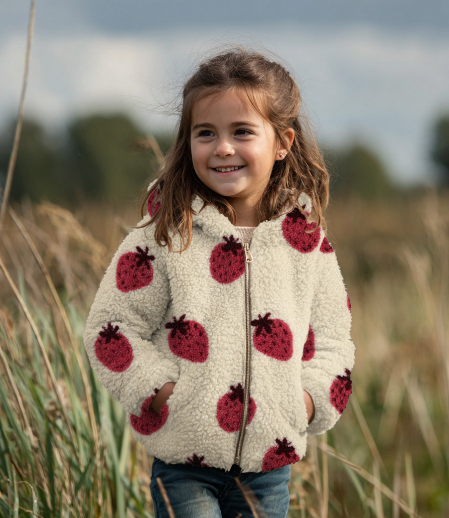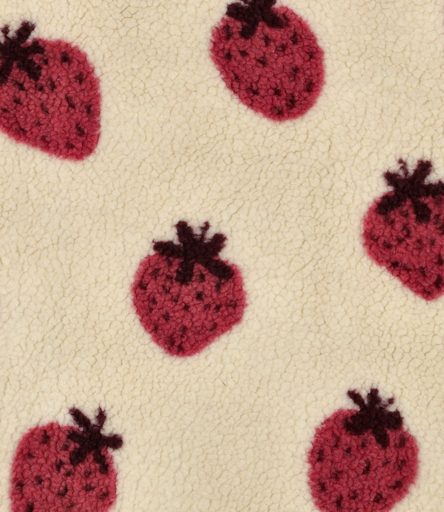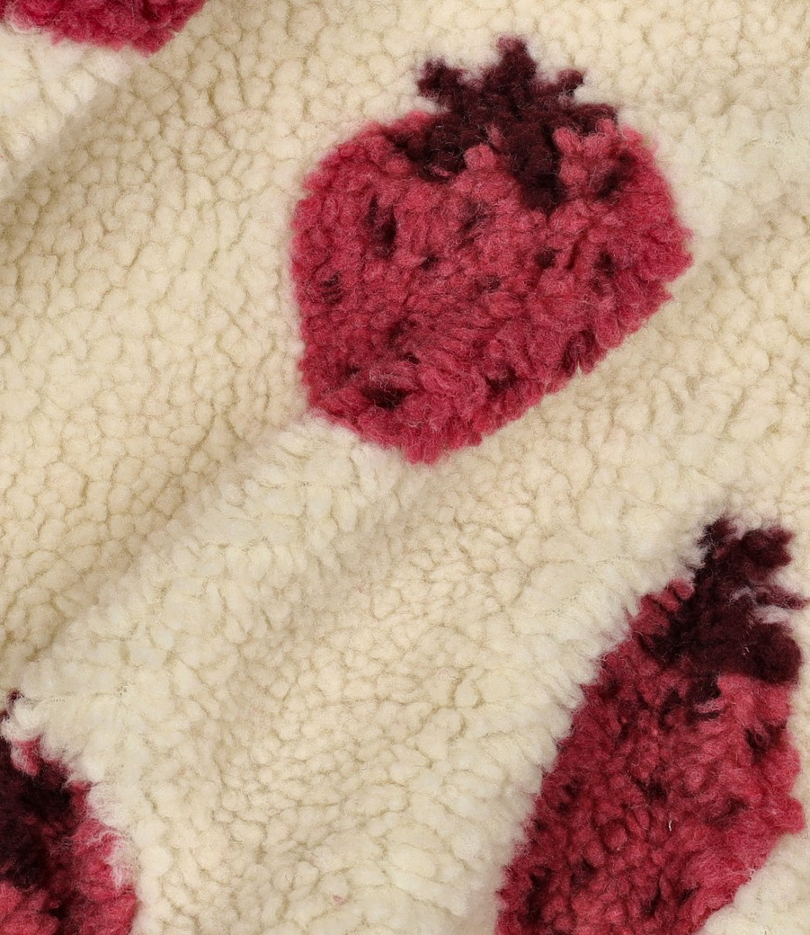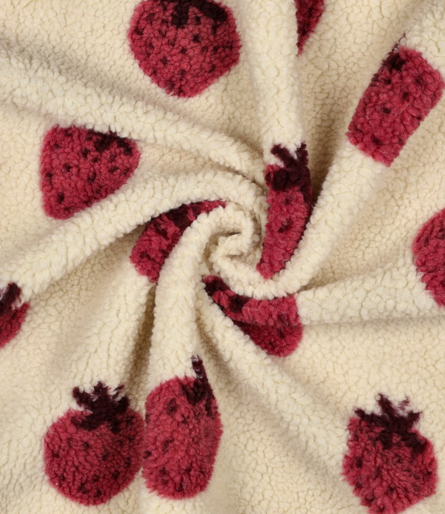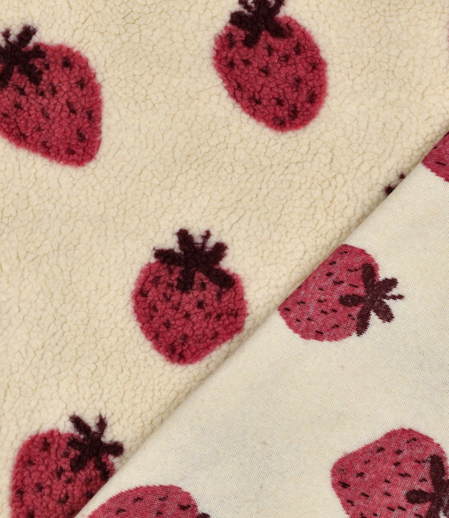 Een zachte sherpa teddy stof met aardbeien. Perfect voor mantel, maar ook voor warme truien.